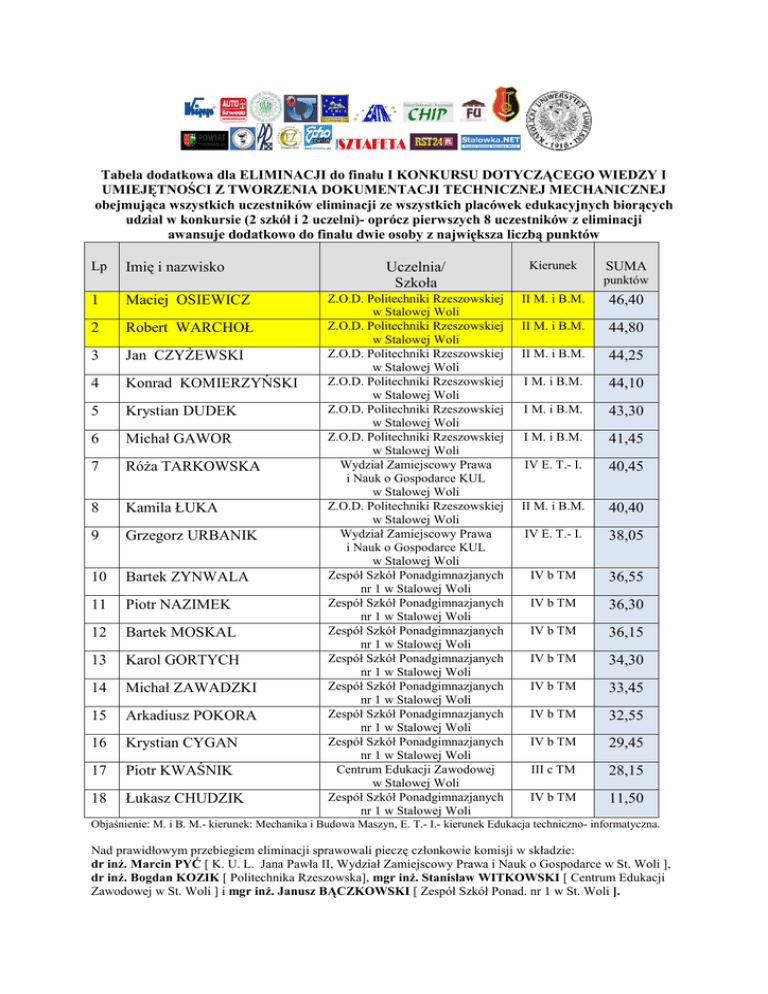 Tabela dodatkowa dla ELIMIINACJI do finału I KONKURSU DOTYCZĄCEGO ĄCEGO WIEDZY I UMIEJĘTNOŚCI Z TWORZENIA TWORZ DOKUMENTACJI TECHNICZNEJ NICZNEJ MECHANICZNEJ obejmująca ca wszystkich uczestników eliminacji ze wszystkich placówek pl wek edukacyjnych biorących bior udział w konkursie (2 szkół i 2 uczelni)uczelni) oprócz pierwszych 8 uczestnikó ników z eliminacji awansuje dodatkoowo do finału dwie osoby z największa liczbąą punktów Lp Imię i nazwisko 1 Maciej OSIEWICZ 2 Robert WARCHOŁ 3 Jan CZYŻEWSKI 4 Konrad KOMIERZYŃSKI ŃSKI 5 Krystian DUDEK 6 Michał GAWOR 7 Róża TARKOWSKA 8 Kamila ŁUKA 9 Grzegorz URBANIK 10 Bartek ZYNWALA 11 Piotr NAZIMEK 12 Bartek MOSKAL 13 Karol GORTYCH 14 Michał ZAWADZKI 15 Arkadiusz POKORA 16 Krystian CYGAN 17 Piotr KWAŚNIK 18 Łukasz CHUDZIK Uczelnia/ Szkoła Kierunek Z.O.D. Politechniki Rzeszowskiej w Stalowej Woli Z.O.D. Politechniki Rzeszowskiej w Stalowej Woli Z.O.D. Politechniki Rzeszowskiej w Stalowej Woli Z.O.D. Politechniki Rzeszowskiej w Stalowej Woli Z.O.D. Politechniki Rzeszowskiej w Stalowej Woli Z.O.D. Politechniki Rzeszowskiej w Stalowej Woli Wydział Zamiejscowy Prawa i Nauk o Gospodarce KUL w Stalowej Woli Z.O.D. Politechniki Rzeszowskiej w Stalowej Woli Wydział Zamiejscowy Prawa i Nauk o Gospodarce KUL w Stalowej Woli Zespół Szkół Ponadgimnazjanych nr 1 w Stalowej Woli Zespół Szkół Ponadgimnazjanych nr 1 w Stalowej Woli Zespół Szkół Ponadgimnazjanych nr 1 w Stalowej Woli Zespół Szkół Ponadgimnazjanych nr 1 w Stalowej Woli Zespół Szkół Ponadgimnazjanych nr 1 w Stalowej Woli Zespół Szkół Ponadgimnazjanych nr 1 w Stalowej Woli Zespół Szkół Ponadgimnazjanych nr 1 w Stalowej Woli Centrum Edukacji Zawodowej w Stalowej Woli Zespół Szkół Ponadgimnazjanych nr 1 w Stalowej Woli II M. i B.M. 46,40 II M. i B.M. 44,80 II M. i B.M. 44,25 I M. i B.M. 44,10 I M. i B.M. 43,30 I M. i B.M. 41,45 IV E. T.T. I. 40,45 II M. i B.M. 40,40 IV E. T.T. I. 38,05 IV b TM 36,55 IV b TM 36,30 IV b TM 36,15 IV b TM 34,30 IV b TM 33,45 IV b TM 32,55 IV b TM 29,45 III c TM 28,15 IV b TM 11,50 SUMA punktów Objaśnienie: M. i B. M.- kierunek: Mechanika i Budowa Maszyn, E. T.- I.- kierunek Edukacja technicznotechniczno informatyczna. Nad prawidłowym przebiegiem eliminacji sprawowali pieczę piecz członkowie komisji w składzie: dzie: dr inż. Marcin PYĆ [ K. U. L. Jana Pawła II, Wydział Zamiejscowy Prawa i Nauk o Gospodarce w St. Woli ], dr inż. Bogdan KOZIK [ Politechnika Rzeszowska], Rzeszowska mgr inż. Stanisław WITKOWSKI [ Centrum Edukacji Zawodowej w St. Woli ] i mgr inż. ż. Janusz BĄCZKOWSKI B [ Zespół Szkół Ponad. nr 1 w St. St Woli ].