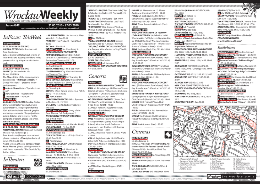WrocławWeekly Free City Guide to Events, Music, Film, Theatre, Museum, Pubs & More Issue #249 21.05.2010 - 27.05.2010 > get more online: www.WroclawWeekly.pl > [email protected] InFocus: ThisWeek Intermedia Art 21.05.2010 - 18:00 (Friday) Galeria ENTROPIA (ul.Rzeźnicza 4) Free Admission Łukasz Guzek will talk about origins of intermedia art, accompanied by a video presentation by Małgorzata Kazimierczak. Dance Vibrations 21.05.2010 - 19:00 (Friday) IMPART (ul. Mazowiecka 17) Ticket: 25/20PLN The May edition of the contemporary dance series - “Wibracje Taneczne / Dance Vibrations” - presents 3 new performances: > Izabela Chlewińska – “Ophelia is not Dead” > Irena Lipińska - “hydrohypno” > Tomasz Bazan - “HSUCIA” SIMCHA XII 23.05.2010-28.05.2010 (Sunday-Friday) SIMCHA is Wrocław’s annual Jewish culture festival. The program for this 12th edition includes dance & graphic workshops, concerts, film projections, public debates and lectures. For the complete program, please see: www. simcha.art.pl (PL) The Crucible (Work-In-Progress) 25 & 26.05.2010 - 19:00 (Tue & Wed) Pieśń Kozła Theatre (Song of the Goat Theatre / ul. Purkyniego 1) Free Admission (Require reservation / please contact at [email protected], or tel. (71) 346 08 13) Award-winning theatre company Pieśń Kozła Theatre gives a public preview for their latest spectacle: “The Crucible" by Arthur Miller. InTheaters Współczesny (Contemporary) Theatre (ul. Rzeźnicza 12) ...np Majakowski (...for instance, Mayakovsky) - Fri-Sun 19:15 Produkt (The Product) - Tue & Wed 20:00 Bat Yam - Thu 19:15 Polski Theatre (ul. Zapolskiej 3) “Niewiarygodne Przygody M. Koziołkiewicza (Incredible Adventures of M. Koziołkiewicz)" by Wrocław Pantomime Theatre - Fri 11:00 Polski Theatre / Kameralna (ul. Świdnicka 28) Berek Joselewicz - Fri & Sat 19:00 “Gastronomia" by Wrocław Pantomime Theatre - Thu 19:00 Komedia Theatre (pl. Teatralny 4) Życie szkodzi zdrowiu (It Can Damage Your Health) - Sat 21:00; Sun 17:00 Lalek (Puppet) Theatre (pl. Teatralny 4) Sło (The life of Juliusz Słowacki, a Polish poet) - Fri & Sat 19:00 >> For Children: Co w trawie piszczy? (What Squeaks In The Grass?) - Fri 9:30 Och, Emil - Sat 15:00; Sun 11:00; TueThu 9:30 Pieśń Kozła Theatre (Song of the Goat Theatre / ul. Purkyniego 1) The Crucible [Work-In-Progress] Tue & Wed 19:00 Ad Spectatores (Browar Mieszczański, ul. Hubska 44-48) Wielkie Żarcie - Fri-Sun 20:00 CAPITOL Musical Theatre (ul. Piłsudskiego 67) Dzieje grzechu (Acts of Sin) - Fri & Sat 18:00; Sun 17:00 >> For Children: Mała Księżniczka (A Little Princess) Wed & Thu 10:30 ARKA Theatre (ul. Mennicza 3) Kamienie na szaniec (Forbidden Songs) - Fri 19:00; Tue & Wed 10:00 Nieodwracalne (Irréversible) - Sat 19:00 Oskar i Pani Róża (Oscar et la dame rose) - Thu 10:00 OPERA Wrocławska (ul. Świdnicka 35) “Jezioro łabędzie (The Swan Lake)" by P. Tchaikovsky [ballet: CD Playback] - Fri & Wed 19:00 “Halka" by S. Moniuszko - Sat 19:00 “Raj utracony (Paradise Lost)" by K. Penderecki - Sun 17:00 “Don Kichot (Don Quixote)" by L. A. Minkus [ballet: CD playback] - Tue 19:00 “Cosi fan tutte" by W. A. Mozart - Thu 19:00 >> For Children: “Alicja w Krainie Czarów (Alice in Wonderland)" by R. Chauls - Fri 11:00 “Sid, wąż, który chciał śpiewać (Sid the Serpent Who Wanted to Sing)" by M. Fox - Tue 11:00 STUDIO NA GROBLI (ul. Na Grobli 30/32) Teatr ZAR - Thu 20:00 KALAMBUR (ul. Kuźnicza 29a) Niezależna Manufaktura Taneczna: 44 - Sun 20:00 Concerts Friday 21st WROCŁAW PHILHARMONIC CONCERT HALL (ul. Piłsudskiego 19) Martino Tirimo (piano), Wrocław Philharmonic Orchestra - program: F. Chopin/D. Szostakowicz (Classical: 40/25PLN) - 19:00 OD ZMIERZCHU DO ŚWITU (“From Dusk Till Dawn" / ul. Krupnicza 15) Terminal (Prog-Rock: 15PLN) - 19:30 ALIVE (ul. Kolejowa 12) [Jam Session] Birma Blue Band (Free) - 20:00 Saturday 22nd WROCŁAW PHILHARMONIC CONCERT HALL Aleksandra Pawłowska (violin), Katarzyna Wrona (cello), Natalia Figiel (piano), Wrocław Youth Orchestra program: L. van Beethoven/J. Brahms (Classical: Free) - 18:00 ALIVE Za Fcześnie Fstałem (Blues: 7PLN) - 20:00 CRK (ul. Jagiellończyka 10c/d) The Catalyst (US), Asbestos In Osbestrics (DE), Don’t Fuck My Brain (Hardcore/Grunge: 12PLN) - 21:00 IMPART (ul. Mazowiecka 17) Alosza Awdiejew (Classical: 70PLN) - 19:00 FIRLEJ (ul. Grabiszyńska 56) [SingerSongwriting] Sophia (GB) (Alternative/ Indie/Pop: 15PLN) - 20:00 ALIVE Three Acoustic & Friends (Free) - 21:00 Tuesday 25th WROCŁAW UNIVERSITY OF TECHNOLOGY AUDITORIUM (Aula Politechniki Wrocławskiej / ul Wybrzeże Wyspiańskiego 27) [LEO Festival] Wrocław Chamber Orchestra “Leopoldinum" - “Architecture & Music" (Classical: Free) - 20:00 ALIVE Jupiteur (Rock/Pop: 3PLN) - 20:00 Wednesday 26th WROCŁAW PHILHARMONIC CONCERT HALL [Philharmonic for Children] “Holiday Soundscapes" (Classical: 10/5/2PLN) - 9:00, 11:00 OD ZMIERZCHU DO ŚWITU (“From Dusk Till Dawn") Crimson Valley (Heavy/Power Metal: Free) - 21:00 ALIBI (ul. Grunwaldzka 67) Deadly Hunta (GB) (Hip-Hop: 7PLN) - 21:00 Thursday 27th WROCŁAW PHILHARMONIC CONCERT HALL [Philharmonic for Children] “Holiday Soundscapes" (Classical: 10/5/2PLN) - 9:00, 11:00 SYNAGOGUE “UNDER A WHITE STORK" (Synagoga Pod Białym Bocianem) [SIMCHA] Cukunft (Jewish: 20/15PLN) - 19:00 IMPART [LEO Festival] “Brundibár: Children Opera" (Classical: 30/20/10PLN) - 19:00 FIRLEJ Sieben (GB) + Job Karma (Industrial: 30/20PLN) - 20:00 ŁYKEND (ul. Podwale 37/38) Mirosław “Koval" Kowalewski (Shanty: 15/10PLN) pl. Jana Pawła II - 20:00 ALIVE Krak & Jomm (Free) - 20:00 Cinemas MLECZARNIA (ul. Włodkowica 5) [SIMCHA] Projection of Films from the 7th International Film Festival “Jewish Motifs" Sunday 23rd (Warsaw 2010) - Sun & Mon 17:00; Tue SYNAGOGUE “UNDER A WHITE STORK" 16:00; Wed 17:00 /Free (Synagoga Pod Białym Bocianem / ul. WARSZAWA: NOT (ul.Piłsudskiego 74) Włodkowica 7) [SIMCHA] Veszprémer The Cove (US) 16:30 Kl