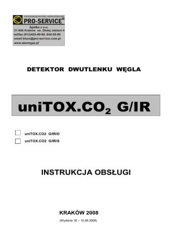 DETEKTOR DWUTLENKU WĘGLA uniTOX.CO2 G/IR uniTOX.CO2 G/IR/D uniTOX.CO2 G/IR/S INSTRUKCJA OBSŁUGI KRAKÓW 2008 (Wydanie 1E – 12.09.2008) Spis treści : I. II. III. IV. V. VI. Przeznaczenie Podstawowe parametry techniczne Opis funkcjonalny 1. Płyta czołowa 2. Listwa zaciskowa Połączenie głowicy z jednostkami centralnymi 1. Wykorzystanie wyjść detekcyjnych 2. Połączenie strefowe 3. Wykorzystanie wyjścia prądowego 4…20mA Instalacja głowicy 1. Kable połączeniowe 2. Zasady montażu Uwagi i zalecenia eksploatacyjne 1. Kontrola okresowa działania głowicy 2. Kontrola kalibracji 3. Wpływ czynników zakłócających 2 - str. 3 - str. 3 - str. 4 - str. 4 - str. 4 - str. 6 - str. 6 - str. 6 - str. 7 - str. 8 - str. 8 - str. 9 - str. 9 - str. 9 - str. 10 - str. 10 I. PRZEZNACZENIE DETEKTOR DWUTLENKU WĘGLA „uniTOX.CO2 G/IR” przeznaczony jest do ciągłej ochrony pomieszczeń zagrożonych emisją dwutlenku węgla. Detektor zaopatrzony jest w selektywny sensor typu infrared nowej generacji o żywotności powyżej 5 lat. Pomiar stężenia gazu oparty o zasadę tłumienia światła podczerwonego w obecności dwutlenku węgla. Detektor „uniTOX.CO2 G/IR” jest przeznaczony do współpracy z typowymi centralkami alarmowymi lub sterownikami o wejściach dwustanowych lub prądowych 4…20mA np EXter 4z, uniSTER 8z, PAG8(P) firmy ProService. Typowe zastosowania detektora „uniTOX.CO2 G/IR” : - przemysł przetwórstwa spożywczego (np. browary) - kontrola jakości powietrza - obiekty przemysłowe, w których istnieje niebezpieczeństwo emisji dwutlenku węgla podczas procesów technologicznych II. PODSTAWOWE PARAMETRY TECHNICZNE : 1. Napięcie zasilania: nominalne 12 V DC, dopuszczalne 10 – 15 V DC 2. Pobór prądu: maks. 120 mA 3. Kontrola zasilania modułu – optyczna (zielona dioda LED „ PRACA” na płycie czołowej) 4. Metoda pomiaru – ciągła, tłumienie światła podczerwonego w obecności CO2 5. Rodzaj sensora: infrared (zasada działania oparta o tłumienie światła podczerwonego w obecności CO2) 6. Czas życia sensora – średnio 5 lat 7. Czas reakcji (T90) – ≤ 30 sek. 8. Zakresy pomiarowe – podano w Ateście Kalibracyjnym. Typowo : 0,05 ... 5 %V/V 9. Rozdzielczość pomiarowa – 0,05%V/V 9. Progi alarmowe – podano w Ateście Kalibracyjnym. Standardowo : - I próg alarmowy – 0,5%V/V - II próg alarmowy – 1,5%V/V 10. Wyjścia sygnału alarmowego: - wyjścia detekcyjne: dwa wyjścia sygnalizujące przekroczenie progów alarmowych, wyjścia typu OC – NC (standardowo) lub OC –NO (opcja). Zmiana typu wyjścia może nastąpić na etapie produkcji detektora - wyjście prądowe 4...20mA : ciągłe 4...20mA (standardowo) lub 4/8/12mA. Zmiana typu wyjścia może nastąpić na etapie produkcji detektora 11. Sygnalizacja przekroczenia progów alarmowych – optyczna (czerwona dioda LED „ALARM” na płycie czołowej). 12. Sygnalizacja stanów awaryjnych – uszkodzenie sensora (czerwona dioda LED „AWARIA” na płycie czołowej) 13. Wpusty kablowy (dławice) – 1 x PG 11 + 1 x PG11 („zaślepiony” otwór -pod dławicę) 14. Klimatyczne warunki pracy: -temperatura pracy: - 20 do + 50 oC -wilgotność: 10... 90 % bez kondensacji pary 15. Obudowa: stopień ochrony- IP54, mocowanie czteropunktowe. 16. Waga : 215g 17. Wymiary: wysokość x szerokość x głębokość : 108mm x 122mm x 60mm (z dławicą ) 18. Wersje detektora : - uniTOX.CO2 G/IR/D - detektor z czujnikiem infrared, wyjścia detekcyjne NO lub NC - uniTOX.CO2 G/IR/S - detektor z czujnikiem infrared, wyjście prądowe 4…20mA lub 4/8/12mA 3 III. OPIS FUNKCJONALNY III.1. Płyta czołowa Dławica kablowa PG11 Dioda LED czerwona sygnalizująca: - światło pulsujące -przekroczenie I progu alarmowego - światło ciągłe -przekroczenie II progu alarmowego Otwór pod dławicę PG11 (”zaślepiony”) Dioda LED czerwona sygnalizująca uszkodzenie czujnika Dioda LED zielona sygnalizująca zasilanie detektora Wloty gazu DETEKTOR DWUTLENKU WĘGLA - CARBON DIOXIDE DETECTOR ® Tel. 012 425 90 90 - Kraków e- mail: [email protected] Rys.1. Widok Detektora Tlenku Węgla „uniTOX.CO2 G/IR” Na deklu płyty czołowej znajdują się trzy diody LED informujące o stanie detektora: - dioda LED „ALARM” czerwona -gdy świeci światłem pulsującym - sygnalizuje stężenia gazu powyżej I progu alarmowego -gdy świeci światłem ciągłym - sygnalizuje stężenia gazu powyżej II progu alarmowego - dioda LED „AWARIA” czerwona – sygnalizuje uszkodzenie (najczęściej przepalenie grzałki) czujnika - dioda LED „PRACA” zielona – sygnalizuje zasilanie czujnika napięciem 12V DC (10...15V) III.2. Listwa zaciskowa Wyjście Alarm2 Wyjście sygnału prądowego 4...20mA Wyjście Alarm1 Zasilanie 12V A GND RS-485 B S A2 A1 - + Rys.2. Listwa zaciskowa Detektora Dwutlenku Węgla „uniTOX.CO2 G/IR” 4 Listwa zaciskowa Detektora Dwutlenku Węgla „uniTOX.CO2 G/IR” ukazana została na rys.2. Dostęp do niej uzyskuje się po odkręceniu czterech wkrętów i zdjęciu dekla płyty czołowej. Listwa zaciskowa znajduje się po prawej stronie płytki elektroniki. Na listwie znajdują się (patrząc od góry) następujące zaciski śrubowe: - zacisk (A) – linia sygnałowa RS-485 (opcja) – nie wykorzystywany w tej wersji detektora - zacisk (GND) – minus zasilania - zacisk (B) – linia sygnałowa RS-485 (opcja) – nie wykorzystywany w tej wersji detektora - zacisk (S) – wyjście sygnału pomiarowego prądowego 4...20mA. - zacisk (A2) – wyjście informujące o wykryciu przekroczenia II progu stężenia alarmowego gazu przez detektor – standardowo typu OC – NC (normalnie zwarte). - zacisk (A1) – wyjście informujące o wykryciu przekroczenia I progu stężenia alarmowego gazu przez detektor – standardowo typu OC – NC (normalnie zwarte). - zaciski (-) i (+) -zasilanie detektora, standardowo 12V (możliwe 10...15V) Uwaga : Zmiana typu wyjść detekcyjnych A1 i A2 (NC lub NO) i wyjścia prąd