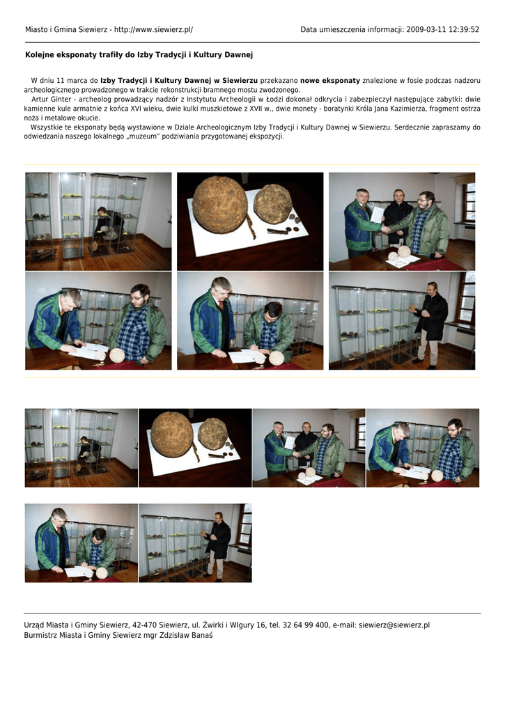 Miasto i Gmina Siewierz - http://www.siewierz.pl/ Data umieszczenia informacji: 2009-03-11 12:39:52 Kolejne eksponaty trafiły do Izby Tradycji i Kultury Dawnej W dniu 11 marca do Izby Tradycji i Kultury Dawnej w Siewierzu przekazano nowe eksponaty znalezione w fosie podczas nadzoru archeologicznego prowadzonego w trakcie rekonstrukcji bramnego mostu zwodzonego. Artur Ginter - archeolog prowadzący nadzór z Instytutu Archeologii w Łodzi dokonał odkrycia i zabezpieczył następujące zabytki: dwie kamienne kule armatnie z końca XVI wieku, dwie kulki muszkietowe z XVII w., dwie monety - boratynki Króla Jana Kazimierza, fragment ostrza noża i metalowe okucie. Wszystkie te eksponaty będą wystawione w Dziale Archeologicznym Izby Tradycji i Kultury Dawnej w Siewierzu. Serdecznie zapraszamy do odwiedzania naszego lokalnego „muzeum” podziwiania przygotowanej ekspozycji. Urząd Miasta i Gminy Siewierz, 42-470 Siewierz, ul. Żwirki i WIgury 16, tel. 32 64 99 400, e-mail: [email protected] Burmistrz Miasta i Gminy Siewierz mgr Zdzisław Banaś