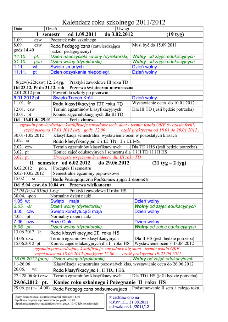 Kalendarz roku szkolnego 2011/2012 Dzień Data I semestr 1.09. czw 8.09 czw godz 14.40 14.10. pt. 31.10. pon 1.11. wt 11.11. pt Uwagi od 1.09.2011 do 3.02.2012 Początek roku szkolnego Rada Pedagogiczna (zatwierdzająca nadzór pedagogiczny) Dzień nauczyciela -wolny (dyrektorski) Dzień wolny (dyrektorski) Święto zmarłych Dzień odzyskania niepodległ. (19 tyg) Musi być do 15.09.2011 Wolny od zajęć edukacyjnych Wolny od zajęć edukacyjnych Dzień wolny Dzień wolny 8(czw)-22(czw).12. 2-tyg. Praktyki zawodowe III roku TD Od 23.12. Pt do 31.12. sob Przerwa świąteczno-noworoczna 2.01.2012 pon Powrót do szkoły po przerwie 6.01.2012 pt Święto Trzech Króli Dzień wolny 11.01. śr Wystawienie ocen do 10.01.2012 Rada klasyfikacyjna III roku TD 12.01. czw Termin egzaminów klasyfikacyjnych Dla III TD (jeśli będzie potrzeba) 13.01. pt Koniec zajęć edukacyjnych dla III TD Od 16.01 do 29.01 Ferie zimowe egzamin potwierdzający kwalifikacje zawodowe tech. dent - termin ustala OKE (w czasie ferii!) część pisemna 17.01.2012 (wt) . godz. 12.00 część praktyczna od 18.01 do 20.01.2012 . 30.01-1.02.2012 Klasyfikacja semestralna, wystawienie ocen w pozostałych klasach 1.02. śr Rada klasyfikacyjna I i II TD.; I i II HS. 2.02. czw Termin egzaminów klasyfikacyjnych Dla TD i HS (jeśli będzie potrzeba) 3.02. pt Koniec zajęć edukacyjnych I semestru dla I i II TD i I i II HS 3.02. pt Uroczyste wręczenie świadectw dla III roku TD II semester od 6.02.2012 (21 tyg – 2 tyg) do 29.06.2012 6.02.2012 pon. Początek II semestru 6.02-10.02.2012 Semestralne egzaminy poprawkowe 15.02 śr Rada Pedagogiczna Podsumowująca I semestr Od 5.04 czw. do 10.04 wt. Przerwa wielkanocna 11.04.(śr)-4.05(pt) 3-tyg Praktyki zawodowe II roku HS 30.04. -pon Normalny dzień nauki 1.05 wt Święto 1 maja Dzień wolny 2.05. -śr Dzień wolny (dyrektorski) Wolny od zajęć edukacyjnych 3.05 czw Święto konstytucji 3 maja Dzień wolny 4.05. -pt Normalny dzień nauki 7.06 czw. Boże Ciało Dzień wolny 8.06. pt Dzień wolny (dyrektorski) Wolny od zajęć edukacyjnych 13.06.2012 śr Rada klasyfikacyjna II roku HS 14.06 czw Termin egzaminów klasyfikacyjnych Dla II HS (jeśli będzie potrzeba) 15.06.2012 pt Koniec zajęć edukacyjnych dla II roku HS Wystawienie ocen 3-13.06.2012 egzamin potwierdzający kwalifikacje zawodowe hig stom - termin ustala OKE. część pisemna 18.06.2012 (pon)godz.12.00 część praktyczna 19-22.06.2012 18.06.2012 (pon). Dzień wolny (dyrektorski) Wolny od zajęć edukacyjnych 11-26.06 Klasyfikacja semestralna pozostałych klas, wystawienie ocen do 26.06.2012 26.06. wt Rada klasyfikacyjna I i II TD.; I HS. 27 i 28.06 śr i czw Termin egzaminów klasyfikacyjnych Dla TD i HS (jeśli będzie potrzeba) 29.06.2012 pt. Koniec roku szkolnego i Pożegnanie II roku HS 29.06. pt (+- 14.00) Rada Pedagogiczna podsumowująca Rady Szkoleniowe: ostatnie czwartki miesiąca 14.40 Spotkana zespołu wychowawczego: piątki 10.40 Spotkania zespołów przedmiotowych: godz. 10.40 lub po zajęciach Podsumowanie II sem. i całego roku. Przedstawiono na R.P.nr…1… 31.08.2011 uchwała nr.1../2011/12