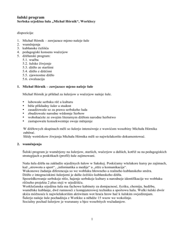 šulski program Serbska srjedźna šula „Michał Hórnik“, Worklecy dispozicija: 1. 2. 3. 4. 5. Michał Hórnik – zawjazace mjeno našeje šule wuměnjenja kubłanske čežišća pedagogiski konsens wučerjow dźěłanski program: 5.1. wučba 5.2. šulske žiwjenje 5.3. dźěło ze staršimi 5.4. dźěło z dźěćimi 5.5. zjawnostne dźěło 5.6. ewaluacija 1. Michał Hórnik – zawjazace mjeno našeje šule Michał Hórnik je přikład za šulerjow a wučerjow našeje šule. • • • • • • lubowaše serbsku rěč a kulturu běše přikładny šuler a student zasadźowaše so za prawa serbskeho luda zbudźowaše narodne wědomje Serbow wobohaćeše ze swojim literarnym dźěłom narodne herbstwo zastupowaše konsekwentnje swoje měnjenje W dźěłowych skupinach měli so šulerjo intensiwnje z wuwićom wosobiny Michała Hórnika zaběrać. Slědy wotrězkow žiwjenja Michała Hórnika měli so najwšelakorišo dokumentować. 2. wuměnjenja Šulski program je wuměrjeny na šulerjow, staršich, wučerjow a dalšich, kotřiž su na pedagogiskich strategijach a poskitkach (profil) šule zajimowani. Naša šula dźěła na zakładźe srjedźnych šulow w Sakskej. Poskićamy wšelakore kursy po zajimach, kaž „strowota a sport“, „informatika a medije“ a „rěče a komunikacija“. Wukonowe žadanja diferencuja so we wobłuku hłowneho a realneho kubłanskeho směra. Dźěło z integraciskimi šulerjemi je dalše čežišćo kubłanskeho dźěła. Sposrědkowanje serbskeje rěče, hajenje serbskeje kultury a narodneje identifikacije we wobłuku rěčneho projekta 2 plus steji w srjedźišću. Worklečanska srjedźna šula ma fachowe kabinety za domjacnosć, fyziku, chemiju, hudźbu, wuměłske kubłanje, dwě rumnosći z kompjuterowej techniku a sportowu halu. Wulki šulski dwór skića móžnosće k najwšelakorišim aktiwitam wot hraća hrow hač k šulskim swjedźenjam. Šulerjo našeje šule pochadźeja z Worklec a něhdźe 15 wsow we wokolinje. Socialny pochad šulerjow je wurunany a bjez wosebitych wužadanjow. 1 3. kubłanske čežišća Sposrědkowanje wědy a kubłanje šulerjow tworitaj jednotu na našej šuli. • Sposrědkowane zakładne znajomosće a zamóžnosće wukmanja šulerjow k aktiwnemu wobdźělenju na towaršnostnym žiwjenju a wutworjenju zakładow za powołanske žiwjenje. • Zamóžnosć k samostatnemu přiswojenju wědy zmóžnja spěšne přiměrjenje na změnjenje towaršnostnych a powołanskich wužadanjow. • Znajomosće wuknjenskich metodow a strategijow, wutrajnosć a samostatnosć při přiswojenju wědy a zarjadowanje do cyłka su wažne wobstatki při wudospołnjenu a nałožowanju swojich zamóžnosćow a při wuwiću samostatneje wosobiny, kotraž slěduje pozitiwnym přeswědčenjam. • Toleranca a akceptanca šěrokeho spektruma nabožnych, swětonahladnych a politiskich přeswědčenjow a wobkedźbowanje čłowjeskeje dostojnosće su zakładny princip na našej šuli. Kóždy na šulskim žiwjenju wobdźěleny zadźěła prawicarskim a druhim totalitarnym zjawam. • Humanistiske principije maja so we wšědnym mjezsobnym wobchadźe na našej šuli dodźeržeć. Wučerjo pokazuja česćownosć a respekt před wosobinu šulerja. Zdobom wočakuja a přesadźa, zo šulerjo mjezsobu a porno wučerjam indiwidualnosć a dostojnosć druheho česća. Přikład wučerjow je tu jara wažny. • Kóždy šuler ma swoje wosobinske sylnosće. Tute měli so solidarisce nałožować. Wědome mylenje wučby a wothódnoćenje wukonow druhich škodźi solidarnemu zmyslenju runje tak, kaž bjezwobhladniwe profilěrowanje wosoby na kóšty druheho. • Za wšěch na šuli skutkowacych je wažny zaměr, wuwić sylnu zwjazanosć z našej šulu. • Wotewrjeny a demokratiski nawod šule přinošuje sylnje k wuwiću začuća zwjazanosće ze swojej šulu. 2 4. pedagogisce jednotne skutkowanje wučerjow • Princip „cyłkownosće“ pedagogiskeho dźěła (jednota mjez sposrědkowanjom wědy a kubłanjom) je zakład wšeje dźěławosće. • Wuznajemy so wšitcy k hódnotam serbskeje rěče a kultury a prócujemy so wo zbudźenje stroweho a zahorjeneho serbskeho narodneho wědomja na zakładźe tolerancy a mjezsobneho respekta. • Identifikujemy so z tradicijemi našeje serbskeje wokoliny. Naša šula měła być městno wuknjenja a mjezsobneho zetkawanja a zeznaća. • Chcemy dźěłowy a wuknjenski klima wutworić, w kotrymž wotewrjenosć, dowěra, pozbudźenje, skedźbnosć, sprawnosć, emocionalna ćopłota, zrozumjenje a dobra mjezsobnosć mjez šulerjemi, wučerjemi a staršimi knježa. • Mamy dowěru k swojim šulerjam a chcemy jich samostatnosć dale wuwiwać. • Chcemy kreatiwnosć a talenty šulerjow sylnić a jich socialne kompetency skrućić. • Šulske wjednistwo podpěra efektiwne zhromadne dźěło mjez wučerjemi a prócuje so wo dobry klima w kolegiju. Z tym přidobudźe na kompetency, suwereniće, dowěrje a je z přikładom. Přez zamołwity škit (Fürsorglichkeit) a realizujomne žadanja zwyša wjednistwo motiwaciju jednotliweho wučerja při wšědnych wužadanjach. • Šulske wjednistwo nastorči a koordinuje prawidłownu ewaluaciju dźěławosće jednotliwca a kolegija. • Fachowe konferency wobhladuja so w přiběracym měrje jako srědk k powyšenju kwality na našej šuli. 5. dźěłowy program 5.1. wučba • • • • • • • • • Solidne a tučasne wučbne metody na zakładźe nowych pedagogiskich a psychologiskich dopóznaćow su wažny narok pedagogiskeho kolegija našeje šule. dwutydźeński praktikum w zawodźe za šulerjow we 8. lětniku hłowneje a 9. lětnika realneje šule poskićamy wšelake kursy zajima • strowe žiwjenske wašnje • kreatiwne tworjenje koordinujemy wučbne plany w předmjetach ... prawidłowna wuměna mjez kolegami nastupajo wučbnych zaměrow (fachowe kružki), normy zadźerženja a porjada (tež šulerjow a staršich zapřijeć) cyłodnjowske poskitki na třoch dnja