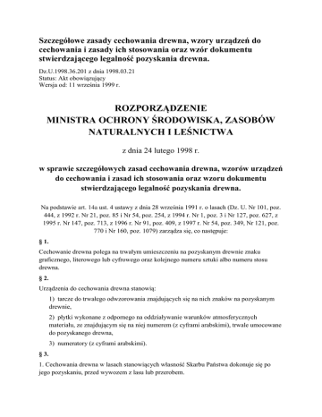 Szczegółowe zasady cechowania drewna, wzory urządzeń do cechowania i zasady ich stosowania oraz wzór dokumentu stwierdzającego legalność pozyskania drewna. Dz.U.1998.36.201 z dnia 1998.03.21 Status: Akt obowiązujący Wersja od: 11 września 1999 r. ROZPORZĄDZENIE MINISTRA OCHRONY ŚRODOWISKA, ZASOBÓW NATURALNYCH I LEŚNICTWA z dnia 24 lutego 1998 r. w sprawie szczegółowych zasad cechowania drewna, wzorów urządzeń do cechowania i zasad ich stosowania oraz wzoru dokumentu stwierdzającego legalność pozyskania drewna. Na podstawie art. 14a ust. 4 ustawy z dnia 28 września 1991 r. o lasach (Dz. U. Nr 101, poz. 444, z 1992 r. Nr 21, poz. 85 i Nr 54, poz. 254, z 1994 r. Nr 1, poz. 3 i Nr 127, poz. 627, z 1995 r. Nr 147, poz. 713, z 1996 r. Nr 91, poz. 409, z 1997 r. Nr 54, poz. 349, Nr 121, poz. 770 i Nr 160, poz. 1079) zarządza się, co następuje: § 1. Cechowanie drewna polega na trwałym umieszczeniu na pozyskanym drewnie znaku graficznego, literowego lub cyfrowego oraz kolejnego numeru sztuki albo numeru stosu drewna. § 2. Urządzenia do cechowania drewna stanowią: 1) tarcze do trwałego odwzorowania znajdujących się na nich znaków na pozyskanym drewnie, 2) płytki wykonane z odpornego na oddziaływanie warunków atmosferycznych materiału, ze znajdującym się na niej numerem (z cyframi arabskimi), trwale umocowane do pozyskanego drewna, 3) numeratory (z cyframi arabskimi). § 3. 1. Cechowania drewna w lasach stanowiących własność Skarbu Państwa dokonuje się po jego pozyskaniu, przed wywozem z lasu lub przerobem. 2. Cechowania drewna w lasach nie stanowiących własności Skarbu Państwa dokonuje się w miejscu jego pozyskania. § 4. Cechowania drewna dokonuje się stosując odpowiednio Polską Normę określoną w przepisach szczególnych. § 5. 1. Cechowania drewna w jednostkach organizacyjnych Państwowego Gospodarstwa Leśnego Lasy Państwowe, zwanego dalej "Lasami Państwowymi", dokonuje się przez naniesienie, za pomocą tarczy, na drewno znaku graficznego w kolorze czarnym oraz przymocowanie płytki z numerem w kolorze czerwonym. 2. Płytka, o której mowa w ust. 1, przymocowana do pozyskanego drewna, zawiera oznaczenia cyfrowe w dwu liniach: 1) w linii górnej - numer kolejny sztuki albo stosu drewna, 2) w linii dolnej - zakodowany 6-cyfrowy znak jednostki organizacyjnej Lasów Państwowych, z której pochodzi drewno; płytka może zawierać dodatkowo kod paskowy do odczytu elektronicznego. 3. Wzór tarczy i płytki, o których mowa w ust. 1 i 2, określa załącznik nr 1 do rozporządzenia. § 6. 1. Cechowania drewna w parkach narodowych dokonuje się przez naniesienie, za pomocą tarczy, na drewno znaku graficznego w kolorze czarnym oraz przymocowanie płytki w kolorze zielonym; płytka zawiera oznaczenia cyfrowe określające kolejny numer sztuki albo stosu drewna. 2. Wzór tarczy i płytki, o których mowa w ust. 1, określa załącznik nr 2 do rozporządzenia. § 7. 1. Cechowania drewna pozyskanego w lasach wchodzących w skład zasobu Własności Rolnej Skarbu Państwa dokonuje się przez naniesienie, za pomocą tarczy, na drewno, znaków w kolorze czarnym, w postaci liter oznaczających Agencję Własności Rolnej Skarbu Państwa, oraz przymocowanie płytki w kolorze żółtym z cyframi określającymi kolejny numer sztuki albo stosu drewna. 2. Wzór tarczy i płytki, o których mowa w ust. 1, określa załącznik nr 3 do rozporządzenia. § 8. 1. Cechowania drewna, pozyskanego w lasach będących w użytkowaniu wieczystym na mocy odrębnych przepisów, dokonuje się przez naniesienie, za pomocą tarczy, na drewno znaków w kolorze czarnym, w postaci liter identyfikujących użytkownika, oraz przymocowanie płytki w kolorze żółtym z cyframi określającymi kolejny numer sztuki albo stosu drewna. 2. Wzór tarczy i płytki, o których mowa w ust. 1, określa załącznik nr 4 do rozporządzenia. § 9. 1.1 Cechowania drewna w lasach nie stanowiących własności Skarbu Państwa dokonuje się przez naniesienie, za pomocą tarczy, na drewno znaku w kolorze czarnym, w postaci liter oznaczających lasy nie stanowiące własności Skarbu Państwa i cyfr identyfikujących powiat, oraz przymocowanie płytki w kolorze niebieskim z cyframi określającymi kolejny numer sztuki albo stosu drewna. 2. Wzór tarczy i płytki, o których mowa w ust. 1, określa załącznik nr 5 do rozporządzenia. 3.2 Cechowania drewna w lasach nie stanowiących własności Skarbu Państwa dokonuje starosta niezwłocznie po zawiadomieniu przez właściciela lasu o pozyskaniu drewna. 4. Dokumentem stwierdzającym legalność pozyskania drewna jest świadectwo legalności pozyskanego drewna, którego wzór stanowi załącznik nr 6 do rozporządzenia. § 10. Do cechowania drewna, o którym mowa w § 6-9, zamiast płytki może być użyty numerator. § 11. Rozporządzenie wchodzi w życie po upływie 14 dni od dnia ogłoszenia. ZAŁĄCZNIKI ZAŁĄCZNIK Nr 1 Wzór tarczy stosowanej w Lasach Państwowych wzór Wzory płytek stosowanych w Lasach Państwowych wzór ZAŁĄCZNIK Nr 2 Wzór tarczy stosowanej w parku narodowym wzór PN - oznaczenie parku narodowego, 02-09 - numer identyfikacyjny parku narodowego, numer cechówki w danym parku. Wzór płytki stosowanej w parku narodowym wzór ZAŁĄCZNIK Nr 3 Wzór tarczy stosowanej w lasach Zasobu Własności Rolnej Skarbu Państwa wzór AWRSP - litery oznaczające Agencję Własności Rolnej Skarbu Państwa, 06 - cyfry oznaczające numer cechówki AWRSP. Wzór płytki stosowanej w lasach Zasobu Własności Rolnej Skarbu Państwa wzór ZAŁĄCZNIK Nr 4 Wzór tarczy stosowanej w lasach będących w użytkowaniu wieczystym na mocy odrębnych przepisów wzór SP - litery oznaczające własność Skarbu Państwa, HSW - 2-4 pierwsze litery użytkownika wieczystego (np. Huta Stalowa Wola). Wzór płytki stosowanej w lasach będących w użytkowaniu wieczystym na mocy odrębnych przepisów wzór ZAŁĄCZNIK Nr 53 wzór- zapisy cyfrowe oznaczaj