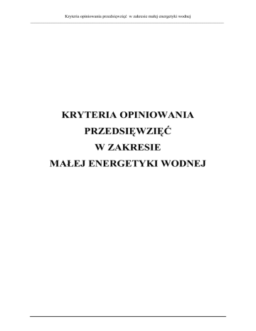 Kryteria opiniowania przedsięwzięć w zakresie małej energetyki wodnej __________________________________________________________________________________________ KRYTERIA OPINIOWANIA PRZEDSIĘWZIĘĆ W ZAKRESIE MAŁEJ ENERGETYKI WODNEJ Kryteria opiniowania przedsięwzięć w zakresie małej energetyki wodnej __________________________________________________________________________________________ SPIS TREŚCI 1. USTALENIA OGÓLNE STR.: 3 1.1. Wstępne warunki podejmowania inwestycji 3 1.2. Podstawy prawne opiniowania lokalizacji i projektów w zakresie małej energetyki 5 1.3. Etapy opiniowania przez RZGW 7 1.4. Rodzaj dokumentacji przedstawianej do opiniowania na poszczególnych etapach uzgadniania. 1.5. Zakres niezbędnych informacji w opiniowanej dokumentacji. 2. UWARUNKOWANIA TECHNICZNE 7 8 9 2.1. UWARUNKOWANIA LOKALIZACYJNE 9 2.1.1. Ograniczenia i zakazy w zakresie lokalizacji 9 2.1.2. Zalecane lokalizacje 9 2.2. UWARUNKOWANIA HYDROLOGICZNE 2.2.1. Analiza możliwości wykorzystania przepływów przez obiekt piętrzący i elektrownię 2.2.2. 10 10 Wpływ na przepływ nienaruszalny oraz ewentualny pobór przez innych użytkowników 10 2.3. UWARUNKOWANIA W ZAKRESIE ROZWIĄZAŃ HYDROTECHNICZNYCH 11 2.3.1. Wykorzystywanie istniejących obiektów piętrzących 11 2.3.2. Obiekty projektowane – wymagania funkcjonalne 11 2.3.3. Zasady piętrzenia na progu – gospodarowanie wodą 12 2.3.4. Kryteria doboru Normalnego i Maksymalnego Użytkowego Poziomu Piętrzenia (NPP i Max.UPP)) 13 2.3.5. Konstrukcja progów piętrzących 13 2.3.6. Uwarunkowania pracy zamknięć. 14 2.3.7. Konstrukcje przepławek. 15 2.3.8. Urządzenia kontrolno-pomiarowe 17 2.3.9. Stabilność dna i brzegów w zasięgu oddziaływania progu 17 2.4 UWARUNKOWANIA W ZAKRESIE ROZWIĄZAŃ HYDROENERGETYCZNYCH 17 2.4.1. Prace studialne i przygotowawcze 17 2.4.2. Analiza techniczno-ekonomiczna uzasadniająca budowę elektrowni 18 2.4.3. Kształtowanie budowli hydroenergetycznych 18 2.4.4. Wymagania dotyczące budynku elektrowni 19 2.4.5. Zabezpieczenia elektrowni przed dopływem zanieczyszczeń pływających i 2.4.6. transportem rumowiska 19 Zapobieganie stratom ryb w turbinach elektrowni 19 Kryteria opiniowania przedsięwzięć w zakresie małej energetyki wodnej __________________________________________________________________________________________ 2.4.7. Charakter pracy MEW 20 2.5.UWARUNKOWANIA W ZAKRESIE GOSPODAROWANIA WODĄ 20 2.5.1. Ustalenia ogólne 20 2.5.2. Gospodarowanie wodą w okresie podwyższonych stanów 20 2.5.3. Gospodarowanie wodą w okresie suszy 20 2.6. UWARUNKOWANIA W ZAKRESIE UTRZYMANIA, KONSERWACJI I EKSPLOATACJI OBIEKTÓW 21 2.7. WPŁYW NA KORYTO CIEKU TERENY PRZYBRZEŻNE I WARUNKI PRZEPŁYWU 3. UWARUNKOWANIA ŚRODOWISKOWE I PRZYRODNICZE 21 22 3.1. OBSZARY WYŁĄCZONE Z MOŻLIWOŚCI REALIZACJI INWESTYCJI MAŁEJ ENERGETYKI 22 3.2. OBSZARY O OGRANICZONEJ MOŻLIWOŚCI REALIZACJI INWESTYCJI MAŁEJ ENERGETYKI 22 3.2.1. Parki krajobrazowe i obszary chronionego krajobrazu 22 3.2.2. Wyznaczone i projektowane obszary Natura 2000 23 3.2.3. Tereny, na których ustanowiono formy ochrony przyrody w postaci pomników przyrody, stanowisk dokumentacyjnych, użytków ekologicznych lub zespołów przyrodniczo – krajobrazowych. 23 3.2.4. Obszary, na których realizacja tego typu obiektów jest sprzeczna z ustaleniami celów środowiskowych dla jednolitych części wód i obszarów chronionych – zawarte w planach gospodarowania wodami na obszarze dorzecza oraz warunkach korzystania z wód regionu wodnego 24 3.3. OBSZARY DOPUSZCZONE DO REALIZACJI INWESTYCJI MAŁEJ ENERGETYKI 24 3.3.1. Uwarunkowania formalne 24 3.3.2. Uwarunkowania szczegółowe 25 3.3.3. Warunki prowadzenia robót budowlanych 25 Kryteria opiniowania przedsięwzięć w zakresie małej energetyki wodnej __________________________________________________________________________________________ 1. USTALENIA OGÓLNE 1.1. Wstępne warunki podejmowania inwestycji Potencjalnemu inwestorowi rozważającemu budowę małej elektrowni wodnej należy uświadomić, że: W zakresie lokalizacji − wyklucza się budowę MEW w parkach narodowych i rezerwatach przyrody, − mogą występować istotne ograniczenia na terenach objętych innymi formami ochrony środowiska jak: parki krajobrazowe, obszary chronionego krajobrazu, obszary Natura 2000, pomniki przyrody, stanowiska dokumentacyjne, użytki ekologiczne i zespoły przyrodniczo – krajobrazowe, − należy brać pod uwagę uwarunkowania wynikające z istniejącego i planowanego zagospodarowania koryta cieku i terenów przyległych tj. istniejące budowle piętrzące i regulacyjne, przekroczenia komunikacyjne (mosty, kładki, brody), przekroczenia cieku elementami sieci uzbrojenia terenu (wodociągi, ciągi kanalizacyjne, gazociągi, kable energetyczne itp.), wyloty kanalizacji i odwodnień, tereny osuwiskowe, możliwość wystąpienia niepożądanego podwyższenia poziomu wód gruntowych na terenach zabudowanych lub wykorzystywanych rolniczo (zawodnienie), możliwość zwiększenia zagrożenia przeciwpowodziowego dla przyległych terenów. − wyklucza się wykorzystywanie zapór przeciw rumowiskowych dla potrzeb małej energetyki. W zakresie gospodarowania wodą Przepływ dyspozycyjny dla potrzeb elektrowni wodnej określony na podstawie szczegółowych obliczeń hydrologicznych (wykonanych przez osobę z uprawnieniami hydrologicznymi) powinien uwzględniać ograniczenia wynikające: − z konieczności zachowania przepływu biologicznego w cieku poniżej budowli piętrzącej , − z poboru wody przez urządzenia służące migracji ryb( przepławki), − z poboru wody przez innych użytkowników w ilości określonej w istniejących lub rozpatrywanych pozwoleniach wodnoprawnych, Dla elektrowni wodnych nie powiązanych ze zbiornikami retencyjnymi należy zapewnić automatyczne położenie zamknięć na stopniu piętrzącym w warunkach przyboru wód. Kryteria opiniowania przedsięwzięć w zakresie małej energe