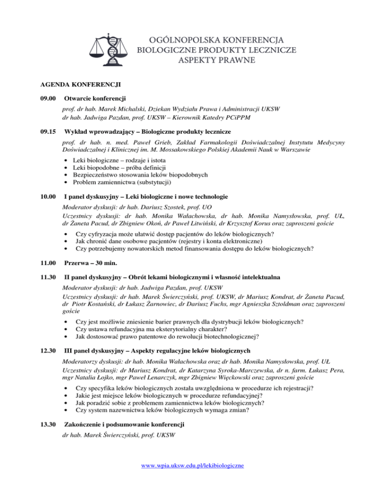 AGENDA KONFERENCJI 09.00 Otwarcie konferencji prof. dr hab. Marek Michalski, Dziekan Wydziału Prawa i Administracji UKSW dr hab. Jadwiga Pazdan, prof. UKSW – Kierownik Katedry PCiPPM 09.15 Wykład wprowadzający – Biologiczne produkty lecznicze prof. dr hab. n. med. Paweł Grieb, Zakład Farmakologii Doświadczalnej Instytutu Medycyny Doświadczalnej i Klinicznej im. M. Mossakowskiego Polskiej Akademii Nauk w Warszawie • • • • 10.00 Leki biologiczne – rodzaje i istota Leki biopodobne – próba definicji Bezpieczeństwo stosowania leków biopodobnych Problem zamiennictwa (substytucji) I panel dyskusyjny – Leki biologiczne i nowe technologie Moderator dyskusji: dr hab. Dariusz Szostek, prof. UO Uczestnicy dyskusji: dr hab. Monika Wałachowska, dr hab. Monika Namysłowska, prof. UŁ, dr Żaneta Pacud, dr Zbigniew Okoń, dr Paweł Litwiński, dr Krzysztof Korus oraz zaproszeni goście • • • Czy cyfryzacja może ułatwić dostęp pacjentów do leków biologicznych? Jak chronić dane osobowe pacjentów (rejestry i konta elektroniczne) Czy potrzebujemy nowatorskich metod finansowania dostępu do leków biologicznych? 11.00 Przerwa – 30 min. 11.30 II panel dyskusyjny – Obrót lekami biologicznymi i własność intelektualna Moderator dyskusji: dr hab. Jadwiga Pazdan, prof. UKSW Uczestnicy dyskusji: dr hab. Marek Świerczyński, prof. UKSW, dr Mariusz Kondrat, dr Żaneta Pacud, dr Piotr Kostański, dr Łukasz Żarnowiec, dr Dariusz Fuchs, mgr Agnieszka Sztoldman oraz zaproszeni goście • • • 12.30 Czy jest możliwie zniesienie barier prawnych dla dystrybucji leków biologicznych? Czy ustawa refundacyjna ma eksterytorialny charakter? Jak dostosować prawo patentowe do rewolucji biotechnologicznej? III panel dyskusyjny – Aspekty regulacyjne leków biologicznych Moderatorzy dyskusji: dr hab. Monika Wałachowska oraz dr hab. Monika Namysłowska, prof. UŁ Uczestnicy dyskusji: dr Mariusz Kondrat, dr Katarzyna Syroka-Marczewska, dr n. farm. Łukasz Pera, mgr Natalia Łojko, mgr Paweł Lenarczyk, mgr Zbigniew Więckowski oraz zaproszeni goście • • • • 13.30 Czy specyfika leków biologicznych została uwzględniona w procedurze ich rejestracji? Jakie jest miejsce leków biologicznych w procedurze refundacyjnej? Jak poradzić sobie z problemem zamiennictwa leków biologicznych? Czy system nazewnictwa leków biologicznych wymaga zmian? Zakończenie i podsumowanie konferencji dr hab. Marek Świerczyński, prof. UKSW www.wpia.uksw.edu.pl/lekibiologiczne