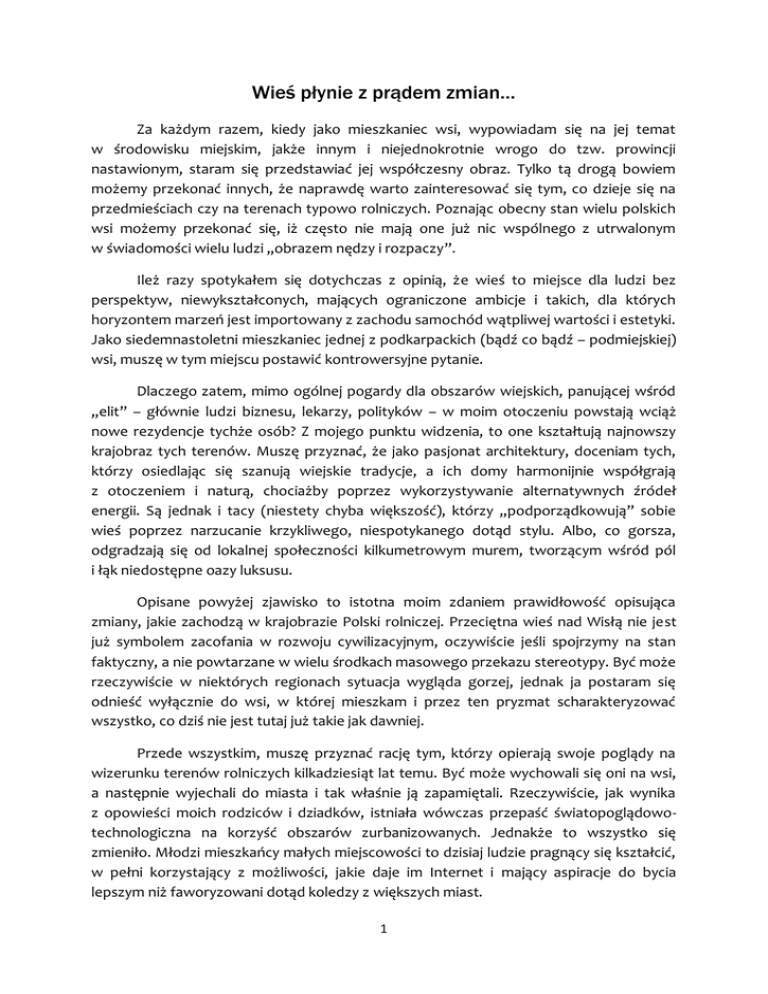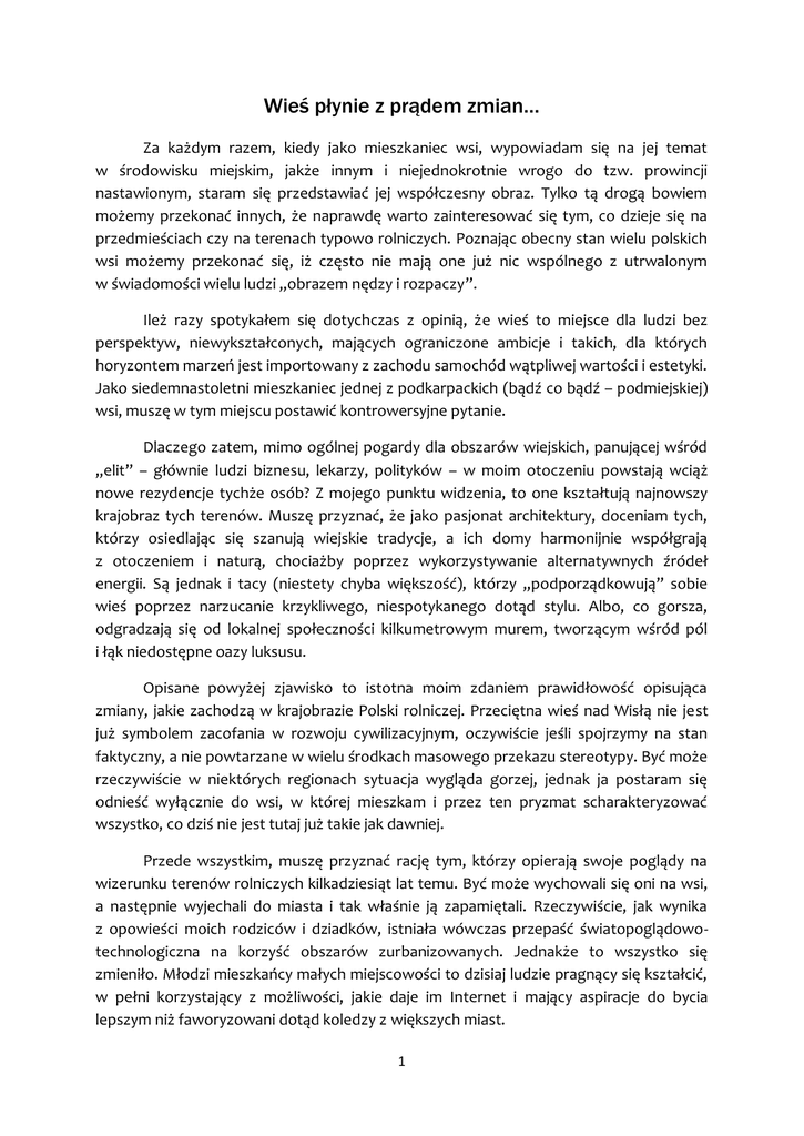 Wieś płynie z prądem zmian… Za każdym razem, kiedy jako mieszkaniec wsi, wypowiadam się na jej temat w środowisku miejskim, jakże innym i niejednokrotnie wrogo do tzw. prowincji nastawionym, staram się przedstawiać jej współczesny obraz. Tylko tą drogą bowiem możemy przekonać innych, że naprawdę warto zainteresować się tym, co dzieje się na przedmieściach czy na terenach typowo rolniczych. Poznając obecny stan wielu polskich wsi możemy przekonać się, iż często nie mają one już nic wspólnego z utrwalonym w świadomości wielu ludzi „obrazem nędzy i rozpaczy”. Ileż razy spotykałem się dotychczas z opinią, że wieś to miejsce dla ludzi bez perspektyw, niewykształconych, mających ograniczone ambicje i takich, dla których horyzontem marzeń jest importowany z zachodu samochód wątpliwej wartości i estetyki. Jako siedemnastoletni mieszkaniec jednej z podkarpackich (bądź co bądź – podmiejskiej) wsi, muszę w tym miejscu postawić kontrowersyjne pytanie. Dlaczego zatem, mimo ogólnej pogardy dla obszarów wiejskich, panującej wśród „elit” – głównie ludzi biznesu, lekarzy, polityków – w moim otoczeniu powstają wciąż nowe rezydencje tychże osób? Z mojego punktu widzenia, to one kształtują najnowszy krajobraz tych terenów. Muszę przyznać, że jako pasjonat architektury, doceniam tych, którzy osiedlając się szanują wiejskie tradycje, a ich domy harmonijnie współgrają z otoczeniem i naturą, chociażby poprzez wykorzystywanie alternatywnych źródeł energii. Są jednak i tacy (niestety chyba większość), którzy „podporządkowują” sobie wieś poprzez narzucanie krzykliwego, niespotykanego dotąd stylu. Albo, co gorsza, odgradzają się od lokalnej społeczności kilkumetrowym murem, tworzącym wśród pól i łąk niedostępne oazy luksusu. Opisane powyżej zjawisko to istotna moim zdaniem prawidłowość opisująca zmiany, jakie zachodzą w krajobrazie Polski rolniczej. Przeciętna wieś nad Wisłą nie jest już symbolem zacofania w rozwoju cywilizacyjnym, oczywiście jeśli spojrzymy na stan faktyczny, a nie powtarzane w wielu środkach masowego przekazu stereotypy. Być może rzeczywiście w niektórych regionach sytuacja wygląda gorzej, jednak ja postaram się odnieść wyłącznie do wsi, w której mieszkam i przez ten pryzmat scharakteryzować wszystko, co dziś nie jest tutaj już takie jak dawniej. Przede wszystkim, muszę przyznać rację tym, którzy opierają swoje poglądy na wizerunku terenów rolniczych kilkadziesiąt lat temu. Być może wychowali się oni na wsi, a następnie wyjechali do miasta i tak właśnie ją zapamiętali. Rzeczywiście, jak wynika z opowieści moich rodziców i dziadków, istniała wówczas przepaść światopoglądowotechnologiczna na korzyść obszarów zurbanizowanych. Jednakże to wszystko się zmieniło. Młodzi mieszkańcy małych miejscowości to dzisiaj ludzie pragnący się kształcić, w pełni korzystający z możliwości, jakie daje im Internet i mający aspiracje do bycia lepszym niż faworyzowani dotąd koledzy z większych miast. 1 Spore zmiany da się zauważyć także wśród ludzi starszych. Utrzymują oni wspaniałe tradycje polskiej przedsiębiorczości. W jaki sposób? Otóż, zakładają stowarzyszenia zajmujące się produkcją wyrobów regionalnych, szerzeniem kultury ludowej wśród młodzieży, a nawet rozwojem osobistym. Ci ludzie to w wielu przypadkach (co doskonale widać szczególnie na Podkarpaciu) emigranci, których niemal całe życie upłynęło na wypracowywaniu PKB Stanów Zjednoczonych czy Kanady. Dlaczego wrócili? Oczywiście powody są różne, ale z moich obserwacji wynika jeden dominujący wniosek. Polska w ciągu ostatnich dwudziestu pięciu lat zmieniła się na tyle, iż różnice między światem zachodnim, a naszym krajem zmniejszyły się. W związku z tym nie ma już konieczności pozostawania za oceanem, bo również w Polsce można liczyć na spokojną starość. Oczywiście pomijam fakt, że tacy ludzie korzystają tutaj zazwyczaj ze swoich wysokich amerykańskich emerytur. Powracająca z zagranicy diaspora kształtuje także wizerunek mojej wsi. Podróżując po Ojczyźnie zauważyłem, iż niewiele jest jeszcze miejsc, w których tak bardzo jak na Podkarpaciu dba się o estetykę gospodarstw. Przenosząc na rodzimy grunt najlepsze wzorce z zachodu, przykładają oni szczególną uwagę do utrzymania porządku w swoich domach i ogrodach. Co ciekawe, często ma to charakter pokazania sąsiadowi inwencji twórczej i udowodnienia mu swojej wyższości… Choć może się to wydawać śmieszne, kilkanaście lat temu wskutek tego zjawiska światopoglądowego, zawitały na Podkarpacie pierwsze ogrodowe krasnale i elementy dekoracyjne, wzbogacane później stopniowo o regionalne wzornictwo. Na fali popularności lokalnych rzemieślników, upowszechniła się też troska o dziedzictwo kulturowe regionu, a artyści zyskali większe społeczne uznanie swojej pracy. Wiele zmieniło się także w kwestii infrastruktury. Moja wieś nie straszy już tak zwanego ruchu tranzytowego swoim wyglądem (bo przecież miejscowi do otoczenia zdążyli przez lata przywyknąć…). Powstały nowe drogi z asfaltową nawierzchnią, wciąż buduje się chodniki i ścieżki rowerowe. Niewątpliwie milowym krokiem w rozwoju bazy sportowej miejscowości było wybudowanie boiska wielofunkcyjnego, z którego chętnie korzystają dzieci i młodzież szkolna. Jako ciekawostkę należy potraktować fakt, iż jeszcze kilka lat temu głównymi beneficjentami takich przedsięwzięć były ludowe zespoły sportowe oraz szeroko pojęci działacze lokalni. Boiska były wówczas wykorzystywane przede wszystkim w godzinach popołudniowych, do rekreacji oraz „treningów” lokalnych, amatorskich drużyn. Stopniowo jednak obserwuje się wzrost zainteresowania dzieci wspólną zabawą czy grą na tak przygotowanej nawierzchni. Dopiero teraz wiele z nich zrozumi