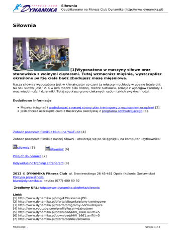 Siłownia Opublikowano na Fitness Club Dynamika (http://www.dynamika.pl) Siłownia [1]Wyposażona w maszyny siłowe oraz stanowiska z wolnymi ciężarami. Tutaj wzmacnisz mięśnie, wyszczuplisz określone partie ciała bądź zbudujesz masę mięśniową. Nasza siłownia wyposażona jest w klimatyzator co czyni ją miejscem ochłody w upalne letnie dni. Na sali siłowni jest TV, a w nim mecze piłki nożnej, mecze siatkówki, relacje z wyścigów Formuły 1 oraz wiadomości i dzienniki. Tutaj spotkasz grono ciekawych osób - takich zwykłych ludzi. Dodatkowe informacje Możesz ściągnąć i wydrukować z naszej strony plan treningowy z rozpisaniem urządzeń [2]. Jeśli chcesz uszczuplić ciało z tłuszczyku skorzystaj z programu odchudzającego [3]. Zobacz pozostałe filmiki z klubu na YouTube [4] Zobacz pozostałe filmiki z naszej siłowni - otwierają się po ściągnięciu na komputer użytkownika: siłownia [5] siłownia2 [6] Przejdź do cennika [7] Indywidualne treningi z trenerem [8] 2012 © DYNAMIKA Fitness Club ul. Broniewskiego 26 45-461 Opole (Kolonia Gosławicka) Polityka prywatności [email protected] tel/fax (077) 400 80 92 Źródłowy URL: http://www.dynamika.pl/oferta/silownia Linki: [1] http://www.dynamika.pl/img/435silownia.JPG [2] http://www.dynamika.pl/oferta/silownia/plany-treningowe [3] http://www.dynamika.pl/oferta/programy-odchudzajace [4] http://www.youtube.com/profile?user=dajnatown [5] http://www.dynamika.pl/download/MVI_1660.avi?tl=5 [6] http://www.dynamika.pl/download/MVI_1661.avi?tl=5 [7] http://www.dynamika.pl/oferta/cenniki/silownia Realizacja: Strona 1 z 2 Siłownia Opublikowano na Fitness Club Dynamika (http://www.dynamika.pl) [8] http://www.dynamika.pl/oferta/treningi-indywidualne Realizacja: Strona 2 z 2