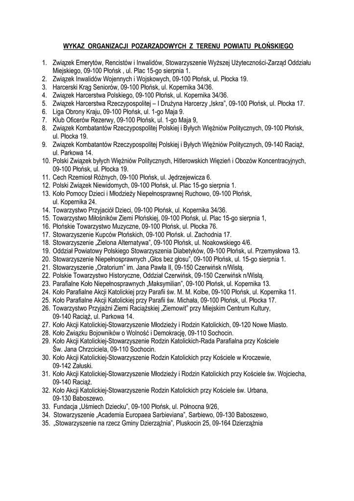 WYKAZ ORGANIZACJI POZARZĄDOWYCH Z TERENU POWIATU PŁOŃSKIEGO 1. Związek Emerytów, Rencistów i Inwalidów, Stowarzyszenie Wyższej Użyteczności-Zarząd Oddziału Miejskiego, 09-100 Płońsk , ul. Plac 15-go sierpnia 1. 2. Związek Inwalidów Wojennych i Wojskowych, 09-100 Płońsk, ul. Płocka 19. 3. Harcerski Krąg Seniorów, 09-100 Płońsk, ul. Kopernika 34/36. 4. Związek Harcerstwa Polskiego, 09-100 Płońsk, ul. Kopernika 34/36. 5. Związek Harcerstwa Rzeczypospolitej – I Drużyna Harcerzy „Iskra”, 09-100 Płońsk, ul. Płocka 17. 6. Liga Obrony Kraju, 09-100 Płońsk, ul. 1-go Maja 9. 7. Klub Oficerów Rezerwy, 09-100 Płońsk, ul. 1-go Maja 9, 8. Związek Kombatantów Rzeczypospolitej Polskiej i Byłych Więźniów Politycznych, 09-100 Płońsk, ul. Płocka 19. 9. Związek Kombatantów Rzeczypospolitej Polskiej i Byłych Więźniów Politycznych, 09-140 Raciąż, ul. Parkowa 14. 10. Polski Związek byłych Więźniów Politycznych, Hitlerowskich Więzień i Obozów Koncentracyjnych, 09-100 Płońsk, ul. Płocka 19. 11. Cech Rzemiosł Różnych, 09-100 Płońsk, ul. Jędrzejewicza 6. 12. Polski Związek Niewidomych, 09-100 Płońsk, ul. Plac 15-go sierpnia 1. 13. Koło Pomocy Dzieci i Młodzieży Niepełnosprawnej Ruchowo, 09-100 Płońsk, ul. Kopernika 24. 14. Towarzystwo Przyjaciół Dzieci, 09-100 Płońsk, ul. Kopernika 34/36. 15. Towarzystwo Miłośników Ziemi Płońskiej, 09-100 Płońsk, ul. Plac 15-go sierpnia 1, 16. Płońskie Towarzystwo Muzyczne, 09-100 Płońsk, ul. Płocka 76. 17. Stowarzyszenie Kupców Płońskich, 09-100 Płońsk. ul. Zachodnia 17. 18. Stowarzyszenie „Zielona Alternatywa”, 09-100 Płońsk, ul. Noakowskiego 4/6. 19. Oddział Powiatowy Polskiego Stowarzyszenia Diabetyków, 09-100 Płońsk, ul. Przemysłowa 13. 20. Stowarzyszenie Niepełnosprawnych „Głos bez głosu”, 09-100 Płońsk, ul. 15-go sierpnia 1. 21. Stowarzyszenie „Oratorium” im. Jana Pawła II, 09-150 Czerwińsk n/Wisłą. 22. Polskie Towarzystwo Historyczne, Oddział Czerwińsk, 09-150 Czerwińsk n/Wisłą. 23. Parafialne Koło Niepełnosprawnych „Maksymilian”, 09-100 Płońsk, ul. Kopernika 13. 24. Koło Parafialne Akcji Katolickiej przy Parafii św. M. M. Kolbe, 09-100 Płońsk, ul. Kopernika 11. 25. Koło Parafialne Akcji Katolickiej przy Parafii św. Michała, 09-100 Płońsk, ul. Płocka 17. 26. Towarzystwo Przyjaźni Ziemi Raciążskiej „Ziemowit” przy Miejskim Centrum Kultury, 09-140 Raciąż, ul. Parkowa 14. 27. Koło Akcji Katolickiej-Stowarzyszenie Młodzieży i Rodzin Katolickich, 09-120 Nowe Miasto. 28. Koło Związku Bojowników o Wolność i Demokrację, 09-110 Sochocin. 29. Koło Akcji Katolickiej-Stowarzyszenie Rodzin Katolickich-Rada Parafialna przy Kościele Św. Jana Chrzciciela, 09-110 Sochocin. 30. Koło Akcji Katolickiej-Stowarzyszenie Rodzin Katolickich przy Kościele w Kroczewie, 09-142 Załuski. 31. Koło Akcji Katolickiej-Stowarzyszenie Młodzieży i Rodzin Katolickich przy Kościele św. Wojciecha, 09-140 Raciąż. 32. Koło Akcji Katolickiej-Stowarzyszenie Rodzin Katolickich przy Kościele św. Urbana, 09-130 Baboszewo. 33. Fundacja „Uśmiech Dziecku”, 09-100 Płońsk, ul. Północna 9/26, 34. Stowarzyszenie „Academia Europaea Sarbieviana”, Sarbiewo, 09-130 Baboszewo, 35. „Stowarzyszenie na rzecz Gminy Dzierzążnia”, Pluskocin 25, 09-164 Dzierzążnia