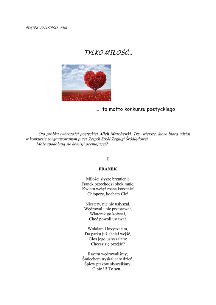 PIĄTEK 19 LUTEGO 2016 TYLKO MIŁOŚĆ... ... to motto konkursu poetyckiego Oto próbka twórczości poetyckiej Alicji Marchewki. Trzy wiersze, które biorą udział w konkursie zorganizowanym przez Zespół Szkół Żeglugi Śródlądowej. Może spodobają się komisji oceniającej? I FRANEK Miłości słyszę brzmienie Franek przechodzi obok mnie, Kwiatu wciąż rosną korzenie' Chłopcze, kocham Cię! Niestety, nic nie usłyszał. Wędrował i nie przestawał, Wiaterek go kołysał, Choć powoli ustawał. Wołałam i krzyczałam, Do parku już chciał wejść, Głos jego usłyszałam: Chcesz się przejść? Razem wędrowaliśmy, Śmiechem tryskał cały dzień, Śpiew ptaków słyszeliśmy, O nie !!! To sen... II TAK BARDZO SIĘ KOCHAMY Słońca zachód na niebie, My razem wpatrzeni w siebie, Ustami się złączamy... Tak bardzo się kochamy!!! Świat wokół się kręci, A my tak do raju wzięci, Przestać nie zamierzamy... Tak bardzo się kochamy!!! Widzę w tym raju momenty z życia Bo w sumie przed Nim nic nie mam do ukrycia, Więc razem je oglądamy... Tak bardzo się kochamy!!! Nagle on się odsuwa... Zesmutniałam - nie ... wraca! Znów się w siebie wtulamy... Tak bardzo się kochamy !!! III WYJECHAŁEŚ Walczymy o każdą chwilę. Dla Ciebie przeszłabym milę, By spojrzeć głęboko w twe oczy I na to, jak umysł Twój kroczy... Chcę być już w Ciebie wtulona. Wreszcie z życia zadowolona Śnić o tym każdej nocy, Ale nie mam magicznych mocy... A ponieważ wyjechałeś na wakacje I wrócisz za tydzień na kolację, To muszę na Ciebie tu czekać. Następnym razem z Tobą jechać...