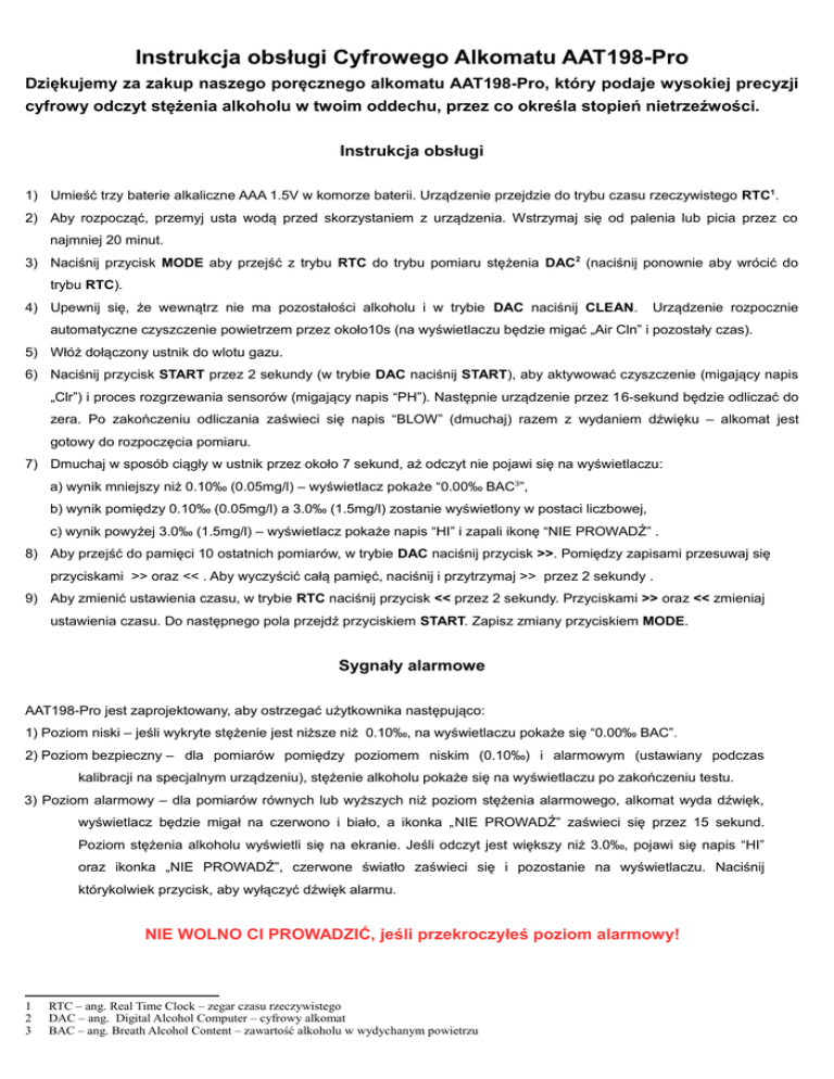 Instrukcja obsługi Cyfrowego Alkomatu AAT198-Pro Dziękujemy za zakup naszego poręcznego alkomatu AAT198-Pro, który podaje wysokiej precyzji cyfrowy odczyt stężenia alkoholu w twoim oddechu, przez co określa stopień nietrzeźwości. Instrukcja obsługi 1) Umieść trzy baterie alkaliczne AAA 1.5V w komorze baterii. Urządzenie przejdzie do trybu czasu rzeczywistego RTC1. 2) Aby rozpocząć, przemyj usta wodą przed skorzystaniem z urządzenia. Wstrzymaj się od palenia lub picia przez co najmniej 20 minut. 3) Naciśnij przycisk MODE aby przejść z trybu RTC do trybu pomiaru stężenia DAC2 (naciśnij ponownie aby wrócić do trybu RTC). 4) Upewnij się, że wewnątrz nie ma pozostałości alkoholu i w trybie DAC naciśnij CLEAN. Urządzenie rozpocznie automatyczne czyszczenie powietrzem przez około10s (na wyświetlaczu będzie migać „Air Cln” i pozostały czas). 5) Włóż dołączony ustnik do wlotu gazu. 6) Naciśnij przycisk START przez 2 sekundy (w trybie DAC naciśnij START), aby aktywować czyszczenie (migający napis „Clr”) i proces rozgrzewania sensorów (migający napis “PH”). Następnie urządzenie przez 16-sekund będzie odliczać do zera. Po zakończeniu odliczania zaświeci się napis “BLOW” (dmuchaj) razem z wydaniem dźwięku – alkomat jest gotowy do rozpoczęcia pomiaru. 7) Dmuchaj w sposób ciągły w ustnik przez około 7 sekund, aż odczyt nie pojawi się na wyświetlaczu: a) wynik mniejszy niż 0.10‰ (0.05mg/l) – wyświetlacz pokaże “0.00‰ BAC3”, b) wynik pomiędzy 0.10‰ (0.05mg/l) a 3.0‰ (1.5mg/l) zostanie wyświetlony w postaci liczbowej, c) wynik powyżej 3.0‰ (1.5mg/l) – wyświetlacz pokaże napis “HI” i zapali ikonę “NIE PROWADŹ” . 8) Aby przejść do pamięci 10 ostatnich pomiarów, w trybie DAC naciśnij przycisk >>. Pomiędzy zapisami przesuwaj się przyciskami >> oraz << . Aby wyczyścić całą pamięć, naciśnij i przytrzymaj >> przez 2 sekundy . 9) Aby zmienić ustawienia czasu, w trybie RTC naciśnij przycisk << przez 2 sekundy. Przyciskami >> oraz << zmieniaj ustawienia czasu. Do następnego pola przejdź przyciskiem START. Zapisz zmiany przyciskiem MODE. Sygnały alarmowe AAT198-Pro jest zaprojektowany, aby ostrzegać użytkownika następująco: 1) Poziom niski – jeśli wykryte stężenie jest niższe niż 0.10‰, na wyświetlaczu pokaże się “0.00‰ BAC”. 2) Poziom bezpieczny – dla pomiarów pomiędzy poziomem niskim (0.10‰) i alarmowym (ustawiany podczas kalibracji na specjalnym urządzeniu), stężenie alkoholu pokaże się na wyświetlaczu po zakończeniu testu. 3) Poziom alarmowy – dla pomiarów równych lub wyższych niż poziom stężenia alarmowego, alkomat wyda dźwięk, wyświetlacz będzie migał na czerwono i biało, a ikonka „NIE PROWADŹ” zaświeci się przez 15 sekund. Poziom stężenia alkoholu wyświetli się na ekranie. Jeśli odczyt jest większy niż 3.0‰, pojawi się napis “HI” oraz ikonka „NIE PROWADŹ”, czerwone światło zaświeci się i pozostanie na wyświetlaczu. Naciśnij którykolwiek przycisk, aby wyłączyć dźwięk alarmu. NIE WOLNO CI PROWADZIĆ, jeśli przekroczyłeś poziom alarmowy! 1 2 3 RTC – ang. Real Time Clock – zegar czasu rzeczywistego DAC – ang. Digital Alcohol Computer – cyfrowy alkomat BAC – ang. Breath Alcohol Content – zawartość alkoholu w wydychanym powietrzu Uwagi 1) Aby otrzymać dokładny odczyt (szczególnie podczas pierwszego użycia), użytkownik powinien upewnić się, że wewnątrz nie ma pozostałości alkoholu przed rozpoczęciem nowego testu. W przypadku obecnych pozostałości, urządzeniu zajmie ok. 2 minuty, aby rozgrzać sensor i komorę, kiedy użytkownik naciśnie przycisk START. Po 2-minutach procesu czyszczenia, proszę sprawdzić alkomat aż pokaże się na wyświetlaczu ‘0.00’. Można to zrobić naciskając przycisk START raz i następnie przyciskając przycisk START dmuchaj świeżym powietrzem do wlotu gazu przez kilka sekund. 2) Po 5 kolejnych próbach pozostaw urządzenie na 2 minuty. 3) Przy niskim stanie baterii zaświeci się napis “LOB” i urządzenie wróci do trybu RTC. Należy niezwłocznie wymienić baterię, jeśli ich stan nie pozwala na wykonanie pomiaru, ponieważ taki odczyt jest niedokładny. 4) Jeśli różnica pomiędzy dwoma kolejnymi odczytami wynosi >0.1‰BAC (0.05mg/l lub 0.01% BAC), test należy wykonać ponownie. 5) Podczas pobierania próbki nie wolno blokować wylotu gazu. W przeciwnym razie, odczyt będzie zmieniony. 6) Kiedy produkt nie jest używany, przechowuj go w suchym miejscu. 7) Urządzenie służy do sprawdzania stężenia alkoholu w oddechu, należy unikać mocnych uderzeń, czy upuszczenia testera. Należy ponownie skalibrować alkomat w centrum serwisowym jeśli taki wstrząs nastąpi. 8) Ponowna kalibracja - wg międzynarodowej normy (e.g. DIN31051) wszystkie przyrządy pomiarowe powinny być ponownie kalibrowane co 6 miesięcy. Charakterystyka produktu 1. Zakres: 0.00‰ BAC, 0.10 ~ 3.0 ‰ BAC, Hi lub 0.00 mg/l, 0.05 ~ 1.5 mg/l, Hi 2. Pamięć: 10 rekordów 3. Zasilanie: 3x baterie alkaliczne AAA 1.5V 4. Wyświetlacz: cyfrowy wyświetlacz graficzny z dwukolorowym podświetleniem 5. Tryb oszczędzania energii: 2 minuty od ostatniego naciśnięcia przycisku 6. Pobieranie próbki: około 7 sekund ciągłego wydychania powietrza 7. Czas cyklu: ~60 sekund 8. Wymiary: 61*123*27 mm 9. Waga: 78g (bez baterii) 10. Skalibrowany poziom alarmowy: □0.2‰ □0.3‰ □0.5‰ □0.8‰ BAC □0.1mg/l □0.15mg/l □0.25mg/l □0.4 mg/l 11. Zatwierdzenie agencji: CE 12. Akcesoria: kabel zasilający USB, smycz, 2 szt. ustników 13. Temperatura pracy: 0℃-40℃ 14. Zakres pomiaru temperatury: -15℃-50℃ Dane techniczne mogą ulec zmianie bez powiadomienia Cyfrowy alkomat AAT 198-Pro powinien być używany jako ogólny wskaźnik poziomu alkoholu w organizmie. Wiele czynników (np. pozostałości gazu, dym, różne zapachy w ustach itp…) mogą m