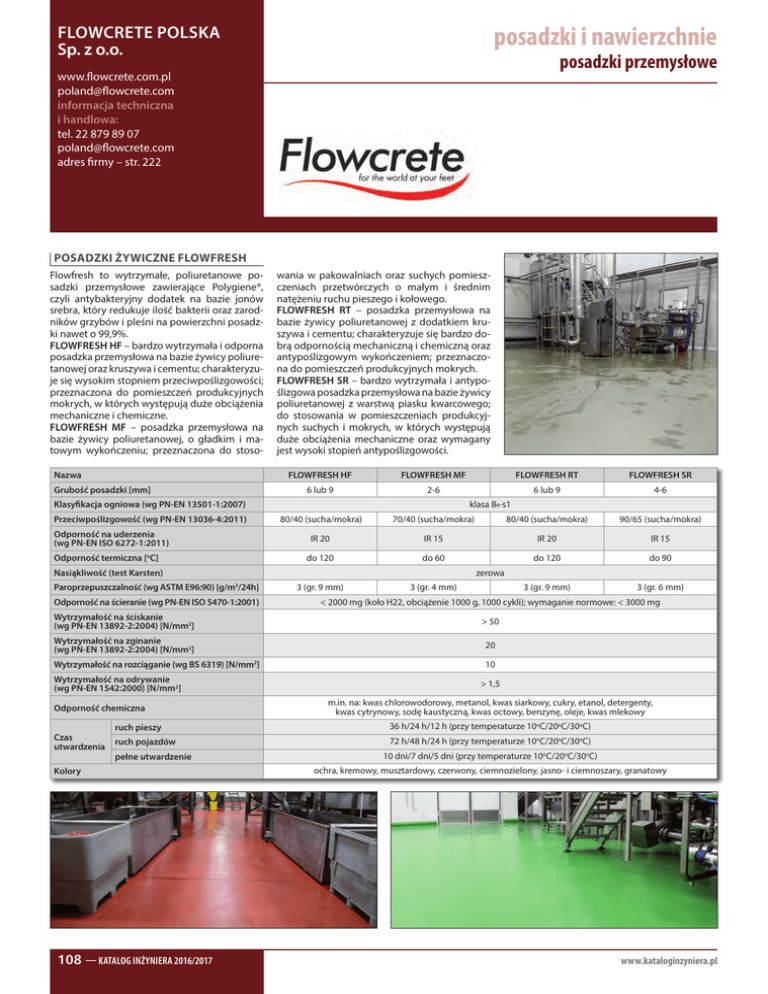 posadzki i nawierzchnie FLOWCRETE POLSKA Sp. z o.o. posadzki przemysłowe www.flowcrete.com.pl [email protected] informacja techniczna i handlowa: tel. 22 879 89 07 [email protected] adres firmy – str. 222 POSADZKI ŻYWICZNE FLOWFRESH Flowfresh to wytrzymałe, poliuretanowe posadzki przemysłowe zawierające Polygiene®, czyli antybakteryjny dodatek na bazie jonów srebra, który redukuje ilość bakterii oraz zarodników grzybów i pleśni na powierzchni posadzki nawet o 99,9%. FLOWFRESH HF – bardzo wytrzymała i odporna posadzka przemysłowa na bazie żywicy poliuretanowej oraz kruszywa i cementu; charakteryzuje się wysokim stopniem przeciwpoślizgowości; przeznaczona do pomieszczeń produkcyjnych mokrych, w których występują duże obciążenia mechaniczne i chemiczne. FLOWFRESH MF – posadzka przemysłowa na bazie żywicy poliuretanowej, o gładkim i matowym wykończeniu; przeznaczona do stosoNazwa Grubość posadzki [mm] wania w pakowalniach oraz suchych pomieszczeniach przetwórczych o małym i średnim natężeniu ruchu pieszego i kołowego. FLOWFRESH RT – posadzka przemysłowa na bazie żywicy poliuretanowej z dodatkiem kruszywa i cementu; charakteryzuje się bardzo dobrą odpornością mechaniczną i chemiczną oraz antypoślizgowym wykończeniem; przeznaczona do pomieszczeń produkcyjnych mokrych. FLOWFRESH SR – bardzo wytrzymała i antypoślizgowa posadzka przemysłowa na bazie żywicy poliuretanowej z warstwą piasku kwarcowego; do stosowania w pomieszczeniach produkcyjnych suchych i mokrych, w których występują duże obciążenia mechaniczne oraz wymagany jest wysoki stopień antypoślizgowości. FLOWFRESH HF FLOWFRESH MF FLOWFRESH RT FLOWFRESH SR 6 lub 9 2-6 6 lub 9 4-6 Klasyfikacja ogniowa (wg PN-EN 13501-1:2007) Przeciwpoślizgowość (wg PN-EN 13036-4:2011) Odporność na uderzenia (wg PN-EN ISO 6272-1:2011) Odporność termiczna [ C] o klasa Bfl-s1 80/40 (sucha/mokra) 70/40 (sucha/mokra) 80/40 (sucha/mokra) 90/65 (sucha/mokra) IR 20 IR 15 IR 20 IR 15 do 120 do 60 do 120 do 90 3 (gr. 9 mm) 3 (gr. 6 mm) Nasiąkliwość (test Karsten) Paroprzepuszczalność (wg ASTM E96:90) [g/m2/24h] Odporność na ścieranie (wg PN-EN ISO 5470-1:2001) zerowa 3 (gr. 9 mm) 3 (gr. 4 mm) < 2000 mg (koło H22, obciążenie 1000 g, 1000 cykli); wymaganie normowe: < 3000 mg Wytrzymałość na ściskanie (wg PN-EN 13892-2:2004) [N/mm2] > 50 Wytrzymałość na zginanie (wg PN-EN 13892-2:2004) [N/mm2] 20 Wytrzymałość na rozciąganie (wg BS 6319) [N/mm2] 10 Wytrzymałość na odrywanie (wg PN-EN 1542:2000) [N/mm2] Odporność chemiczna Czas utwardzenia ruch pieszy 36 h/24 h/12 h (przy temperaturze 10oC/20oC/30oC) ruch pojazdów 72 h/48 h/24 h (przy temperaturze 10oC/20oC/30oC) pełne utwardzenie 10 dni/7 dni/5 dni (przy temperaturze 10oC/20oC/30oC) ochra, kremowy, musztardowy, czerwony, ciemnozielony, jasno- i ciemnoszary, granatowy Kolory 108 > 1,5 m.in. na: kwas chlorowodorowy, metanol, kwas siarkowy, cukry, etanol, detergenty, kwas cytrynowy, sodę kaustyczną, kwas octowy, benzynę, oleje, kwas mlekowy — KATALOG INŻYNIERA 2016/2017 www.kataloginzyniera.pl
