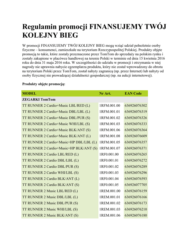 Regulamin promocji FINANSUJEMY TWÓJ KOLEJNY BIEG W promocji FINANSUJEMY TWÓJ KOLEJNY BIEG mogą wziąć udział pełnoletnie osoby fizyczne – konsumenci, zamieszkałe na terytorium Rzeczypospolitej Polskiej. Produkty objęte promocją to takie, które zostały przeznaczone przez TomTom do sprzedaży na polskim rynku i zostały zakupione w placówce handlowej na terenie Polski w terminie od dnia 15 kwietnia 2016 roku do dnia 31 maja 2016 roku. W szczególności do udziału w promocji i otrzymania w niej nagrody nie uprawnia nabycie egzemplarza produktu, który nie został wprowadzony do obrotu na terytorium Polski przez TomTom, został nabyty zagranicą (np. przez Internet) lub nabyty od osoby fizycznej nie prowadzącej działalności gospodarczej (np. na aukcji internetowej). Produkty objęte promocją: MODEL Nr Art. EAN Code TT RUNNER 2 Cardio+Music LBL/RED (L) 1RFM.001.00 636926076302 TT RUNNER 2 Cardio+Music DBL/LBL (L) 1RFM.001.01 636926076319 TT RUNNER 2 Cardio+Music DBL/PUR (S) 1RFM.001.02 636926076326 TT RUNNER 2 Cardio+Music WHI/LBL (S) 1RFM.001.03 636926076333 TT RUNNER 2 Cardio+Music BLK/ANT (S) 1RFM.001.06 636926076364 TT RUNNER 2 Cardio+Music BLK/ANT (L) 1RFM.001.08 636926076609 TT RUNNER 2 Cardio+Music+HP DBL/LBL (L) 1RFM.001.05 636926076357 TT RUNNER 2 Cardio+Music+HP BLK/ANT (S) 1RFM.001.07 636926076371 TT RUNNER 2 Cardio LBL/RED (L) 1RF0.001.00 636926076265 TT RUNNER 2 Cardio DBL/LBL (L) 1RF0.001.01 636926076272 TT RUNNER 2 Cardio DBL/PUR (S) 1RF0.001.02 636926076289 TT RUNNER 2 Cardio WHI/LBL (S) 1RF0.001.03 636926076296 TT RUNNER 2 Cardio BLK/ANT (L) 1RF0.001.04 636926076593 TT RUNNER 2 Cardio BLK/ANT (S) 1RF0.001.05 636926077705 TT RUNNER 2 Music LBL/RED (L) 1REM.001.00 636926076159 TT RUNNER 2 Music DBL/LBL (L) 1REM.001.01 636926076166 TT RUNNER 2 Music DBL/PUR (S) 1REM.001.02 636926076173 TT RUNNER 2 Music WHI/LBL (S) 1REM.001.03 636926076210 TT RUNNER 2 Music BLK/ANT (S) 1REM.001.06 636926076180 ZEGARKI TomTom TT RUNNER 2 Music BLK/ANT (L) 1REM.001.08 636926076562 TT RUNNER 2 Music+HP DBL/LBL (L) 1REM.001.05 636926076197 TT RUNNER 2 Music+HP BLK/ANT (S) 1REM.001.07 636926076258 TT RUNNER 2 LBL/RED (L) 1RE0.001.00 636926076241 TT RUNNER 2 DBL/LBL (L) 1RE0.001.01 636926076142 TT RUNNER 2 DBL/PUR (S) 1RE0.001.02 636926076234 TT RUNNER 2 WHI/LBL (S) 1RE0.001.03 636926076227 TT RUNNER 2 BLK/ANT (L) 1RE0.001.04 636926076555 TT RUNNER 2 BLK/ANT (S) 1RE0.001.05 636926077699 Sklepy objęte promocją: DARMADO, DECATHLON, GO SPORT, HURTOWNIA SPORTOWA, INTERSPORT, SILESIA SPORT, SKLEP BIEGACZA, SKLEP BIEGOWY, SPORTING LESZNO, SZAFA BIEGACZA, TRIFIT, TRUCHT. Jak wziąć udział w promocji: 1. Dokonać zakupu produktu zachowując paragon albo fakturę i wypełnić formularz zgłoszeniowy na stronie: www.promocjetomtom.pl. Formularz musi zostać wypełniony i przedłożony nie później niż po 30 dniach od daty zakupu. Rejestracja obejmuje podanie: danych osobowych, aktualnego adresu email, konta bankowego, na które nastąpi zwrot pieniędzy, numeru seryjnego produktu objętego promocją, skanu paragonu lub faktury potwierdzającej zakup produktu oraz skanu paragonu lub faktury potwierdzającej zakup pakietu startowego w dowolnym biegu w 2016 roku. 2. Zwrot pieniedzy nastąpi w ciągu 30 dni kalendarzowych od momentu otrzymania przez organizatora poprawnie wypełnionych dokumentów zgłoszeniowych. Wartość zwrotu to 100 PLN. Wszystkie osoby, które zakupiły produkt objety promocją w okresie jej trwania, są uprawnione do otrzymania zwrotu. Wszelkie niekompletne i nieprawidłowe formularze zgłoszeniowe zostaną automatycznie odrzucone, a do Uczestników zostaną wysłane stosowne powiadomienia e-mail. Niekompletne formularze zgłoszeniowe należy uzupełnić i ponownie przesłać w ciągu 7 (siedmiu) dni roboczych od daty otrzymania powiadomienia. W przeciwnym razie formularz nie zostanie przetworzony. Zgłoszenie jest uznawane za niekompletne w przypadku, gdy spełnia jedno lub więcej spośród następujących kryteriów: o Zakupiony produkt nie jest objęty Promocją. o Zakupiony produkt nie zostal zakupiony w odpowiedniej placowce. o Produkt promocyjny został nabyty poza Okresem zakupu. o Produkt promocyjny został zwrócony. o Produkt promocyjny nie został zakupiony u kwalifikującego się sprzedawcy. o Procedura rejestracji została zakończona po wyznaczonym terminie. o W formularzu zgłoszeniowym brakuje jakichkolwiek wymaganych informacji/ skanów dokumentów. o Nie dostarczono dowodu zakupu lub dostarczony dowód zakupu jest nieważny. o Dostarczono nieprawidłowe zdjęcie/kopię dowodu zakupu Produktu objetego promocją, o Dostarczono niepełne lub nieprawidłowe dane bankowe. o Brak dowodu zakupu pakietu startowego na dowolny bieg w 2016. 3. Uczestnik musi postępować zgodnie z opisaną procedurą oraz z warunkami ogólnymi, w tym także stosować się do określonych terminów i wymogów Promocji. Uczestnicy muszą zakończyć procedurę rejestracji do godziny 23:59 czasu środkowoeuropejskiego w dniu 30 czerwca 2016 r. Warunki ogólne: 1. W Promocji mogą wziąć udział Uczestnicy, którzy ukończyli osiemnaście (18) lat, z wykluczeniem sprzedawców hurtowych i detalicznych sprzedających dowolne produkty firmy TomTom oraz pracowników firmy TomTom. Promocja dotyczy wyłącznie Produktu promocyjnego zakupionego od uczestniczących w promocji sprzedawców w oryginalnym opakowaniu i obowiązuje według uznania firmy TomTom. Produkty promocyjne, które nie zostały zakupione od uczestniczącego w promocji sprzedawcy, np. produkty promocyjne zakupione od sprzedawców produktów innych dostawców (np. eBay, Amazon, itp.), nie będą brane pod uwagę i nie są objęte tą promocją. 2. Firma TomTom szanuje prywatność Uczestników i dba o to, aby wszystkie dane osobowe były przetwarzane zgodnie z polityką prywatności firmy TomTom. Szczegóły znajdują się na stronie www.tomtom.com/legal/privacy/. 3. Uczestnicy mają prawo do uzyskania informacji o swoi