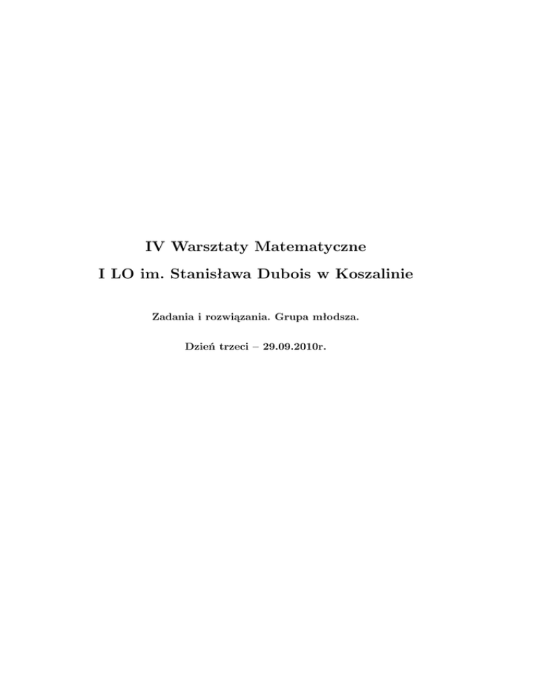IV Warsztaty Matematyczne I LO im. Stanisława Dubois w Koszalinie Zadania i rozwiązania. Grupa młodsza. Dzień trzeci – 29.09.2010r. Streszczenie Przygotowując zadania opierałem się o zasoby zadaniowe pochodzące z następujących źródeł: • Olimpiada Matematyczna (www.om.edu.pl) • Obóz Naukowy Olimpiady Matematycznej (www.om.edu.pl) • Olimpiada Matematyczna Gimnazjalistów (www.omg.edu.pl) • American Invitational Mathematics Examination (http://www.artofproblemsolving.com) • Norway Niels Henrik Abels Math Contest (http://www.artofproblemsolving.com) • „103 trigonometry problems”; Titu Andreescu, Zuming Feng; Birkhuser 2005. • Interactive Mathematics Miscellany and Puzzles (http://cut-the-knot.org) Część I Zadania 1 Test, dzień trzeci, grupa młodsza 1. Niech p1 < p2 < p3 < p4 < p5 będą liczbami pierwszymi takimi, że X = p2 − p1 = p3 − p2 = p4 − p3 = p5 − p4 . Wówczas: ......... ciąg ten musi zawierać liczbę 5 ......... X jest podzielne przez 5 ......... najmniejsza możliwa wartość p5 to 29. 2. Ile jest wszystkich liczb dwucyfrowych, które są podzielne przez każdą swoją cyfrę? ......... 9 ......... 14 ......... 15 3. Dany jest sześcian. Każdą z jego ścian malujemy jednym z kolorów: białym lub czarnym. Dwa kolorowania sześcianu, które są identyczne po obróceniu sześcianu uważamy za jedno i to samo kolorowanie. Ile jest możliwych kolorowań? ......... 10 ......... 15 ......... 20 4. Na sześcianie zaznaczono 27 punktów: wierzchołki sześcianu, środki krawędzi, środki ścian oraz środek sześcianu. Ile jest różnych prostych zawierających przynajmniej 3 z wyróżnionych punktów tego szećcianu? ......... 33 ......... 49 ......... 72 5. Na imprezie jest 6 chłopaków i pewna liczba dziewczyn. Niektore pary chłopców i dziewczyn łączy znajomość. Każdy chłopiec jest znajomym co najwyżej 3 dziewczyn. Dwie dziewczyny mają dokładnie 4 znajomych chłopców, a pozostałe mają dokładnie po 2 znajomych chłopców. Ile może być maksymalnie dziewczyn na tej imprezie? ......... 7 ......... 8 ......... więcej niż 8 6. Zawody w kręgle składają się z wielu serii. Marta uzyskała w poprzedniej serii 185 punktów. Pozwoliło jej to na podniesienie średniej z 176 do 177 punktów. Ile punktów Marta potrzebuje w następnej kolejce, aby zwiększyć średnią do 178? ......... 185 ......... 186 ......... 187 2 Konkurs, dzień trzeci, grupa młodsza 1. Rozważmy ciąg liczb całkowitych, który zaczyna się od elementów 1000, x, przy czym x > 0. Każdy kolejny element tego ciągu (od trzeciego począwszy) jest różnicą dwóch poprzednich. Gdy w ciągu pojawi się pierwsza liczba ujemna, przestajemy tworzyć kolejne elementy (np. dla x = 500 dostajemy ciąg 1000, 500, 500, 0, -500). Dla jakiego x dostaniemy ciąg maksymalnej długości? 2. Ciąg liczb rzeczywistych x1 , x2 , . . . , x100 ma tę własność, że dla każdego k od 1 do 100, liczba xk jest o k mniejsza od sumy pozostałych 99 elementów tego ciągu. Znajdź x50 . 3. Czy istnieje taki ostrosłup czworokątny, którego wszystkie ściany boczne są trójkątami prostokątnymi? 4. Dany jest trójkąt równoboczny ABC. Punkt D leży na prostej BC. Konstruujemy trójkąt równoboczny ADE taki, że punkt E leży po tej samej stronie prostej AD, co punkt C. Udowodnij, że niezależnie od wyboru punktu D punkty E leżą zawsze na prostej równoległej do odcinka AB. 5. W klasie nauczyciel zauważa, że każdy uczeń ma dokładnie 3 kumpli. Jeśli dwóch uczniów w jego klasie jest kumplami, to nie mają oni żadnego wspólnego kumpla. Wiadomo też, że jeśli dwóch uczniów w jego klasie nie jest kumplami, to mają oni wspólnego kumpla. Ile jest osób w tej klasie? 3 Część II Rozwiązania 4 Test, dzień trzeci, grupa młodsza 1. Niech p1 < p2 < p3 < p4 < p5 będą liczbami pierwszymi takimi, że X = p2 − p1 = p3 − p2 = p4 − p3 = p5 − p4 . Wówczas: ......... ciąg ten musi zawierać liczbę 5 ......... X jest podzielne przez 5 ......... najmniejsza możliwa wartość p5 to 29. Odpowiedź: • NIE, przykładem jest ciąg 7, 37, 67, 97, 127. • NIE, przykładem jest ciąg 5, 11, 17, 23, 29. (ale jeśli miałby nie zawierać 5, to odpowiedź jest TAK) • TAK, ciąg albo zawiera 5, albo jego różnica jest podzielna przez 5. Można też sprawdzić bezpośrednio. 2. Ile jest wszystkich liczb dwucyfrowych, które są podzielne przez każdą swoją cyfrę? ......... 9 ......... 14 ......... 15 Odpowiedź: • NIE, • TAK, te liczby to 11, 12, 15, 22, 24, 33, 36, 44, 48, 55, 66, 77, 88, 99 • NIE, 3. Dany jest sześcian. Każdą z jego ścian malujemy jednym z kolorów: białym lub czarnym. Dwa kolorowania sześcianu, które są identyczne po obróceniu sześcianu uważamy za jedno i to samo kolorowanie. Ile jest możliwych kolorowań? ......... 10 ......... 15 ......... 20 Odpowiedź: Idziemy przez przypadki, tzn. ustalamy ile ścian ma być kolorowanych na biało: • 0 ścian - wówczas jest 1 kolorowanie (wszystko na czarno) • 1 ściana - wówczas jest 1 kolorowanie • 2 ściany - wówczas są 2 kolorowania: albo ściany mają wspólną krawędź, albo leżą naprzeciw siebie • 3 ściany - wówczas są 2 kolorowania: albo ściany mają wspólny wierzchołek, albo nie • 4 ściany - tak jakbyśmy rozpatrywali problem dla dwóch czarnych - 2 kolorowania 5 • 5 ścian - tak jakbyśmy rozpatrywali problem dla jednej czarnej - 1 kolorowanie • 6 ścian - 1 kolorowanie • TAK, • NIE, • NIE, 4. Na sześcianie zaznaczono 27 punktów: wierzchołki sześcianu, środki krawędzi, środki ścian oraz środek sześcianu. Ile jest różnych prostych zawierających przynajmniej 3 z wyróżnionych punktów tego sześcianu? ......... 33 ......... 49 ......... 72 Odpowiedź: Warto podzielić rozwiązywanie na przypadek, gdy prosta przechodzi przez środek sześcianu i gdy nie przechodzi. Gdy nie przechodzi mamy 12 krawędzi, 12 przekątnych, 12 „ś
