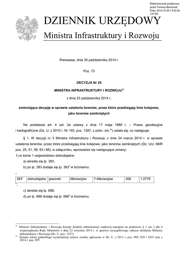 Elektronicznie podpisany przez Tomasz Behrendt Data: 2014.10.30 13:42:56 +01'00' DZIENNIK URZĘDOWY Ministra Infrastruktury i Rozwoju Warszawa, dnia 30 października 2014 r. Poz. 73 DECYZJA Nr 25 MINISTRA INFRASTRUKTURY I ROZWOJU1) z dnia 23 października 2014 r. zmieniająca decyzję w sprawie ustalenia terenów, przez które przebiegają linie kolejowe, jako terenów zamkniętych Na podstawie art. 4 ust. 2a ustawy z dnia 17 maja 1989 r. – Prawo geodezyjne i kartograficzne (Dz. U. z 2010 r. Nr 193, poz. 1287, z późn. zm.2)) ustala się, co następuje: § 1. W decyzji nr 3 Ministra Infrastruktury i Rozwoju z dnia 24 marca 2014 r. w sprawie ustalenia terenów, przez które przebiegają linie kolejowe, jako terenów zamkniętych (Dz. Urz. MIiR poz. 25, 51, 58, 63 i 66), w załączniku, wprowadza się następujące zmiany: 1) w tomie 1 województwo dolnośląskie: a) skreśla się lp. 383, b) po lp. 383 dodaje się lp. 3831 w brzmieniu: „ 3831 dolnośląskie jaworski Mściwojów 7-Mściwojów 306 1,0776 ”, c) skreśla się lp. 688, d) po lp. 688 dodaje się lp. 6881 w brzmieniu: 1) 2) Minister Infrastruktury i Rozwoju kieruje działem administracji rządowej transport na podstawie § 1 ust. 2 pkt 4 rozporządzenia Rady Ministrów z dnia 22 września 2014 r. w sprawie szczegółowego zakresu działania Ministra Infrastruktury i Rozwoju (Dz. U. poz. 1257). Zmiany tekstu jednolitego wymienionej ustawy zostały ogłoszone w Dz. U. z 2013 r. poz. 805, 829 i 1635 oraz z 2014 r. poz. 897. Dziennik Urzędowy Ministra Infrastruktury i Rozwoju –2– Poz. 73 „ 6881 dolnośląskie kłodzki Nowa Ruda 3-Nowa Ruda 326/7 6,9878 157/3 9,3183 1 1,2930 Cieszków 470/14 2,7978 Cieszków 470/13 4,7886 Borów 74/5 0,0328 Borów 75/14 0,2112 M. ”, e) skreśla się lp. 689, f) po lp. 689 dodaje się lp. 6891 w brzmieniu: „ 6891 dolnośląskie kłodzki Nowa Ruda M. 4-Nowa Ruda ”, g) skreśla się lp. 690, h) po lp. 690 dodaje się lp. 6901 w brzmieniu: „ 6901 dolnośląskie kłodzki Nowa Ruda 5-Nowa Ruda M. ”, i) skreśla się lp. 1695, j) po lp. 1695 dodaje się lp. 16951 w brzmieniu: „ 16951 dolnośląskie milicki Cieszków ”, k) skreśla się lp. 1696, l) po lp. 1696 dodaje się lp. 16961 w brzmieniu: „ 16961 dolnośląskie milicki Cieszków ”, m) skreśla się lp. 1840, 2084 i 2753, n) po lp. 2753 dodaje się lp. 27531 w brzmieniu: „ 27531 dolnośląskie trzebnicki Prusice ”, o) skreśla się lp. 2754, p) po lp. 2754 dodaje się lp. 27541 w brzmieniu: „ 27541 dolnośląskie trzebnicki Prusice ”, q) skreśla się lp. 2755, r) po lp. 2755 dodaje się lp. 27551 w brzmieniu: Dziennik Urzędowy Ministra Infrastruktury i Rozwoju –3– Poz. 73 „ 27551 dolnośląskie trzebnicki Prusice Borów 77/2 0,1947 Borów 82/1 0,1103 Borów 93/3 0,0029 Borów 115/1 0,1719 Borów 116/1 0,1016 118/6 0,1476 118/8 0,1220 ”, s) skreśla się lp. 2756, t) po lp. 2756 dodaje się lp. 27561 w brzmieniu: „ 27561 dolnośląskie trzebnicki Prusice ”, u) skreśla się lp. 2757, v) po lp. 2757 dodaje się lp. 27571 w brzmieniu: „ 27571 dolnośląskie trzebnicki Prusice ”, w) skreśla się lp. 2758, x) po lp. 2758 dodaje się lp. 27581 w brzmieniu: „ 27581 dolnośląskie trzebnicki Prusice ”, y) skreśla się lp. 2759, z) po lp. 2759 dodaje się lp. 27591 w brzmieniu: „ 27591 dolnośląskie trzebnicki Prusice ”, za) skreśla się lp. 2760, zb) po lp. 2760 dodaje się lp. 27601 w brzmieniu: „ 27601 dolnośląskie trzebnicki Prusice Borów ”, zc) skreśla się lp. 2761, zd) po lp. 2761 dodaje się lp. 27611 w brzmieniu: „ 27611 dolnośląskie trzebnicki Prusice Borów ”, ze) skreśla się lp. 2762, zf) po lp. 2762 dodaje się lp. 27621 w brzmieniu: Dziennik Urzędowy Ministra Infrastruktury i Rozwoju –4– Poz. 73 „ 27621 dolnośląskie trzebnicki Prusice Borów 122/2 0,2053 Borów 124/1 0,1438 Borów 125/1 0,0412 Borów 132/4 0,3047 132/5 0,2919 141/8 0,2516 208/1 0,0127 ”, zg) skreśla się lp. 2763, zh) po lp. 2763 dodaje się lp. 27631 w brzmieniu: „ 27631 dolnośląskie trzebnicki Prusice ”, zi) skreśla się lp. 2764, zj) po lp. 2764 dodaje się lp. 27641 w brzmieniu: „ 27641 dolnośląskie trzebnicki Prusice ”, zk) skreśla się lp. 2765, zl) po lp. 2765 dodaje się lp. 27651 w brzmieniu: „ 27651 dolnośląskie trzebnicki Prusice ”, zm) skreśla się lp. 2766, zn) po lp. 2766 dodaje się lp. 27661 w brzmieniu: „ 27661 dolnośląskie trzebnicki Prusice Borów ”, zo) skreśla się lp. 2767, zp) po lp. 2767 dodaje się lp. 27671 w brzmieniu: „ 27671 dolnośląskie trzebnicki Prusice Borów ”, zq) skreśla się lp. 2768, zr) po lp. 2768 dodaje się lp. 27681 w brzmieniu: „ 27681 dolnośląskie trzebnicki Prusice Borów ”, zs) skreśla się lp. 2769, zt) po lp. 2769 dodaje się lp. 27691 w brzmieniu: Dziennik Urzędowy Ministra Infrastruktury i Rozwoju –5– Poz. 73 „ 27691 dolnośląskie trzebnicki Prusice Borów 283/1 0,0546 420/1 0,0105 53/5 1,5214 ”, zu) skreśla się lp. 2973, zv) po lp. 2973 dodaje się lp. 29731 w brzmieniu: „ 29731 dolnośląskie trzebnicki Żmigród Korzeńsko ”; 2) w tomie 2 województwo kujawsko-pomorskie: a) skreśla się lp. 1035 i 2889, b) po lp. 2889 dodaje się lp. 28891 w brzmieniu: „ 28891 kujawsko- żniński Janowiec Wlkp. Gącz pomorskie ”; 3) w tomie 3 województwo lubelskie: a) lp. 481 i 482 otrzymuje brzmienie: „ 481 lubelskie bialski Terespol-gmina Małaszewicze 21/50 0,4522 482 lubelskie bialski Terespol-gmina Małaszewicze 21/51 99,0403 6 OBRĘB NR 6 4/5 11,3482 ”, b) lp. 16661 otrzymuje brzmienie: „ 16661 lubelskie rycki Dęblin ”, c) skreśla się lp. 1693, d) po lp. 1693 dodaje się lp. 16931 i 16932 w brzmieniu: „ 16931 lubelskie rycki Ryki 1 Ryki 1555/10 29,9424 16932 lubelskie rycki Ryki 1 Ryki 1555/11 0,2050 ”, e) skreśla się lp. 1773; 4) w tomie 5 województwo łódzkie: a) skreśla się lp. 244, b) po lp. 244 dodaje się lp. 2441 w brzmieniu: Dziennik Urzędowy Ministr