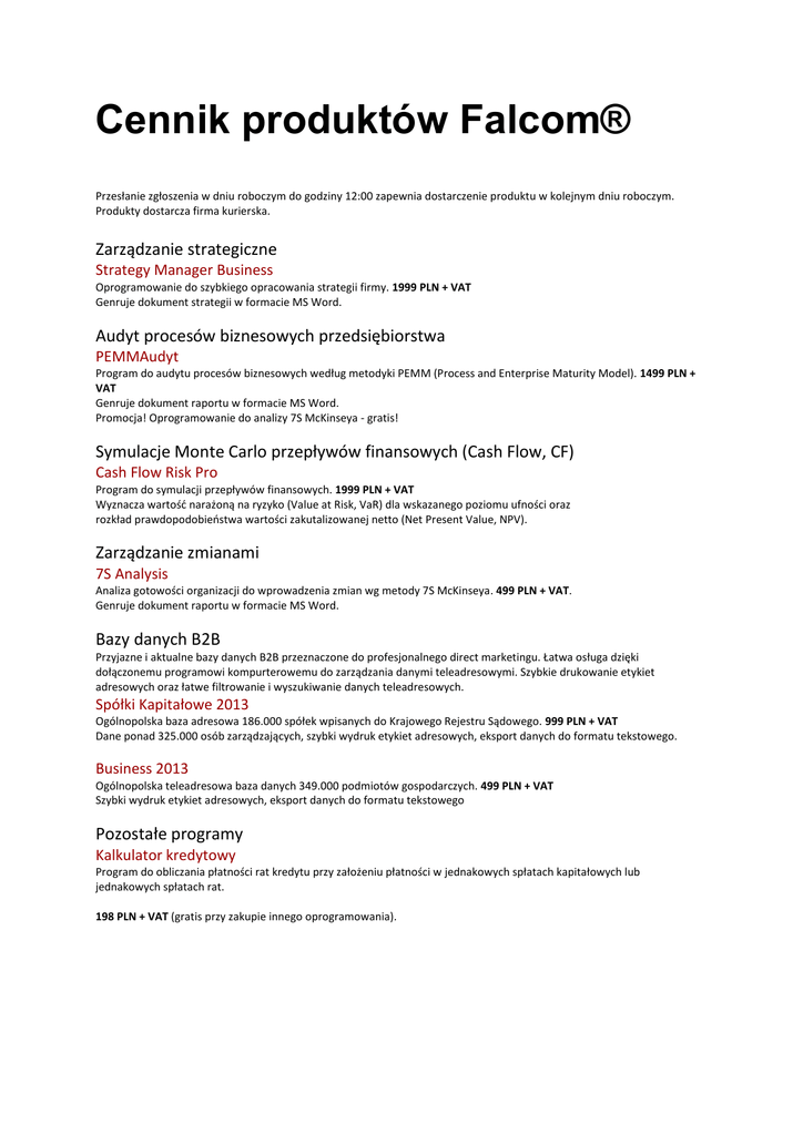 Cennik produktów Falcom® Przesłanie zgłoszenia w dniu roboczym do godziny 12:00 zapewnia dostarczenie produktu w kolejnym dniu roboczym. Produkty dostarcza firma kurierska. Zarządzanie strategiczne Strategy Manager Business Oprogramowanie do szybkiego opracowania strategii firmy. 1999 PLN + VAT Genruje dokument strategii w formacie MS Word. Audyt procesów biznesowych przedsiębiorstwa PEMMAudyt Program do audytu procesów biznesowych według metodyki PEMM (Process and Enterprise Maturity Model). 1499 PLN + VAT Genruje dokument raportu w formacie MS Word. Promocja! Oprogramowanie do analizy 7S McKinseya - gratis! Symulacje Monte Carlo przepływów finansowych (Cash Flow, CF) Cash Flow Risk Pro Program do symulacji przepływów finansowych. 1999 PLN + VAT Wyznacza wartośd narażoną na ryzyko (Value at Risk, VaR) dla wskazanego poziomu ufności oraz rozkład prawdopodobieostwa wartości zakutalizowanej netto (Net Present Value, NPV). Zarządzanie zmianami 7S Analysis Analiza gotowości organizacji do wprowadzenia zmian wg metody 7S McKinseya. 499 PLN + VAT. Genruje dokument raportu w formacie MS Word. Bazy danych B2B Przyjazne i aktualne bazy danych B2B przeznaczone do profesjonalnego direct marketingu. Łatwa osługa dzięki dołączonemu programowi kompurterowemu do zarządzania danymi teleadresowymi. Szybkie drukowanie etykiet adresowych oraz łatwe filtrowanie i wyszukiwanie danych teleadresowych. Spółki Kapitałowe 2013 Ogólnopolska baza adresowa 186.000 spółek wpisanych do Krajowego Rejestru Sądowego. 999 PLN + VAT Dane ponad 325.000 osób zarządzających, szybki wydruk etykiet adresowych, eksport danych do formatu tekstowego. Business 2013 Ogólnopolska teleadresowa baza danych 349.000 podmiotów gospodarczych. 499 PLN + VAT Szybki wydruk etykiet adresowych, eksport danych do formatu tekstowego Pozostałe programy Kalkulator kredytowy Program do obliczania płatności rat kredytu przy założeniu płatności w jednakowych spłatach kapitałowych lub jednakowych spłatach rat. 198 PLN + VAT (gratis przy zakupie innego oprogramowania).