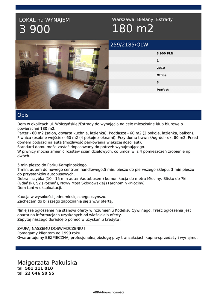 LOKAL na WYNAJEM 3 900 Warszawa, Bielany, Estrady 180 m2 259/2185/OLW 3 900 PLN 1 2010 Office 3 Perfect Opis Dom w okolicach ul. Wólczyńskiej/Estrady do wynajęcia na cele mieszkalne i/lub biurowe o powierzchni 180 m2. Parter - 60 m2 (salon, otwarta kuchnia, łazienka). Poddasze - 60 m2 (2 pokoje, łazienka, balkon). Piwnica (osobne wejście) - 60 m2 (4 pokoje z oknami). Przy domu trawnik/ogród - ok. 80 m2. Przed domem podjazd na auta (możliwość parkowania większej ilości aut). Standard domu może zostać dopasowany do potrzeb wynajmującego. W piwnicy można zmienić rozstaw ścian działowych, co umożliwi z 4 pomieszczeń zrobienie np. dwóch. 5 min pieszo do Parku Kampinoskiego. 7 min. autem do nowego centrum handlowego.5 min. pieszo do pierwszego sklepu. 3 min pieszo do przystanków autobusowych. Dobra i szybka (10 - 15 min autem/autobusem) komunikacja do metra Młociny. Blisko do 7ki (Gdańsk), S2 (Poznań), Nowy Most Skłodowskiej (Tarchomin -Młociny) Dom tani w eksploatacji. Kaucja w wysokości jednomiesięcznego czynszu. Zachęcam do bliższego zapoznania się z w/w ofertą. _____________________________________________________ Niniejsze ogłoszenie nie stanowi oferty w rozumieniu Kodeksu Cywilnego. Treść ogłoszenia jest oparta na informacjach uzyskanych od właściciela oferty. Zapytaj naszego doradcę o pomoc w uzyskaniu kredytu ! _____________________________________________________ ZAUFAJ NASZEMU DOŚWIADCZENIU ! Pomagamy klientom od 1990 roku. Gwarantujemy BEZPIECZNĄ, profesjonalną obsługę przy transakcjach kupna-sprzedaży i wynajmu. Małgorzata Pakulska tel. 501 111 010 tel. 22 646 50 55 ABRA-Nieruchomości email: [email protected] ABRA-Nieruchomości Powered by TCPDF (www.tcpdf.org)