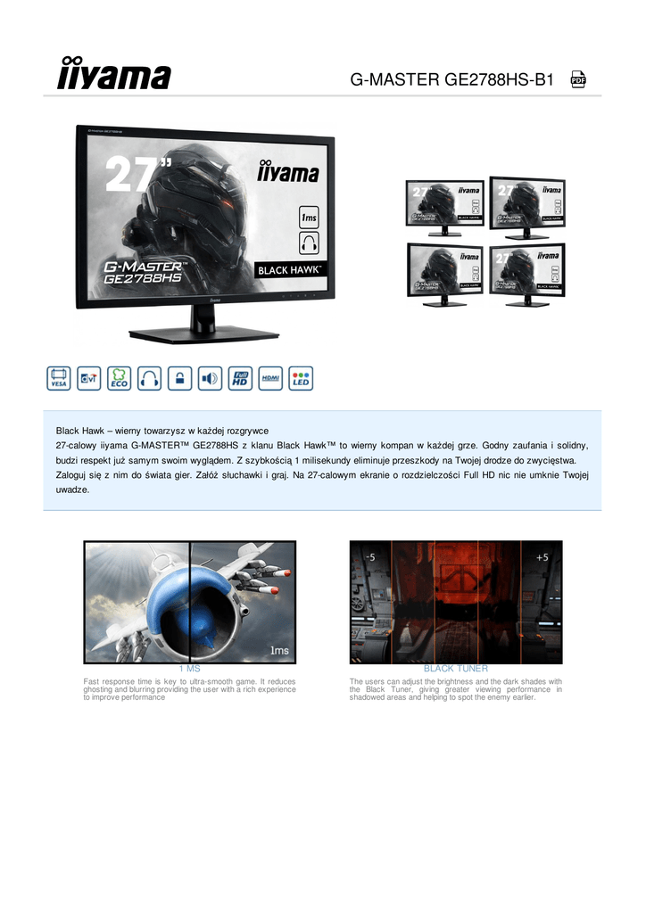 G-MASTER GE2788HS-B1 Black Hawk – wierny towarzysz w każdej rozgrywce 27-calowy iiyama G-MASTER™ GE2788HS z klanu Black Hawk™ to wierny kompan w każdej grze. Godny zaufania i solidny, budzi respekt już samym swoim wyglądem. Z szybkością 1 milisekundy eliminuje przeszkody na Twojej drodze do zwycięstwa. Zaloguj się z nim do świata gier. Załóż słuchawki i graj. Na 27-calowym ekranie o rozdzielczości Full HD nic nie umknie Twojej uwadze. 1 MS BLACK TUNER Fast response time is key to ultra-smooth game. It reduces ghosting and blurring providing the user with a rich experience to improve performance The users can adjust the brightness and the dark shades with the Black Tuner, giving greater viewing performance in shadowed areas and helping to spot the enemy earlier. 1. CHARAKTERYSTYKA OBRAZU PRZEKĄTNA EKRANU 27"; 68.6cm PANEL TN LED MAKS. POWIERZCHNIA ROBOCZA (WYS. X SZER.) 336.3 x 597.9 mm; 13.2" x 23.5" CZAS REAKCJI 1 ms KONTRAST 1000 : 1 typowy KONTRAST 12 000 000 : 1 ACR JASNOŚĆ 300 cd/m² typowa KĄT WIDZENIA CR>10 poziomo/pionowo: 170°/ 160°; prawo/lewo: 85°/ 85°; góra/dół: 80°/ 80° WYŚWIETLANE KOLORY 16.7 mln WIELKOŚĆ PLAMKI (PION. X POZ.) 0.311 x 0.311 mm ROZDZIELCZOŚĆ FIZYCZNA Full HD 1080p, 1920 x 1080 ( 2.1 megapiksela) CZĘSTOTLIWOŚĆ POZIOMA 30 - 80 KHz CZĘSTOTLIWOŚĆ PIONOWA 55 - 75 Hz SYNCHRONIZACJA Separate Sync FORMAT OBRAZU 16 : 9 2. INTERFEJSY CYFROWE WEJŚCIE SYGNAŁU VGA, DVI-D, HDMI HDCP tak WYJŚCIE SŁUCHAWKOWE tak WYJŚCIA wyjście słuchawkowe 3. WŁAŚCIWOŚCI KOMPATYBILNOŚĆ Z APPLE Wszystkie monitory iiyama są kompatybilne z komputerami Apple Macintosh. PLUG & PLAY VESA DDC2B™ przy pomocy On-Screen-Display w 8 językach (EN, FR, DE, NL, PL, RU, JP, Chiński(tradycyjny i REGULACJA PARAMETRÓW uproszczony) i 5 przycisków (Power, Wybierz/ Wejście sygnału, W górę/ Audio, W dól/ i-Style Colour, Menu) regulacje obrazu (kontrast, jasność, OD, ACR, ECO), wybor wejścia, regulacje audio (głośność, wycisz, HDMI audio), zapisz ustawienia użytkownika, ustawienia kolorów, ręczne ustawienia obrazu (i- PARAMETRY REGULOWANE style Colour, pozycja pozioma/pionowa, taktowanie, faza, ostrość, głębia czerni, zakres HDMI RGB, regulacje trybu Video, redukcja niebieskiego świtała), konfiguracje menu (język, pozycja menu OSD, wygaszenie menu OSD, tło menu OSD, logo startowe, LED), informacje, przywróć GŁOŚNIKI 2 x 2.5 W (Stereo) ZABEZPIECZENIE PRZED KRADZIEŻĄ kompatybilny z Kensington-lock™ CERTYFIKATY CE, TÜV-Bauart, CU, VCCI-B, PSE KĄT POCHYLENIA 20° w górę; 5° w dół STANDARD VESA 100 x 100 mm KOLOR czarny 4. AKCESORIA STEROWNIKI Windows 95 / 98 / 2000 / ME / XP / Vista/ 7/ 8/ 10 AKCESORIA W ZESTAWIE kabel zasilający, kabel DVI-D, kabel Audio, skrócona instrukcja obsługi, instrukcja bezpieczeństwa 5. ZARZĄDZANIE ENERGIĄ ZASILANIE AC 100 - 240 V, 50 / 60 Hz ZASILACZ wewnętrzny ZUŻYCIE ENERGII 30 W typowo; maks. 0.5 W w trybie Power management ZARZĄDZANIE ENERGIĄ VESA DPMS, ENERGY STAR® 6. KLASA ENERGETYCZNA (EU) KLASA EFEKTYWNOŚCI ENERGETYCZNEJ B PRZEKĄTNA OBSZARU WIDOCZNEGO 61 cm; 24"; (segment 24'') Zgodnie z rozporządzeniem (EU) 1062/2010. *W oparciu o telewizor pracujący 4 godziny dziennie przez 365 dni w roku. Rzeczywiste zużycie zależy od faktycznego użytkowania. 7. WYMIARY / WAGA WYMIARY (SZER. X WYS. X GŁ.) 643.5 x 462 x 242 mm WAGA 4.6 kg Wszystkie znaki towarowe zastrzeżone. Pomyłki i wprowadzanie zmian zastrzeżone. Specyfikacje produktów mogą ulec zmianie bez wcześniejszego zawiadomienia. Wszystkie monitory LCD iiyama są zgodne z normą ISO-9241-307:2008 określającą liczbę i rodzaj defektów matrycy. © IIYAMA CORPORATION ( ). ALL RIGHTS RESERVED.