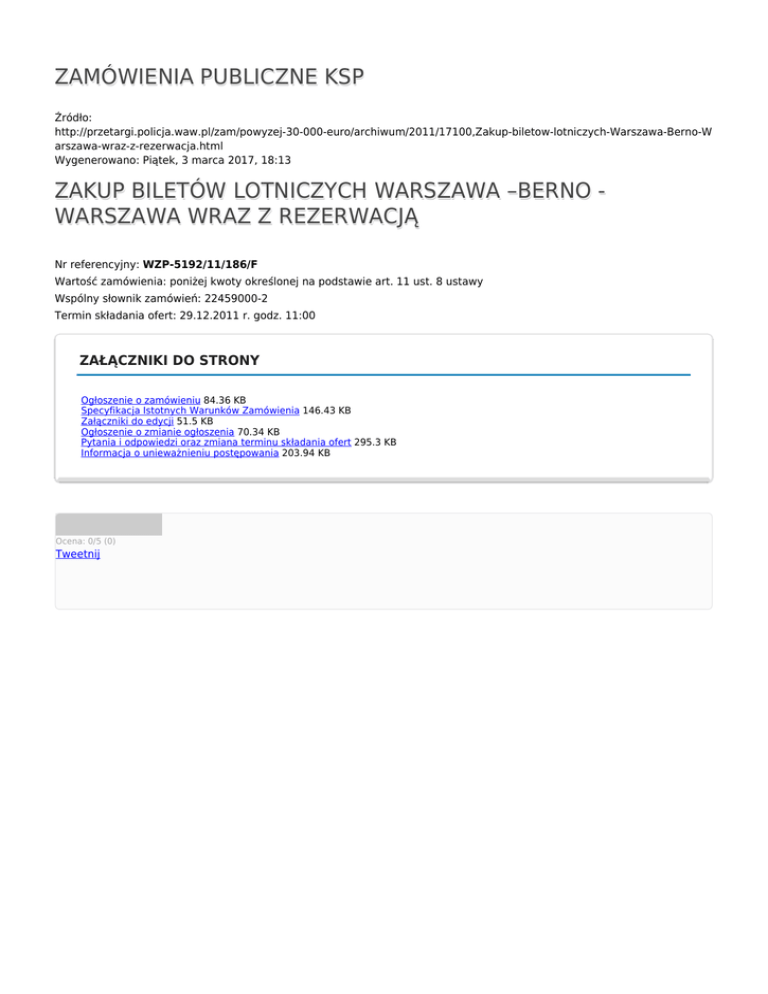ZAMÓWIENIA PUBLICZNE KSP Źródło: http://przetargi.policja.waw.pl/zam/powyzej-30-000-euro/archiwum/2011/17100,Zakup-biletow-lotniczych-Warszawa-Berno-W arszawa-wraz-z-rezerwacja.html Wygenerowano: Piątek, 3 marca 2017, 18:13 ZAKUP BILETÓW LOTNICZYCH WARSZAWA –BERNO WARSZAWA WRAZ Z REZERWACJĄ Nr referencyjny: WZP-5192/11/186/F Wartość zamówienia: poniżej kwoty określonej na podstawie art. 11 ust. 8 ustawy Wspólny słownik zamówień: 22459000-2 Termin składania ofert: 29.12.2011 r. godz. 11:00 ZAŁĄCZNIKI DO STRONY Ogłoszenie o zamówieniu 84.36 KB Specyfikacja Istotnych Warunków Zamówienia 146.43 KB Załączniki do edycji 51.5 KB Ogłoszenie o zmianie ogłoszenia 70.34 KB Pytania i odpowiedzi oraz zmiana terminu składania ofert 295.3 KB Informacja o unieważnieniu postępowania 203.94 KB Ocena: 0/5 (0) Tweetnij