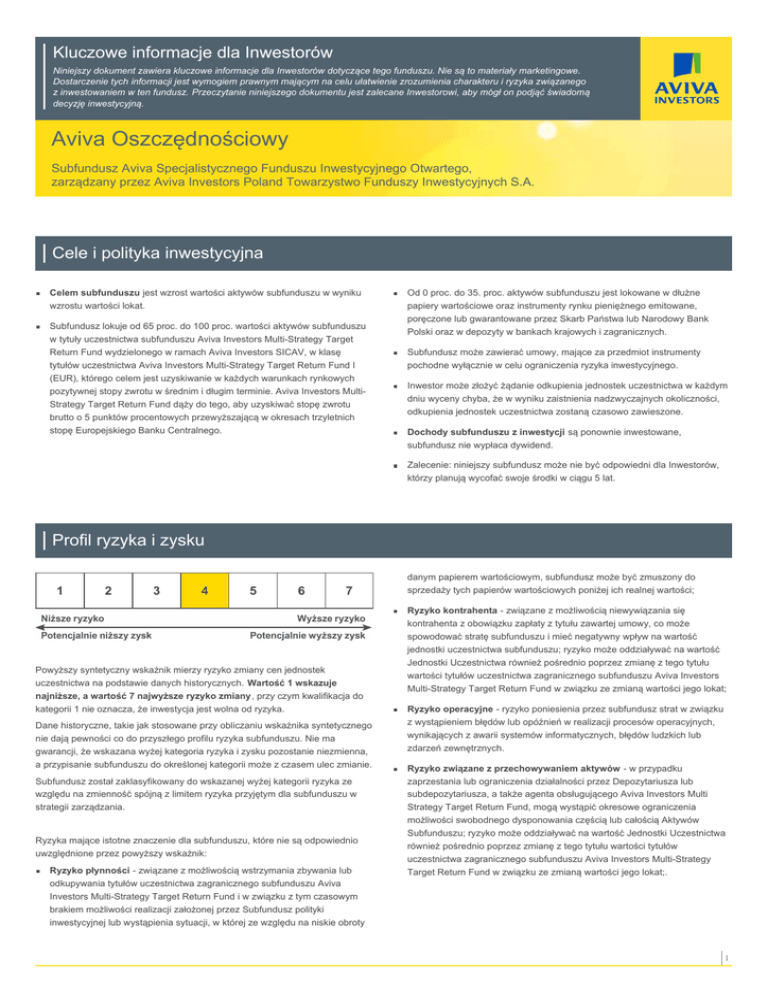 Kluczowe informacje dla Inwestorów Niniejszy dokument zawiera kluczowe informacje dla Inwestorów dotyczące tego funduszu. Nie są to materiały marketingowe. Dostarczenie tych informacji jest wymogiem prawnym mającym na celu ułatwienie zrozumienia charakteru i ryzyka związanego z inwestowaniem w ten fundusz. Przeczytanie niniejszego dokumentu jest zalecane Inwestorowi, aby mógł on podjąć świadomą decyzję inwestycyjną. Aviva Oszczędnościowy Subfundusz Aviva Specjalistycznego Funduszu Inwestycyjnego Otwartego, zarządzany przez Aviva Investors Poland Towarzystwo Funduszy Inwestycyjnych S.A. Cele i polityka inwestycyjna Celem subfunduszu jest wzrost wartości aktywów subfunduszu w wyniku wzrostu wartości lokat. Od 0 proc. do 35. proc. aktywów subfunduszu jest lokowane w dłużne papiery wartościowe oraz instrumenty rynku pieniężnego emitowane, poręczone lub gwarantowane przez Skarb Państwa lub Narodowy Bank Polski oraz w depozyty w bankach krajowych i zagranicznych. Subfundusz lokuje od 65 proc. do 100 proc. wartości aktywów subfunduszu w tytuły uczestnictwa subfunduszu Aviva Investors Multi-Strategy Target Return Fund wydzielonego w ramach Aviva Investors SICAV, w klasę tytułów uczestnictwa Aviva Investors Multi-Strategy Target Return Fund I (EUR), którego celem jest uzyskiwanie w każdych warunkach rynkowych pozytywnej stopy zwrotu w średnim i długim terminie. Aviva Investors MultiStrategy Target Return Fund dąży do tego, aby uzyskiwać stopę zwrotu brutto o 5 punktów procentowych przewyższającą w okresach trzyletnich stopę Europejskiego Banku Centralnego. Subfundusz może zawierać umowy, mające za przedmiot instrumenty pochodne wyłącznie w celu ograniczenia ryzyka inwestycyjnego. Inwestor może złożyć żądanie odkupienia jednostek uczestnictwa w każdym dniu wyceny chyba, że w wyniku zaistnienia nadzwyczajnych okoliczności, odkupienia jednostek uczestnictwa zostaną czasowo zawieszone. Dochody subfunduszu z inwestycji są ponownie inwestowane, subfundusz nie wypłaca dywidend. Zalecenie: niniejszy subfundusz może nie być odpowiedni dla Inwestorów, którzy planują wycofać swoje środki w ciągu 5 lat. Profil ryzyka i zysku 1 2 3 4 5 6 danym papierem wartościowym, subfundusz może być zmuszony do sprzedaży tych papierów wartościowych poniżej ich realnej wartości; 7 Ryzyko kontrahenta - związane z możliwością niewywiązania się kontrahenta z obowiązku zapłaty z tytułu zawartej umowy, co może spowodować stratę subfunduszu i mieć negatywny wpływ na wartość jednostki uczestnictwa subfunduszu; ryzyko może oddziaływać na wartość Jednostki Uczestnictwa również pośrednio poprzez zmianę z tego tytułu wartości tytułów uczestnictwa zagranicznego subfunduszu Aviva Investors Multi-Strategy Target Return Fund w związku ze zmianą wartości jego lokat; Powyższy syntetyczny wskaźnik mierzy ryzyko zmiany cen jednostek uczestnictwa na podstawie danych historycznych. Wartość 1 wskazuje najniższe, a wartość 7 najwyższe ryzyko zmiany, przy czym kwalifikacja do kategorii 1 nie oznacza, że inwestycja jest wolna od ryzyka. Ryzyko operacyjne - ryzyko poniesienia przez subfundusz strat w związku z wystąpieniem błędów lub opóźnień w realizacji procesów operacyjnych, wynikających z awarii systemów informatycznych, błędów ludzkich lub zdarzeń zewnętrznych. Dane historyczne, takie jak stosowane przy obliczaniu wskaźnika syntetycznego nie dają pewności co do przyszłego profilu ryzyka subfunduszu. Nie ma gwarancji, że wskazana wyżej kategoria ryzyka i zysku pozostanie niezmienna, a przypisanie subfunduszu do określonej kategorii może z czasem ulec zmianie. Ryzyko związane z przechowywaniem aktywów - w przypadku zaprzestania lub ograniczenia działalności przez Depozytariusza lub subdepozytariusza, a także agenta obsługującego Aviva Investors Multi Strategy Target Return Fund, mogą wystąpić okresowe ograniczenia możliwości swobodnego dysponowania częścią lub całością Aktywów Subfunduszu; ryzyko może oddziaływać na wartość Jednostki Uczestnictwa również pośrednio poprzez zmianę z tego tytułu wartości tytułów uczestnictwa zagranicznego subfunduszu Aviva Investors Multi-Strategy Target Return Fund w związku ze zmianą wartości jego lokat;. Subfundusz został zaklasyfikowany do wskazanej wyżej kategorii ryzyka ze względu na zmienność spójną z limitem ryzyka przyjętym dla subfunduszu w strategii zarządzania. Ryzyka mające istotne znaczenie dla subfunduszu, które nie są odpowiednio uwzględnione przez powyższy wskaźnik: Ryzyko płynności - związane z możliwością wstrzymania zbywania lub odkupywania tytułów uczestnictwa zagranicznego subfunduszu Aviva Investors Multi-Strategy Target Return Fund i w związku z tym czasowym brakiem możliwości realizacji założonej przez Subfundusz polityki inwestycyjnej lub wystąpienia sytuacji, w której ze względu na niskie obroty 1 Opłaty Opłaty jednorazowe pobierane przed lub po dokonaniu inwestycji Opłata za nabycie jednostek uczestnictwa 2,00 % Opłata za odkupienie jednostek uczestnictwa 0,00 % Jest to maksymalna kwota, jaka może zostać pobrana z Państwa środków przed ich zainwestowaniem/przed wypłaceniem zysków z inwestycji. Opłaty pobierane z subfunduszu w ciągu roku Opłaty bieżące 1,70 % Opłaty pobierane z subfunduszu w określonych warunkach szczególnych Opłata za wyniki brak Przedstawione stawki opłat za nabycie i odkupienie jednostek uczestnictwa są stawkami maksymalnymi. W niektórych przypadkach Inwestor może płacić niższą opłatę. Informacje dotyczące bieżącej wysokości opłat Inwestor może uzyskać u dystrybutorów. Podana kwota opłat bieżących ma charakter szacunkowy. W związku z tym, że subfundusz został utworzony w dniu 9 listopada 2015 roku, ww. wartość liczbowa, określająca wysokość opłat bieżących opiera się na zakładanej stawce opłaty za zarządz