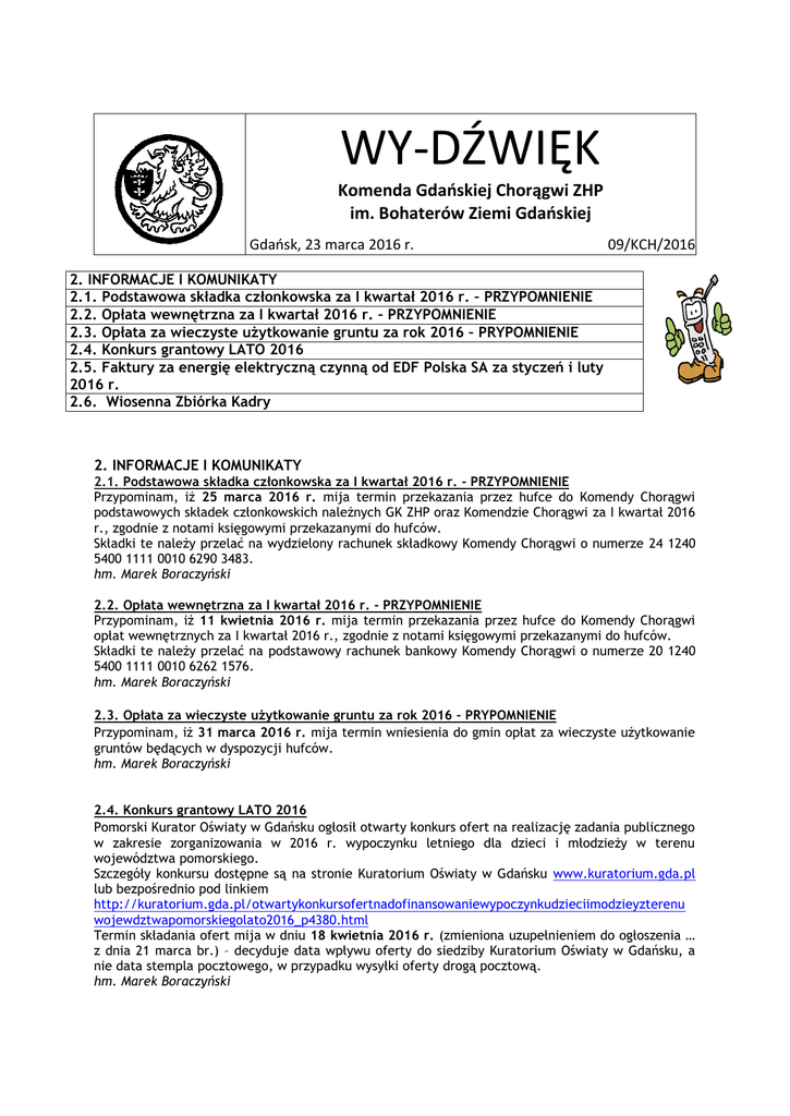 WY-DŹWIĘK Komenda Gdańskiej Chorągwi ZHP im. Bohaterów Ziemi Gdańskiej Gdańsk, 23 marca 2016 r. 09/KCH/2016 2. INFORMACJE I KOMUNIKATY 2.1. Podstawowa składka członkowska za I kwartał 2016 r. – PRZYPOMNIENIE 2.2. Opłata wewnętrzna za I kwartał 2016 r. – PRZYPOMNIENIE 2.3. Opłata za wieczyste użytkowanie gruntu za rok 2016 – PRYPOMNIENIE 2.4. Konkurs grantowy LATO 2016 2.5. Faktury za energię elektryczną czynną od EDF Polska SA za styczeń i luty 2016 r. 2.6. Wiosenna Zbiórka Kadry 2. INFORMACJE I KOMUNIKATY 2.1. Podstawowa składka członkowska za I kwartał 2016 r. - PRZYPOMNIENIE Przypominam, iż 25 marca 2016 r. mija termin przekazania przez hufce do Komendy Chorągwi podstawowych składek członkowskich należnych GK ZHP oraz Komendzie Chorągwi za I kwartał 2016 r., zgodnie z notami księgowymi przekazanymi do hufców. Składki te należy przelać na wydzielony rachunek składkowy Komendy Chorągwi o numerze 24 1240 5400 1111 0010 6290 3483. hm. Marek Boraczyński 2.2. Opłata wewnętrzna za I kwartał 2016 r. - PRZYPOMNIENIE Przypominam, iż 11 kwietnia 2016 r. mija termin przekazania przez hufce do Komendy Chorągwi opłat wewnętrznych za I kwartał 2016 r., zgodnie z notami księgowymi przekazanymi do hufców. Składki te należy przelać na podstawowy rachunek bankowy Komendy Chorągwi o numerze 20 1240 5400 1111 0010 6262 1576. hm. Marek Boraczyński 2.3. Opłata za wieczyste użytkowanie gruntu za rok 2016 – PRYPOMNIENIE Przypominam, iż 31 marca 2016 r. mija termin wniesienia do gmin opłat za wieczyste użytkowanie gruntów będących w dyspozycji hufców. hm. Marek Boraczyński 2.4. Konkurs grantowy LATO 2016 Pomorski Kurator Oświaty w Gdańsku ogłosił otwarty konkurs ofert na realizację zadania publicznego w zakresie zorganizowania w 2016 r. wypoczynku letniego dla dzieci i młodzieży w terenu województwa pomorskiego. Szczegóły konkursu dostępne są na stronie Kuratorium Oświaty w Gdańsku www.kuratorium.gda.pl lub bezpośrednio pod linkiem http://kuratorium.gda.pl/otwartykonkursofertnadofinansowaniewypoczynkudzieciimodzieyzterenu wojewdztwapomorskiegolato2016_p4380.html Termin składania ofert mija w dniu 18 kwietnia 2016 r. (zmieniona uzupełnieniem do ogłoszenia … z dnia 21 marca br.) – decyduje data wpływu oferty do siedziby Kuratorium Oświaty w Gdańsku, a nie data stempla pocztowego, w przypadku wysyłki oferty drogą pocztową. hm. Marek Boraczyński 2.5. Faktury za energię elektryczną czynną od EDF Polska SA za styczeń i luty 2016 r. Zgodnie z informacjami przekazanymi komendantom hufców podczas zbiórki w dniu 19 marca br. Komenda Chorągwi przekaże do hufców noty księgowe z obciążeniami za miesiące styczeń i luty na podstawie zbiorczych faktur wystawionych przez EDF Polska SA dla Chorągwi. Z uwagi na dużą objętość tych faktur (każda liczy po 8 stron), zostaną one przesłane do hufców drogą elektroniczna na adresy służbowe hufców (@zhp.pl). Wedle zapewnień naszego opiekuna ze strony EDF Polska SA poczynając od miesiąca marca faktury (wystawione w IV 2016 r.) będą wystawiane i wysyłane bezpośrednio do hufców. Bardzo proszę o możliwie szybkie uregulowanie tych not ze względu na przeterminowanie faktury za styczeń i zbliżający się termin płatności faktury za luty br. hm. Marek Boraczyński 2.6. Wiosenna Zbiórka Kadry Serdecznie zapraszamy na Wiosenną Zbiórkę Kadry, czyli warsztaty programowo-metodyczne kadry naszej chorągwi. Zgłoszenia zostaną otwarte 18 marca br. Termin: 08-10.04.2016r. Miejsce: Stare Pole Uczestnicy: kadra pracująca w drużynach z poszczególnymi metodykami (rocznikowo przynajmniej 16 lat) Koszt: 30 zł Celem warsztatów jest poszerzanie repertuaru programowego kadry drużyn oraz podniesienie jego, jakości. Wiosenna Zbiórka Kadry będzie inspirującym programowo i wychowawczo wydarzeniem, które pozwoli na wymianę doświadczeń i lepsze poznanie się kadry chorągwi. Skupimy się na unowocześnieniu programu, przy jednoczesnym zachowaniu podstawowych harcerskich wartości i celów wychowawczych. Zgłoszenia: http://tinyurl.com/z3kk6xa Zapraszamy na funpage Wiosennej Zbiórki Kadry: https://www.facebook.com/events/1012816242090548/ Wszelkie pytania prosimy zadawać mailowo na adres: [email protected] oraz pod numerem telefonu: 508 169 625 Do zobaczenia w kwietniu! phm. Aleksandra Golecka