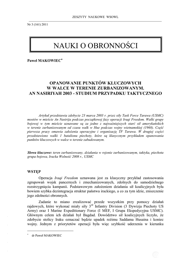 ZESZYTY NAUKOWE WSOWL Nr 3 (161) 2011 NAUKI O OBRONNOŚCI Paweł MAKOWIEC OPANOWANIE PUNKTÓW KLUCZOWYCH W WALCE W TERENIE ZURBANIZOWANYM. AN NASIRIYAH 2003 - STUDIUM PRZYPADKU TAKTYCZNEGO Artykuł przedstawia zdobycie 23 marca 2003 r. przez siły Task Force Tarawa (USMC) mostów w mieście An Nasirija podczas początkowej fazy operacji Iraqi Freedom. Walki grupy bojowej w tym mieście uznawane są za jedno z najważniejszych starć sił amerykańskich w terenie zurbanizowanym od czasu walk w Hue podczas wojny wietnamskiej (1968). Część pierwsza pracy omawia założenia operacyjne i organizację TF Tarawa. W drugiej części przedstawiono walki 1 batalionu piechoty, które są klasycznym przykładem opanowania punktów kluczowych w walce w terenie zabudowanym. Słowa kluczowe: teren zurbanizowany, działania w rejonie zurbanizowanym, taktyka, piechota grupa bojowa, Iracka Wolność 2008 r., USMC WSTĘP - - - - - Operacja Iraqi Freedom uznawana jest za klasyczny przykład zastosowania zgrupowań wojsk pancernych i zmechanizowanych, zdolnych do samodzielnego rozstrzygnięcia kampanii. Podstawowym założeniem działania sił koalicyjnych była bowiem szybka dezintegracja struktur państwa irackiego, a co za tym idzie, zniszczenie jego zdolności obronnych. Zadanie to miano zrealizować przede wszystkim przy pomocy działań rajdowych, które wykonać miały siły 3rd Infantry Division (3 Dywizja Piechoty US Army) oraz I Marine Expeditionary Force (I MEF, I Grupa Ekspedycyjna USMC). Głównym celem ich działań był Bagdad. Dowództwo sił koalicyjnych liczyło, że zdobycie stolicy Iraku oznaczać będzie upadek reżimu Saddama Husaina i koniec wojny. Jednym z priorytetów operacji była więc szybkość uderzenia w kierunku dr Paweł MAKOWIEC Paweł MAKOWIEC Bagdadu, co miało nie pozwolić Irakijczykom na zorganizowanie poważniejszego oporu. W celu utrzymania wysokiego tempa natarcia na stolicę, zakładano wykorzystanie do przeprowadzenia go sieci nowoczesnych autostrad istniejących w Iraku. Wobec powyższych założeń, kluczowymi w skali całej operacji stały się wszelkie obiekty infrastruktury drogowej (węzły drogowe, przeprawy itp.). Ich opanowanie i późniejsze wykorzystanie przez siły amerykańskie mogło zadecydować o losach wojny. W planowaniu operacji, jako jeden z warunków jej powodzenia, przyjęto również unikanie walki o ośrodki miejskie, w których ewentualny irakijski opór mógł skutecznie zatrzymać oddziały US Army i USMC. 1. AN NASIRIJA W AMERYKAŃSKICH PLANACH OPERACYJNYCH 1.1. Założenia operacyjne I MEF w operacji Iraqi Freedom W założeniu I MEF prowadzić miała działania na północnej (prawej) flance wojsk koalicyjnych. Ich celem było opanowanie Basry i zabezpieczenie pól naftowych w rejonie południowego Iraku (pola naftowe Rumayla), a także obejście irackiej obrony na linii rzeki Eufrat w rejonie miasta An Nasirija i uderzenie w kierunku Bagdadu z północnego wschodu (przez Al Kut). Pierwotnie siły USMC miały wykorzystać do przekroczenia rzeki nieukończony most na autostradzie nr 1, nie angażując się w zbędne walki, które mogły osłabić jej potencjał bojowy i spowolnić marsz na stolicę Iraku1. Drugim celem działań grupy było miasto Al Kut, które uważano od początku planowania operacji za punkt ciężkości na tym odcinku frontu. Jego opanowanie oznaczało uzyskanie możliwości działania na północnym brzegu rzeki Tygrys oraz odcięcie sił III i IV Korpusu armii irackiej rozmieszczonych na granicy irańsko – irackiej od reszty kraju, co mogło, wobec powodzenia natarcia na stolicę Iraku, spowodować ich kapitulację bez walki. Również symboliczne znaczenie miałoby rozbicie oddziałów stacjonującej w Al Kut dywizji Bagdad Irackiej Gwardii Republikańskiej2. - W prowadzeniu działań w kierunku Al Kut wykorzystać zamierzano autostradę nr 7 łączącą An Nasiriję z Al Kut, szybko jednak planiści USMC dostrzegli podstawową wadę przyjętego rozwiązania. Unikanie za wszelką cenę walki w mieście i ominięcie An Nasiriji oznaczało konieczność wykorzystania szeregu dróg podrzędnych, którymi poszczególne grupy bojowe dotarłyby do autostrady nr 7 i ruszyły na Al Kut. Manewrowanie dużymi siłami w trudnym terenie pełnym bagien i kanałów, zdecydowanie opóźniłoby marsz w kierunku zasadniczego celu działania. Powrócono więc do jednej z pierwotnych koncepcji wykorzystania mostów w An Nasiriji, które zapewniały bezpośrednie połączenie z autostradą nr 73. Ważnym elementem było też wykorzystanie działań jednostek 3 Dywizji Piechoty, które początkowo zakładały: zajęcie lotniska w Tallil, oczyszczenie południowej części An Nasiriji, opanowanie mostu autostrady nr 1 i izolację miasta As Samawah4. 1 - 2 3 - - - 4 8 M. Groen, With the 1st Marine Division in Iraq 2003, Quantico 2006, s. 16. Ibidem, s. 15 – 16. Ibidem, s. 100 – 101. Most autostrady nr 1 występował w planowaniu jako Objective CLAY. G. Fontenot, E. Degen, D. Tohn, On Point. The United States Army in Operation IRAQI FREEDOM, Washington 2004, s. 88. OPANOWANIE PUNKTÓW KLUCZOWYCH W WALCE W TERENIE ZURBANIZOWANYM… Legenda: 1. most na rz. Eufrat, 2. most na Kanale Saddama, 3. skrzyżowanie T Intersection. W kwadratach umieszczono ujęte w tekście numery autostrad. Rys. 1. Schemat An Nasiriji Źródło: Opracowanie własne 1.2. An Nasirija An Nasirija (An Nasiriyah) jest dużym miastem położonym w południowym Iraku. W 2002 r. zamieszkiwało w nim 535 tys. osób i zajmowało powierzchnię około 20 km2. Stanowiło również ważny węzeł komunikacyjny (komunikacja drogowa i kolejowa) i ośrodek przemysłowy5. - O strategicznym znaczeniu Nasiriji decydowały dwa mosty stanowiące połączenie autostrady nr 8 (Bagdad – Basra) i nr 7 (Al Kut – An Nasirija). Pierwszy z nich wybudowano na Eufracie, drugi na Kanale Saddama. Ich podstawową zaletą było to, że znajdowały się na wschodnich obrzeżach miasta