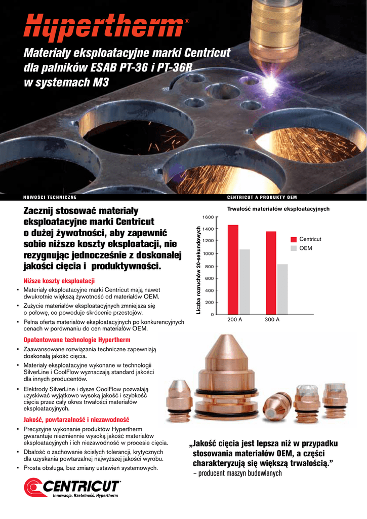 Powermax Selection Guide Materiały eksploatacyjne marki Centricut dla palników ESAB PT-36 i PT-36R w systemach M3 ® N o w o ś c i t e c h n i czn e Niższe koszty eksploatacji • Materiały eksploatacyjne marki Centricut mają nawet dwukrotnie większą żywotność od materiałów OEM. • Zużycie materiałów eksploatacyjnych zmniejsza się o połowę, co powoduje skrócenie przestojów. • Pełna oferta materiałów eksploatacyjnych po konkurencyjnych cenach w porównaniu do cen materiałów OEM. Trwałość materiałów eksploatacyjnych 1600 Liczba rozruchów 20-sekundowych Z acznij stosować materiały eksploatacyjne marki Centricut o dużej żywotności, aby zapewnić sobie niższe koszty eksploatacji, nie rezygnując jednocześnie z doskonałej jakości cięcia i produktywności. C e n t r i c u t a p r o d u k t y OE M 1400 Centricut 1200 OEM 1000 800 600 400 200 0 200 A 300 A Opatentowane technologie Hypertherm • Z aawansowane rozwiązania techniczne zapewniają doskonałą jakość cięcia. • Materiały eksploatacyjne wykonane w technologii SilverLine i CoolFlow wyznaczają standard jakości dla innych producentów. • E lektrody SilverLine i dysze CoolFlow pozwalają uzyskiwać wyjątkowo wysoką jakość i szybkość cięcia przez cały okres trwałości materiałów eksploatacyjnych. Jakość, powtarzalność i niezawodność • P recyzyjne wykonanie produktów Hypertherm gwarantuje niezmiennie wysoką jakość materiałów eksploatacyjnych i ich niezawodność w procesie cięcia. • Dbałość o zachowanie ścisłych tolerancji, krytycznych dla uzyskania powtarzalnej najwyższej jakości wyrobu. • Prosta obsługa, bez zmiany ustawień systemowych. „Jakość cięcia jest lepsza niż w przypadku stosowania materiałów OEM, a części charakteryzują się większą trwałością.” – producent maszyn budowlanych M ateriały eksploatacyjne Centricut dla palników ESAB PT-36 niosą wartość dodaną dla klientów stosujących procesy cięcia plazmą. • Większa trwałość • Wyjątkowo wysoka jakość cięcia • Duża szybkość cięcia • Powtarzalna jakość produktu • Konkurencyjne ceny • Możliwość stosowania do wszystkich procesów cięcia • Prosta instalacja typu „plug and play”, bez potrzeby wprowadzania dodatkowych ustawień Właściwości i zalety Technologia SilverLine • C zołowa końcówka z litego srebra zapewnia maksymalne chłodzenie i minimalne zużycie elektrody hafnowej. Technologia Centricut a OEM Elektroda SilverLine Czołowa końcówka z litego srebra Elektroda OEM Wkładka srebrna • G rzebienie przepływu poprawiają charakterystykę rozruchu i przyczyniają się do zwiększenia trwałości. • N owatorskie opracowanie sposobu przepływu płynu chłodzącego pozwala obniżyć temperaturę elektrody i zwiększyć jej trwałość. Zoptymalizowana ścieżka przepływu gazu plazmowego Zoptymalizowana ścieżka przepływu płynu chłodzącego Mniejsza efektywność chłodzenia • W ytrzymała końcówka z zespawanych warstw miedzi i srebra zapewnia niezmiennie wysoką jakość cięcia. Technologia chłodzenia dyszy CoolFlow • Z aprojektowane komputerowo kontury umożliwiają optymalizację przepływu płynu chłodzącego w dyszy i znaczne obniżenie temperatury pracy. Dysza CoolFlow Dysza OEM Grube ścianki dyszy Cieńsze ścianki dyszy Dysza CoolFlow Dysza OEM Zoptymalizowana ścieżka płynu chłodzącego Ograniczone chłodzenie dyszy Głęboki rowek chłodziwa Niewydajne chłodzenie • G rubsze ścianki dyszy skuteczniej rozpraszają ciepło powstające w otworze, obniżając temperaturę. • N iższa temperatura dyszy bezpośrednio przyczynia się do zwiększenia trwałości wszystkich materiałów eksploatacyjnych. Porównanie systemów chłodzenia Z astosowanie programu komputerowego o nazwie Computational Fluid Dynamics do analizy chłodzenia elektrody i dyszy umożliwiło inżynierom oraz materiałoznawcom Hypertherm optymalizację jakości materiałów eksploatacyjnych marki Centricut do najwyższego poziomu. 650°C 710°C rodukty marki Centricut posiadają gwarancję jakości P Hypertherm – światowego lidera w technologii cięcia plazmowego • Zastosowanie opatentowanych technologii Hypertherm do produkcji materiałów eksploatacyjnych przyniosło wymierny wzrost jakości • Stosowane przez Hypertherm metody lean manufacturing (odchudzonej produkcji) oraz normy jakości Six Sigma gwarantują jakość, powtarzalność i niezawodność • Hypertherm wraz z siecią dystrybutorów dokłada wszelkich starań, by oferować swoim klientom możliwie najlepsze usługi i wsparcie Zamienny palnik Centricut dla PT-36 łączy w sobie cechy typowe dla Hypertherm: innowacyjność i niezawodność ytrzymały korpus palnika z jedynym w swoim rodzaju W gwintowanym i klejonym połączeniem tulei • Lepsze długoterminowe wyrównywanie komponentów palnika • Mniejsze ryzyko nieszczelności • Przedłużenie ogólnej trwałości palnika • Pełna kompatybilność z innymi materiałami eksploatacyjnymi Centricut i OEM Sposoby na uzyskanie maksymalnej trwałości materiałów eksploatacyjnych Używaj elektrody aż do całkowitego zużycia: Całkowicie zużyta elektroda SilverLine ma głębokość wgłębienia 3,0 mm. Jest to więcej, niż zaleca się dla części standardowych 2,3 mm. Prawidłowo dokręć nasadkę dyszy: Sprawdź, czy natężenie szczelnie przylega do dyszy, aby nie nastąpił przeciek. Czyść palnik: Po każdej zmianie części czyść palnik przez co najmniej 30 sekund, aby usunąć pozostałą wilgoć. Sprawdź szczelność: Po oczyszczeniu palnika sprawdź, czy wszystkie pierścienie uszczelniające o przekroju okrągłym są szczelne oraz czy chłodziwo palnika nie wycieka. Wyreguluj ciśnienie gazu plazmowego: Procentowe natężęnie przepływu gazu plazmowego jest czynnikiem krytycznym. Zbyt wysokie natężenie przepływu spowoduje przedwczesne zużycie elektrody i trudności z rozruchem. Z