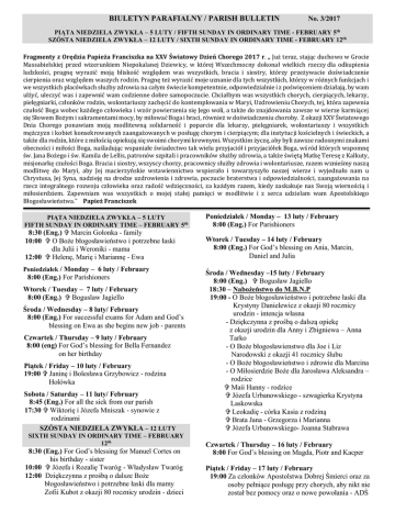 Biuletyn: 5 i 12 Luty 2017 - St. Casimir`s Parish in Vancouver