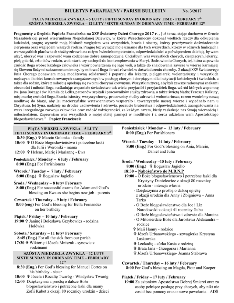 BIULETYN PARAFIALNY / PARISH BULLETIN No. 3/2017 PIĄTA NIEDZIELA ZWYKŁA – 5 LUTY / FIFTH SUNDAY IN ORDINARY TIME - FEBRUARY 5th SZÓSTA NIEDZIELA ZWYKŁA – 12 LUTY / SIXTH SUNDAY IN ORDINARY TIME - FEBRUARY 12th Fragmenty z Orędzia Papieża Franciszka na XXV Światowy Dzień Chorego 2017 r. „ Już teraz, stając duchowo w Grocie Massabielskiej przed wizerunkiem Niepokalanej Dziewicy, w której Wszechmocny dokonał wielkich rzeczy dla odkupienia ludzkości, pragnę wyrazić moją bliskość względem was wszystkich, bracia i siostry, którzy przeżywacie doświadczenie cierpienia oraz względem waszych rodzin. Pragnę też wyrazić moje uznanie dla tych wszystkich, którzy w różnych funkcjach i we wszystkich placówkach służby zdrowia na całym świecie kompetentnie, odpowiedzialnie i z poświęceniem działają, by wam ulżyć, uleczyć was i zapewnić wam codzienne dobre samopoczucie. Chciałbym was wszystkich chorych, cierpiących, lekarzy, pielęgniarki, członków rodzin, wolontariuszy zachęcić do kontemplowania w Maryi, Uzdrowieniu Chorych, tej, która zapewnia czułość Boga wobec każdego człowieka i wzór powierzenia się Jego woli, a także do znajdowania zawsze w wierze karmiącej się Słowem Bożym i sakramentami mocy, by miłować Boga i braci, również w doświadczeniu choroby. Z okazji XXV Światowego Dnia Chorego ponawiam moją modlitewną solidarność i poparcie dla lekarzy, pielęgniarek, wolontariuszy i wszystkich mężczyzn i kobiet konsekrowanych zaangażowanych w posługę chorym i cierpiącym; dla instytucji kościelnych i świeckich, a także dla rodzin, które z miłością opiekują się swoimi chorymi krewnymi. Wszystkim życzę, aby byli zawsze radosnymi znakami obecności i miłości Boga, naśladując wspaniałe świadectwo tak wielu przyjaciół i przyjaciółek Boga, wśród których wspomnę św. Jana Bożego i św. Kamila de Lellis, patronów szpitali i pracowników służby zdrowia, a także świętą Matkę Teresę z Kalkuty, misjonarkę czułości Boga. Bracia i siostry, wszyscy chorzy, pracownicy służby zdrowia i wolontariusze, razem wznieśmy naszą modlitwę do Maryi, aby Jej macierzyńskie wstawiennictwo wspierało i towarzyszyło naszej wierze i wyjednało nam u Chrystusa, Jej Syna, nadzieję na drodze uzdrowienia i zdrowia, poczucie braterstwa i odpowiedzialności, zaangażowania na rzecz integralnego rozwoju człowieka oraz radość wdzięczności, za każdym razem, kiedy zaskakuje nas Swoją wiernością i miłosierdziem. Zapewniam was wszystkich o mojej stałej pamięci w modlitwie i z serca udzielam wam Apostolskiego Błogosławieństwa.” Papież Franciszek PIĄTA NIEDZIELA ZWYKŁA – 5 LUTY FIFTH SUNDAY IN ORDINARY TIME – FEBRUARY 5th Poniedziałek / Monday – 13 luty / February 8:00 (Eng.) For Parishioners 8:30 (Eng.) Marcin Golonka - family 10:00 O Boże błogosławieństwo i potrzebne łaski dla Julii i Weroniki - mama 12:00 Helenę, Marię i Mariannę - Ewa Wtorek / Tuesday – 14 luty / February 8:00 (Eng.) For God’s blessing on Ania, Marcin, Daniel and Julia Poniedziałek / Monday – 6 luty / February 8:00 (Eng.) For Parishioners Wtorek / Tuesday – 7 luty / February 8:00 (Eng.) Boguslaw Jagiello Środa / Wednesday – 8 luty/ February 8:00 (Eng.) For successful exams for Adam and God’s blessing on Ewa as she begins new job - parents Czwartek / Thursday – 9 luty / February 8:00 (eng) For God’s blessing for Bella Fernandez on her birthday Piątek / Friday – 10 luty / February 19:00 Janinę i Bolesława Grzybowicz - rodzina Holówka Sobota / Saturday – 11 luty/ February 8:45 (Eng.) For all the sick from our parish 17:30 Wiktorię i Józefa Mniszak - synowie z rodzinami SZÓSTA NIEDZIELA ZWYKŁA – 12 LUTY SIXTH SUNDAY IN ORDINARY TIME – FEBRUARY 12th 8:30 (Eng.) For God’s blessing for Manuel Cortes on his birthday - sister 10:00 Józefa i Rozalię Twaróg - Władysław Twaróg 12:00 Dziękczynna z prośbą o dalsze Boże błogosławieństwo i potrzebne łaski dla mamy Zofii Kubot z okazji 80 rocznicy urodzin - dzieci Środa / Wednesday –15 luty / February 8:00 (Eng.) Bogusław Jagiello 18:30 – Nabożeństwo do M.B.N.P 19:00 - O Boże błogosławieństwo i potrzebne łaski dla Krystyny Danielewicz z okazji 80 rocznicy urodzin - intencja własna - Dziękczynna z prośbą o dalszą opiekę z okazji urodzin dla Anny i Zbigniewa – Anna Tarko - O Boże błogosławienstwo dla Joe i Liz Narodowski z okazji 41 rocznicy ślubu - O Boże błogosławieństwo i zdrowie dla Marcina - O Miłosierdzie Boże dla Jarosława Aleksandra – rodzice Maii Hanny - rodzice Józefa Urbanowskiego - szwagierka Krystyna Laskowska Leokadię - córka Kasia z rodziną Brata Jana - Grzegorza i Marianna Józefa Urbanowskiego- Joanna Stabrawa Czwartek / Thursday – 16 luty / February 8:00 For God’s blessing on Magda, Piotr and Kacper Piątek / Friday – 17 luty / February 19:00 Za członków Apostolstwa Dobrej Śmierci oraz za osoby pełniące posługę przy chorych, aby nikt nie został bez pomocy oraz o nowe powołania - ADŚ Sobota / Saturday – 18 luty / February 8:45 (Eng.) Frances Dragan 17:30 Jadwigę Runcewicz (13rocz. śmierci) - rodzina SIÓDMA NIEDZIELA ZWYKŁA – 19 LUTY SEVENTH SUNDAY IN ORDINARY TIME – FEBRUARY 19th 8:30 (Eng.) Giuseppe & Rosa Adornato – daughter Gilda Calla 10:00 O Boże blogosławieństwo dla Polskiego Towarzystwa Zgoda i wszystkich członków z okazji rocznicy założenia 12:00 Henryka Soczyńskiego ( w rocz. śmierci ) - syn Andrzej z rodziną OGŁOSZENIA DUSZPASTERSKIE Maryjo, nasza Matko, która w Chrystusie przygarniasz każdego z nas jako dziecko, podtrzymuj ufne oczekiwanie naszych serc, spiesz nam z pomocą w naszych chorobach i cierpieniach, Prowadź nas do Chrystusa, Twojego Syna a naszego Brata, i pomóż nam powierzyć się Ojcu, który dokonuje wielkich rzeczy. POCHÓWEK CZY KREMACJA - 18 marca 2016 roku Ojciec Święty Franciszek zatwierdził Instrukcję „Ad re