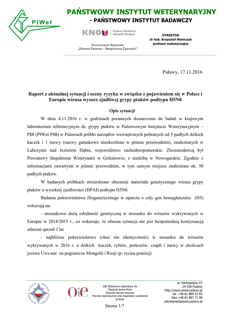 PAŃSTWOWY INSTYTUT WETERYNARYJNY - PAŃSTWOWY INSTYTUT BADAWCZY Konsorcjum Naukowe „Zdrowe Zwierzę – Bezpieczna Żywność” DYREKTOR dr hab. Krzysztof Niemczuk profesor nadzwyczajny Puławy, 17.11.2016 Raport z aktualnej sytuacji i oceny ryzyka w związku z pojawieniem się w Polsce i Europie wirusa wysoce zjadliwej grypy ptaków podtypu H5N8 Opis sytuacji W dniu 4.11.2016 r. w godzinach porannych dostarczono do badań w krajowym laboratorium referencyjnym ds. grypy ptaków w Państwowym Instytucie Weterynaryjnym – PIB (PIWet-PIB) w Puławach próbki narządów wewnętrznych pobranych od 5 padłych dzikich kaczek i 1 mewy (nazwy gatunkowe nieokreślone w piśmie przewodnim), znalezionych w Lubczynie nad Jeziorem Dąbie, województwo zachodniopomorskie. Zleceniodawcą był Powiatowy Inspektorat Weterynarii w Goleniowie, z siedzibą w Nowogardzie. Zgodnie z informacjami zawartymi w piśmie przewodnim, w tym samym miejscu znaleziono ok. 50 padłych ptaków. W badanych próbkach stwierdzono obecność materiału genetycznego wirusa grypy ptaków o wysokiej zjadliwości (HPAI) podtypu H5N8. Badania pokrewieństwa filogenetycznego w oparciu o cały gen hemaglutyniny (H5) wskazują na: - stosunkowo dużą odrębność genetyczną w stosunku do wirusów wykrywanych w Europie w 2014/2015 r., co wskazuje, że obecna sytuacja nie jest bezpośrednią kontynuacją zdarzeń sprzed 2 lat - najbliższe pokrewieństwo (choć nie identyczność) w stosunku do wirusów wykrywanych w 2016 r. u dzikich kaczek, rybitw, perkozów, czapli i mewy w okolicach jeziora Uws-nur na pograniczu Mongolii i Rosji (p. rycina poniżej) OIE Reference Laboratory for Classical swine fever Enzootic bovine leucosis Porcine reproductive and respiratory syndrome Q fever Strona 1/7 al. Partyzantów 57 24-100 Puławy http://www.piwet.pulawy.pl tel. +48 81 889 32 65 faks +48 81 887 71 00 [email protected] W dniu 10.11.2016 r. dostarczono do badania narządy od padłej mewy srebrzystej (Larus argentatus) znalezionej w Świnoujściu. Uzyskano wynik dodatni w kierunku obecności wirusa HPAI podtypu H5N8. W dniu 16.11.2016 uzyskano wynik dodatni dla próbki zbiorczej pochodzącej od 5 padłych dzikich kaczek z województwa zachodniopomorskiego, ok. 8 km od lokalizacji pierwszych przypadków. Sytuacja u dzikich ptaków w Europie w 2016 r. Między 3 a 11 listopada 2016 r. 8 państw zgłosiło obecność wirusa HPAI podtypu H5N8 u dzikich ptaków. Oprócz Polski są to: Austria, Chorwacja, Dania, Holandia, Niemcy, Szwajcaria i Węgry. Gatunki dzikich ptaków u których stwierdzono wirus HPAI/H5N8 obejmują kaczkę czernicę (Aythya fuligula), kaczkę głowienkę (Aythya ferina), łabędzia niemego (Cygnus olor), mewę siodłatą (Larus marinus), mewę srebrzystą (Larus argentatus), kulika (Numenius spp.) oraz łyskę (Fulica atra). Tak więc dotychczas wszystkie ptaki dodatnie w kierunku HPAI H5N8 są przedstawicielami rzędu blaszkodziobych (Anseriiformes), siewkowych (Charadriiformes) i żurawiowych (Gruiformes). Przekazane do chwili obecnej dane nt. przebiegu klinicznego i zmian anatomopatologicznych u dzikich ptaków są nieliczne. Zmiany anatomo-patologiczne u łabędzia na Węgrzech obejmowały: przekrwienie narządów wewnętrznych, powiększenie śledziony, drobne wybroczyny w nasierdziu. Obraz typowy dla zakażenia o przebiegu nadostrym. Strona 2/7 Wstępna analiza przypadków HPAI H5N8 u dzikich ptaków wskazuje, że wirus charakteryzuje się szerszym spektrum wrażliwych gatunków niż wirus HPAI H5N8, który pojawił się w Europie w 2014/2015 roku (p. opis w dalszej części raportu). Analiza czasowoprzestrzenna dotychczasowych przypadków wstępnie sugeruje, że wirus został wprowadzony do Europy dwoma niezależnymi drogami migracji: pierwsza z nich pokrywa się z lokalizacją przypadków w Polsce, północnych Niemczech, Danii i Holandii, a druga z przypadkami na Węgrzech, Chorwacji, Austrii, Szwajcarii i południowych Niemczech. Sytuacja u drobiu w Europie w 2016 r. W trzech krajach potwierdzono obecność wirusa HPAI/H5N8 u drobiu: na Węgrzech u indyków i kaczek, w Austrii u indyków oraz w Niemczech na fermie niosek reprodukcyjnych i dwóch stadach przyzagrodowych drobiu. W chwili obecnej więcej szczegółowych danych nt. przebiegu klinicznego choroby dotyczy pierwszego ogniska na Węgrzech. W listopadzie 2016 roku stwierdzono tam ognisko choroby u indyków (ok. 50 km od miejsca znalezienia łabędzia zakażonego wirusem H5N8). W stadzie indyków rzeźnych w wieku 11 dni, liczącym 10 201 ptaków utrzymywanych w chowie zamkniętym, odnotowano nagłą, wysoką śmiertelność wynoszącą 2374 ptaki. Pozostałe indyki na fermie w wyniku działań administracyjnych wybito. Pod koniec października właściciel fermy był świadkiem masowych migracji żurawi w kierunku jeziora usytuowanego ok. 10 km od fermy. Zaobserwował również dużą liczbę odchodów na drogach, parkingach i dachach budynków. Strona 3/7 U dostarczonych do badań indyków zanotowano następujące zmiany anatomopatologiczne: - obrzęk tkanki podskórnej głowy - powiększenie i przekrwienie wątroby, śledziony, nerek - przekrwienie płuc - nieżytowe zapalenie jelit i przekrwienie kępek Peyer’a - wybroczyny w nasierdziu Badania histopatologiczne wykazały brak zmian lub tylko nieznacznego stopnia zmiany o charakterze przekrwienia, co dowodzi, że przebieg zakażenia był bardzo gwałtowny. Kontekst epidemiologiczny (charakterystyka epidemii HPAI/H5N8 w 2014/2015 r.) Wirus HPAI należący do podtypu H5N8 powstał w efekcie tzw. reasortacji, czyli wymieszania się segmentów genomu pochodzących od różnych wirusów „rodzicielskich” zakażających jednocześnie organizm ptaka. Gen hemaglutyniny (HA) wywodzi się od wirusa HPAI/H5N1 „azjatyckiego” z tzw. kladu genetycznego 2.3.4.4, a pierwotnym źródłem pozostałych genów są inne wirusy grypy ptaków, często o niskiej zjadliwości. Mechanizm reasortacji genetycznej przedst