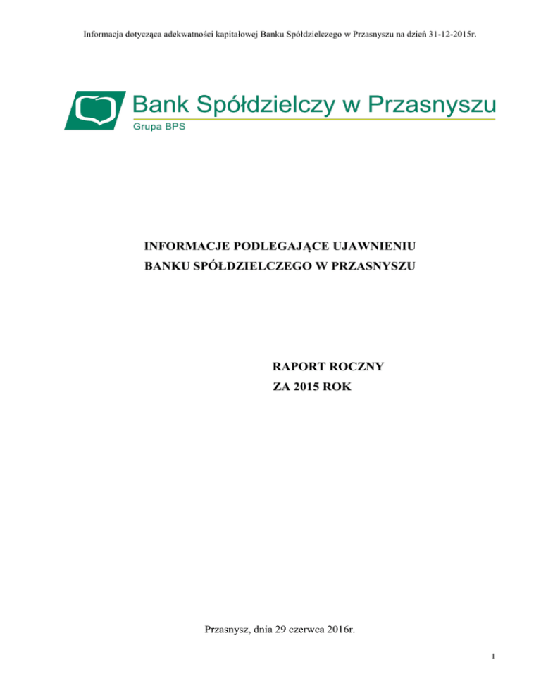 Informacja dotycząca adekwatności kapitałowej Banku Spółdzielczego w Przasnyszu na dzień 31-12-2015r. INFORMACJE PODLEGAJĄCE UJAWNIENIU BANKU SPÓŁDZIELCZEGO W PRZASNYSZU RAPORT ROCZNY ZA 2015 ROK Przasnysz, dnia 29 czerwca 2016r. 1 Informacja dotycząca adekwatności kapitałowej Banku Spółdzielczego w Przasnyszu na dzień 31-12-2015r. Spis treści: Wprowadzenie…………………………………………………..………………….…… 3 I. Informacje ogólne…………………………………………………………….…... 3 II. Podstawa prawna…………………………………………………………….….... 3 III. Cele i strategie w zakresie zarządzania ryzykiem……………........................…... 4 IV. Zakres konsolidacji ostrożnościowej………….…………...……………………… 8 IV. Fundusze własne banku………….………………….…………………….……… 8 V. Wymogi kapitałowe………….…………………………………………………… 10 VI. Ekspozycja na ryzyko kredytowe kontrahenta………………………….………... 12 VII. Bufory kapitałowe………….…………………………………………………….. 12 IX. Wskaźnik globalnego znaczenia systemowego………………………………..…. 12 X. Korekty z tytułu ryzyka kredytowego…………………………………………….. 13 XI. Aktywa wolne od obciążeń……………………………………………………….. 14 XII. Korzystanie z ECAI………………………………………………………..……... 15 XIII. Ekspozycje na ryzyko rynkowe.………………………………………………….. 15 XIV. Ryzyko operacyjne……………………………………………………………….. 15 XV. Ryzyko płynności…………………………………………………………………. 16 XVI. Ekspozycje w papierach kapitałowych nieuwzględnionych w portfelu handlowym……………………………………………………………………….. 18 XVII. Ekspozycje na ryzyko stopy procentowej przypisane pozycjom nieuwzględnionym w portfelu handlowym……………………………………… 19 XVIII.Ekspozycje na pozycje sekurytyzacyjne.…………………………………………. 20 XIX. Polityka w zakresie wynagrodzeń………………………………………................ 20 XX. Dźwignia finansowa………………………………………………………………. 22 XXI. Stosowanie metody IRB w odniesieniu do ryzyka kredytowego.………………… 23 XXII. Stosowanie technik ograniczenia ryzyka kredytowego..…………………………. 23 XXIII.Stosowanie metod zaawansowanego pomiaru w odniesieniu do ryzyka operacyjnego………………………………………………………………..….… 24 XXIV.Stosowanie wewnętrznych modeli pomiaru ryzyka rynkowego...……………….. 24 XXV. Oświadczenie……………………………………………………………………... 24 2 Informacja dotycząca adekwatności kapitałowej Banku Spółdzielczego w Przasnyszu na dzień 31-12-2015r. Niniejszy dokument został opracowany w celu realizacji Zasad polityki informacyjnej Banku Spółdzielczego w Przasnyszu w zakresie adekwatności kapitałowej oraz spełnienia wymogów dotyczących ujawniania informacji zawartych w Rozporządzeniu Parlamentu Europejskiego i Rady (UE) nr 575/2013 z dnia 26 czerwca 2013r. w sprawie wymogów ostrożnościowych dla instytucji kredytowych i firm inwestycyjnych, zmieniającego rozporządzenie (UE) nr 648/2012 (zwanego dalej Rozporządzeniem CRR) oraz na podstawie innych rozporządzeń wykonawczych Komisji (UE) ustanawiających wykonawcze standardy techniczne w zakresie wymogów dotyczących ujawniania informacji, a także zgodnie z Polityką informacyjną Banku Spółdzielczego w Przasnyszu udostępnioną na stronie internetowej www.bsprzasnysz.pl. Niniejszy dokument zawiera informacje w zakresie zgodnym z Rozporządzeniem CRR. I. Informacje ogólne Bank Spółdzielczy w Przasnyszu, zwany dalej Bankiem, z siedzibą w Przasnyszu, ul. Słowackiego 1, działa w oparciu o Statut, wprowadzony do KRS, zgodnie z postanowienie Sądu Rejonowego dla M. St. Warszawy w Warszawie, XIV Wydział Gospodarczy Rejestru Sądowego pod numerem 0000049853. Bank Spółdzielczy w Przasnyszu oznakowany jest numerem REGON 000509063, oraz numerem kodu bankowego 89240007. Bank Spółdzielczy w Przasnyszu zarejestrowany jest w Trzecim Mazowieckim Urzędzie Skarbowym w Radomiu i posiada nr NIP 7610002509. Bank Spółdzielczy w Przasnyszu działa na terenie województwa mazowieckiego i powiatu szczycieńskiego. Bank zrzeszony jest w Banku Polskiej Spółdzielczości S.A., z którym zawarto umowę zrzeszenia w dniu 18 marca 2002r. II. Podstawa prawna 1. Niniejszy dokument zawiera informacje o charakterze jakościowym i ilościowym, dotyczące profilu ryzyka banku, funduszy własnych, wymogów kapitałowych, polityki w zakresie wynagrodzeń oraz innych informacji według stanu na 31-12-2015r. 2. Niniejsza Informacja została sporządzona zgodnie z wymogami określonymi w: 1) Rozporządzeniu Parlamentu Europejskiego i Rady (UE) nr 575/2013, zwanego dalej „Rozporządzeniem CRR”, z dnia 26 czerwca 2013r. w sprawie wymogów ostrożnościowych dla instytucji kredytowych i firm inwestycyjnych, zmieniającego rozporządzenie (UE) nr 648/2012 (część ósma), 3 Informacja dotycząca adekwatności kapitałowej Banku Spółdzielczego w Przasnyszu na dzień 31-12-2015r. 2) Ustawie Prawo Bankowe (art.. 111 oraz 111a), 3) Zasadach Ładu Korporacyjnego dla instytucji nadzorowanych, wydanych uchwałą nr 218/2014 Komisji Nadzoru Finansowego (§ 31), 4) Statucie Banku Spółdzielczego w Przasnyszu. 3. Niniejsza Informacja sporządzona została na podstawie obowiązujących w Banku procedur wewnętrznych: 1) „Polityki informacyjnej Ban