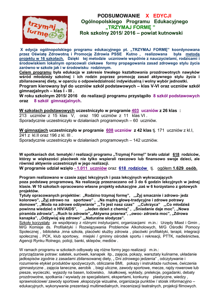 PODSUMOWANIE X EDYCJI Ogólnopolskiego Programu Edukacyjnego „TRZYMAJ FORMĘ ” Rok szkolny 2015/ 2016 – powiat kutnowski X edycja ogólnopolskiego programu edukacyjnego pt. „TRZYMAJ FORMĘ” koordynowana przez Oświatę Zdrowotną i Promocję Zdrowia PSSE Kutno , realizowana była metodą projektu w 16 szkołach. Dzięki tej metodzie uczniowie wspólnie z nauczycielami, rodzicami i środowiskiem lokalnym opracowali ciekawe formy propagowania zasad zdrowego stylu życia zarówno w szkole jak i w środowisku rodzinnym. Celem programu była edukacja w zakresie trwałego kształtowania prozdrowotnych nawyków wśród młodzieży szkolnej i ich rodzin poprzez promocję zasad aktywnego stylu życia i zbilansowanej diety, w oparciu o odpowiedzialność indywidualną i wolny wybór jednostki. Program kierowany był do uczniów szkół podstawowych – klas V-VI oraz uczniów szkół gimnazjalnych – klas I - III . W roku szkolnym 2015/ 2016 do realizacji programu przystąpiło 8 szkół podstawowych oraz 8 szkół gimnazjalnych. W szkołach podstawowych uczestniczyło w programie 403 uczniów z 26 klas : 213 uczniów z 15 klas V, oraz 190 uczniów z 11 klas VI . Sporadycznie uczestniczyło w działaniach programowych – 60 uczniów. W gimnazjach uczestniczyło w programie 608 uczniów z 42 klas tj. 171 uczniów z kl.I, 241 z kl.II oraz 196 z kl. III . Sporadycznie uczestniczyło w działaniach programowych – 142 uczniów. W spotkaniach dot. tematyki / realizacji programu „Trzymaj Formę!” brało udział 618 rodziców, którzy w większości placówek nie tylko wspierali rzeczowo lub finansowo swoje dzieci, ale również aktywnie uczestniczyli w jego realizacji. W programie udział wzięło - 1.011 uczniów oraz 618 rodziców tj. ogółem 1.629 osób. Program realizowano w czasie zajęć lekcyjnych i poza lekcyjnych wykraczających poza podstawę programową. Na realizację przeznaczano od 3 do 6 godzin lekcyjnych w jednej klasie. W 10 szkołach opracowano własne projekty edukacyjne ,zaś w 6 korzystano z gotowych projektów. Tytuły opracowanych projektów: „Rodzino trzymaj formę”, ,„Żyj smacznie i zdrowo- jedz kolorowo”, „Żyj zdrowo na sportowo” , „Na mądrą głowę-tradycyjne i zdrowe potrawy domowe”, „Moda na zdrowe odżywianie” ,„To jest nasz czas” ,„Cukrzyca” ,„Co młodzież powinna wiedzieć o HIV/AIDS”, „Jeden dzień z chemią” , „Śniadanie daje moc”, „Nowa piramida zdrowia”, „Ruch to zdrowie”,„Aktywna przerwa”, „owoc- zdrowia moc”, „Zdrowa kanapka”, „Odżywiaj się zdrowo” ,„Naturalne słodycze”. Szkoły korzystały ze współpracy z różnymi instytucjami, organizacjami m.in.: Urzędy Miast i Gmin , M/G Komisje ds. Profilaktyki i Rozwiązywania Problemów Alkoholowych, M/G Ośrodki Pomocy Społecznej , biblioteka ,inna szkoła, placówki służby zdrowia , placówki profilaktyki, terapii, integracji społecznej , PCK, klub sportowy, miejski / gminny ośrodek sportu i rekreacji, PTTK, nadleśnictwa, Agencji Rynku Rolnego, policji, banki, sklepów, mediów . W ramach programu w szkołach odbywały się różne formy jego realizacji m.in.: przyrządzanie potraw: sałatek, surówek, kanapek itp., zajęcia, pokazy, warsztaty kulinarne, układanie jadłospisów zgodnie z zasadami zbilansowanej diety, „ Dni zdrowego jedzenia” , odczytywanie i rozumienie etykiet produktów spożywczych, obliczanie BMI, pokazy i instruktaże ruchowe, ćwiczenia gimnastyczne , zajęcia taneczne, aerobik , biegi uliczne, zawody sportowe, mecze, rajdy rowerowe lub piesze, wycieczki, wyjazdy na basen, lodowisko, /skałkowej, wykłady, prelekcje, pogadanki, debaty prozdrowotne, spotkania / wywiady ze specjalistami, ekspertami, konkursy plastyczne, wiedzy , sprawnościowe/ zawody sportowe ,ekspozycje wizualne, organizacja punktów / stoisk informacyjno – edukacyjnych, wykonywanie prezentacji multimedialnych, inscenizacji teatralnych, projekcji filmowych. Poprzez realizację programu wprowadzono pozytywne zmiany do asortymentu produktów żywnościowych w sklepikach szkolnych. Pojawiło się w nich więcej zdrowych produktów żywnościowych takich jak: świeże i suszone owoce lub warzywa, soki owocowe, woda mineralna. Obiady szkolne wzbogacono o surówki, sałatki i jogurty. Dodatkowe informacje : - Z terenu powiatu kutnowskiego 5 szkół wzięło udział w konkursie wiedzy o zdrowym stylu życia. W wyniku oceny przez komisje konkursową wybrano do etapu powiatowego uczniów z 2 szkół. W dniu 08.04.2016r. przeprowadzono etap powiatowy konkursu Wiedzy o zdrowym stylu życia „Trzymaj Formę”, który odbył się w siedzibie PSSE Kutno Udział wzięło 3 uczniów z Zespołu Szkół w Szczycie ( 2 osoby) i Gimnazjum w Bedlnie (1 osoba) , którzy zakwalifikowali się z etapu szkolnego , przeprowadzonego on-line . - Z terenu powiatu kutnowskiego 3 szkoły podstawowe wzięły udział w Konkursie na Projekt Edukacyjny promujący zmianę zachowań w zakresie stylu życia w środowisku lokalnym w ramach realizacji Ogólnopolskiego programu Edukacyjnego „ Trzymaj Formę!” w roku szkolnym 2015/ 2016. Do Powiatowe Stacji Sanitarno-Epidemiologicznej w Kutnie na konkurs wpłynęły trzy Projekty: ze Szkoły Podstawowej Nr 1 w Kutnie - tytuł projektu: RODZINO - TRZYMAJ FORMĘ , ze Szkoły Podstawowej w Grabowie - tytuł projektu: „Żyj zdrowo na sportowo” oraz ze Szkoły Podstawowej w Szewcach Nadolnych - tytuł projektu: „Na mądrą głowętradycyjne i zdrowe potrawy domowe”. Zgodnie z regulaminem konkursu Państwowy Powiatowy Inspektor Sanitarny w Kutnie powołała komisję konkursową w skład której weszli pracownicy PSSE Kutno. Komisja szczegółowo zapoznała się z otrzymaną dokumentacją i w dniu 20.04.2016r. wybrała jednogłośnie Projekt Edukacyjny Szkoły Podstawowej Nr 1 w Kutnie. Projekt został przesłany do kolejnego etapu- wojewódzkiego do Wojewódzkiej Stacji Sanitarno – Epidemiologicznej w Łodzi