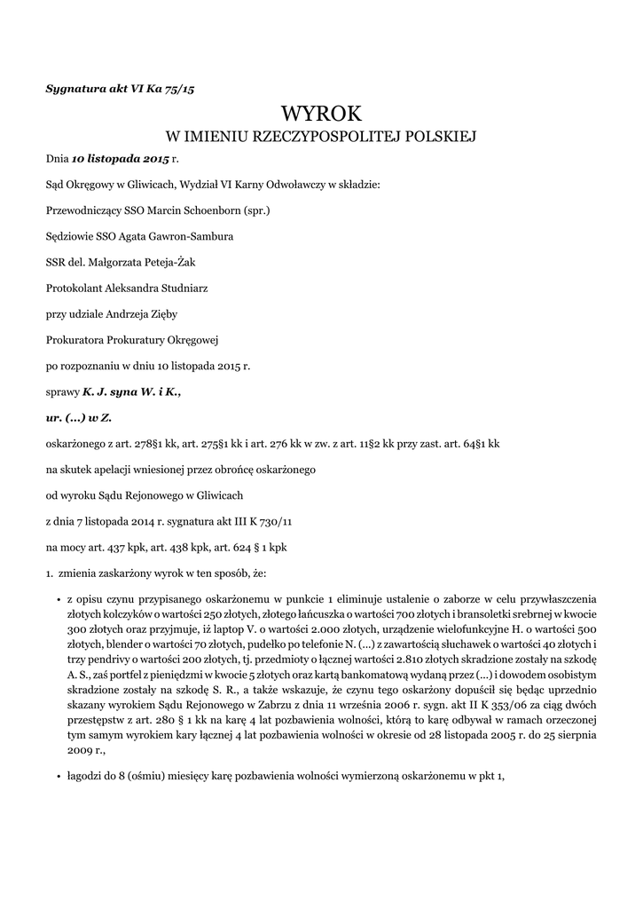 Sygnatura akt VI Ka 75/15 WYROK W IMIENIU RZECZYPOSPOLITEJ POLSKIEJ Dnia 10 listopada 2015 r. Sąd Okręgowy w Gliwicach, Wydział VI Karny Odwoławczy w składzie: Przewodniczący SSO Marcin Schoenborn (spr.) Sędziowie SSO Agata Gawron-Sambura SSR del. Małgorzata Peteja-Żak Protokolant Aleksandra Studniarz przy udziale Andrzeja Zięby Prokuratora Prokuratury Okręgowej po rozpoznaniu w dniu 10 listopada 2015 r. sprawy K. J. syna W. i K., ur. (...) w Z. oskarżonego z art. 278§1 kk, art. 275§1 kk i art. 276 kk w zw. z art. 11§2 kk przy zast. art. 64§1 kk na skutek apelacji wniesionej przez obrońcę oskarżonego od wyroku Sądu Rejonowego w Gliwicach z dnia 7 listopada 2014 r. sygnatura akt III K 730/11 na mocy art. 437 kpk, art. 438 kpk, art. 624 § 1 kpk 1. zmienia zaskarżony wyrok w ten sposób, że: • z opisu czynu przypisanego oskarżonemu w punkcie 1 eliminuje ustalenie o zaborze w celu przywłaszczenia złotych kolczyków o wartości 250 złotych, złotego łańcuszka o wartości 700 złotych i bransoletki srebrnej w kwocie 300 złotych oraz przyjmuje, iż laptop V. o wartości 2.000 złotych, urządzenie wielofunkcyjne H. o wartości 500 złotych, blender o wartości 70 złotych, pudełko po telefonie N. (...) z zawartością słuchawek o wartości 40 złotych i trzy pendrivy o wartości 200 złotych, tj. przedmioty o łącznej wartości 2.810 złotych skradzione zostały na szkodę A. S., zaś portfel z pieniędzmi w kwocie 5 złotych oraz kartą bankomatową wydaną przez (...) i dowodem osobistym skradzione zostały na szkodę S. R., a także wskazuje, że czynu tego oskarżony dopuścił się będąc uprzednio skazany wyrokiem Sądu Rejonowego w Zabrzu z dnia 11 września 2006 r. sygn. akt II K 353/06 za ciąg dwóch przestępstw z art. 280 § 1 kk na karę 4 lat pozbawienia wolności, którą to karę odbywał w ramach orzeczonej tym samym wyrokiem kary łącznej 4 lat pozbawienia wolności w okresie od 28 listopada 2005 r. do 25 sierpnia 2009 r., • łagodzi do 8 (ośmiu) miesięcy karę pozbawienia wolności wymierzoną oskarżonemu w pkt 1, • w ramach orzeczonego w pkt 3 środka karnego przyjmuje, że oskarżony obowiązany jest do zapłaty kwoty 2.810 ( dwa tysiące osiemset dziesięć) złotych na rzecz pokrzywdzonej A. S. oraz kwoty 5 (pięciu) złotych na rzecz pokrzywdzonego S. R.; 2. w pozostałej części zaskarżony wyrok utrzymuje w mocy; 3. zasądza od Skarbu Państwa na rzecz adwokata K. C. kwotę 619,92 zł (sześćset dziewiętnaście złotych i dziewięćdziesiąt dwa grosze) obejmującą kwotę 115,92 zł (sto piętnaście złotych i dziewięćdziesiąt dwa grosze) podatku VAT, tytułem zwrotu nieuiszczonych kosztów obrony z urzędu oskarżonego w postępowaniu odwoławczym; 4. zwalnia oskarżonego od zapłaty kosztów sądowych za postępowanie odwoławcze, wydatkami obciążając Skarb Państwa. sygn. akt VI Ka 75/15 UZASADNIENIE Sąd Rejonowy w Gliwicach wyrokiem z dnia 7 listopada 2014 r. sygn. akt III K 730/11 uznał oskarżonego K. J. za winnego popełnienia zarzucanego mu czynu stanowiącego występek z art. 278 § 1 kk i art. 275 § 1 kk i art. 276 kk w zw. z art. 11 § 2 kk przy zast. art. 64 § 1 kk, a polegającego na tym, że w dniu 24 czerwca 2010 r. w G. z mieszkania przy ul. (...) zabrał w celu przywłaszczenia: laptop V. o wartości 2.000 złotych, urządzenie wielofunkcyjne H. o wartości 600 złotych, blender o wartości 70 złotych, pudełko po telefonie N. (...) z zawartością słuchawek o wartości 40 złotych, złote kolczyki o wartości 250 złotych, złoty łańcuszek o wartości 700 złotych, bransoletkę srebrną o wartości 300 złotych, 3 sztuki pendrive o łącznej wartości 200 złotych, portfel z zawartością: pieniędzy w kwocie 10 złotych, dowodu osobistego, karty bankomatowej (...), o łącznej wartości 4.170 złotych na szkodę S. R. oraz ukrył na szkodę w/w pokrzywdzonego dokumenty, którymi nie miał prawa wyłącznie rozporządzać, tj. książeczkę wojskową, kartę (...) wydaną przez T., prawo jazdy, kartę na punkty ze stacji paliw S., kartę do przelewów internetowych (...), karty na punkty P. wydaną przez (...), kartę I. F., a także ukrył na szkodę A. S. i jej małoletniej córki dokumenty, którymi nie miał prawa wyłącznie rozporządzać, dotyczące założenia kont w D. Bank, mbank, teczkę z wynikami badań A. S. oraz jej małoletniej córki D. W., książeczkę zdrowia dziecka, książeczkę szczepień, teczkę z dokumentacją pozwu rozwodowego A. S., dowodów wpłat za transakcje z (...), dowodów opłat za studia I i II stopnia, dyplom ukończenia studiów licencjackich w (...) we W., dyplom ukończenia studiów podyplomowych na (...) w K., notatki ze studiów, dokumentację związaną z zapisaniem D. W. do przedszkola, oryginał nadania, przy czym czynu tego dopuścił się w ciągu 5 lat od odbycia w okresie od 28 listopada 2005 r. do 25 września 2009 r. części kary 4 lat pozbawienia wolności orzeczonej wyrokiem Sądu Rejonowego w Zabrzu z dnia 11 września 006 r. sygn. akt II K 353/06 za przestępstwo z art. 280 § 1 kk i za to na mocy art. 278 § 1 kk w zw. z art. 11 § 3 kk wymierzył oskarżonemu karę 1 roku pozbawienia wolności (pkt 1 wyroku). Na mocy art. 63 § 1 kk na poczet tej kary zaliczył mu okres jego zatrzymania w sprawie w dniach 30 czerwca 2010 r., 1 lipca 2010 r. i 2 lipca 2010 r. (pkt 2 wyroku). Dalej na mocy art. 46 § 1 kk orzekł wobec oskarżonego obowiązek naprawienia szkody wyrządzonej przestępstwem poprzez zapłatę na rzecz S. R. kwoty 4.170 złotych (pkt 3 wyroku). Rozstrzygając o kosztach, na mocy art. 29 ust. 1 ustawy – Prawo o adwokaturze zasądził od Skarbu Państwa na rzecz adw. A. D. kwotę 2.066,40 złotych obejmująca podatek VAT tytułem wynagrodzenia za obronę z urzędu oskarżonego (pkt 4 wyroku) oraz na mocy art. 624 § 1 kpk i art. 17 ust. 1 ustawy o opłatach w sprawach karnych zwolnił oskarżonego od zapłaty kosztów s