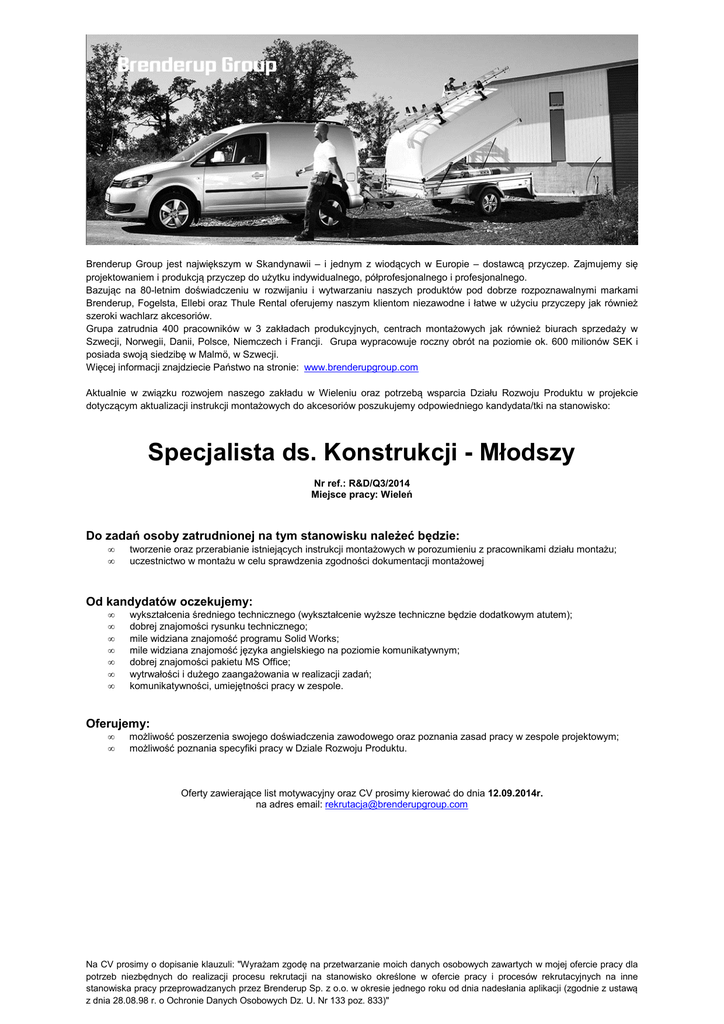 Brenderup Group jest największym w Skandynawii – i jednym z wiodących w Europie – dostawcą przyczep. Zajmujemy się projektowaniem i produkcją przyczep do użytku indywidualnego, półprofesjonalnego i profesjonalnego. Bazując na 80-letnim doświadczeniu w rozwijaniu i wytwarzaniu naszych produktów pod dobrze rozpoznawalnymi markami Brenderup, Fogelsta, Ellebi oraz Thule Rental oferujemy naszym klientom niezawodne i łatwe w użyciu przyczepy jak również szeroki wachlarz akcesoriów. Grupa zatrudnia 400 pracowników w 3 zakładach produkcyjnych, centrach montażowych jak również biurach sprzedaży w Szwecji, Norwegii, Danii, Polsce, Niemczech i Francji. Grupa wypracowuje roczny obrót na poziomie ok. 600 milionów SEK i posiada swoją siedzibę w Malmö, w Szwecji. Więcej informacji znajdziecie Państwo na stronie: www.brenderupgroup.com Aktualnie w związku rozwojem naszego zakładu w Wieleniu oraz potrzebą wsparcia Działu Rozwoju Produktu w projekcie dotyczącym aktualizacji instrukcji montażowych do akcesoriów poszukujemy odpowiedniego kandydata/tki na stanowisko: Specjalista ds. Konstrukcji - Młodszy Nr ref.: R&D/Q3/2014 Miejsce pracy: Wieleń Do zadań osoby zatrudnionej na tym stanowisku należeć będzie: • • tworzenie oraz przerabianie istniejących instrukcji montażowych w porozumieniu z pracownikami działu montażu; uczestnictwo w montażu w celu sprawdzenia zgodności dokumentacji montażowej Od kandydatów oczekujemy: • • • • • • • wykształcenia średniego technicznego (wykształcenie wyższe techniczne będzie dodatkowym atutem); dobrej znajomości rysunku technicznego; mile widziana znajomość programu Solid Works; mile widziana znajomość języka angielskiego na poziomie komunikatywnym; dobrej znajomości pakietu MS Office; wytrwałości i dużego zaangażowania w realizacji zadań; komunikatywności, umiejętności pracy w zespole. Oferujemy: • • możliwość poszerzenia swojego doświadczenia zawodowego oraz poznania zasad pracy w zespole projektowym; możliwość poznania specyfiki pracy w Dziale Rozwoju Produktu. Oferty zawierające list motywacyjny oraz CV prosimy kierować do dnia 12.09.2014r. na adres email: [email protected] Na CV prosimy o dopisanie klauzuli: "Wyrażam zgodę na przetwarzanie moich danych osobowych zawartych w mojej ofercie pracy dla potrzeb niezbędnych do realizacji procesu rekrutacji na stanowisko określone w ofercie pracy i procesów rekrutacyjnych na inne stanowiska pracy przeprowadzanych przez Brenderup Sp. z o.o. w okresie jednego roku od dnia nadesłania aplikacji (zgodnie z ustawą z dnia 28.08.98 r. o Ochronie Danych Osobowych Dz. U. Nr 133 poz. 833)"