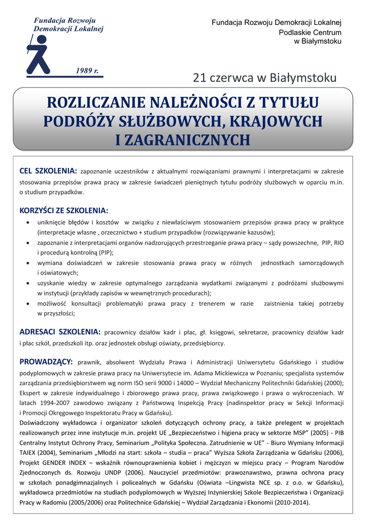 Fundacja Rozwoju Demokracji Lokalnej Podlaskie Centrum w Białymstoku 21 czerwca w Białymstoku ROZLICZANIE NALEŻNOŚCI Z TYTUŁU PODRÓŻY SŁUŻBOWYCH, KRAJOWYCH I ZAGRANICZNYCH CEL SZKOLENIA: zapoznanie uczestników z aktualnymi rozwiązaniami prawnymi i interpretacjami w zakresie stosowania przepisów prawa pracy w zakresie świadczeń pieniężnych tytułu podróży służbowych w oparciu m.in. o studium przypadków. KORZYŚCI ZE SZKOLENIA: uniknięcie błędów i kosztów w związku z niewłaściwym stosowaniem przepisów prawa pracy w praktyce (interpretacje własne , orzecznictwo + studium przypadków (rozwiązywanie kazusów); zapoznanie z interpretacjami organów nadzorujących przestrzeganie prawa pracy – sądy powszechne, PIP, RIO i procedurą kontrolną (PIP); wymiana doświadczeń w zakresie stosowania prawa pracy w różnych i oświatowych; uzyskanie wiedzy w zakresie optymalnego zarządzania wydatkami związanymi z podróżami służbowymi w instytucji (przykłady zapisów w wewnętrznych procedurach); możliwość konsultacji problematyki prawa pracy z trenerem w razie w przyszłości; ADRESACI SZKOLENIA: jednostkach samorządowych zaistnienia takiej potrzeby pracownicy działów kadr i płac, gł. księgowi, sekretarze, pracownicy działów kadr i płac szkół, przedszkoli itp. oraz jednostek obsługi oświaty, przedsiębiorcy. PROWADZĄCY: prawnik, absolwent Wydziału Prawa i Administracji Uniwersytetu Gdańskiego i studiów podyplomowych w zakresie prawa pracy na Uniwersytecie im. Adama Mickiewicza w Poznaniu; specjalista systemów zarządzania przedsiębiorstwem wg norm ISO serii 9000 i 14000 – Wydział Mechaniczny Politechniki Gdańskiej (2000); Ekspert w zakresie indywidualnego i zbiorowego prawa pracy, prawa związkowego i prawa o wykroczeniach. W latach 1994-2007 zawodowo związany z Państwową Inspekcją Pracy (nadinspektor pracy w Sekcji Informacji i Promocji Okręgowego Inspektoratu Pracy w Gdańsku). Doświadczony wykładowca i organizator szkoleń dotyczących ochrony pracy, a także prelegent w projektach realizowanych przez inne instytucje m.in. projekt UE „Bezpieczeństwo i higiena pracy w sektorze MSP” (2005) - PIB Centralny Instytut Ochrony Pracy, Seminarium „Polityka Społeczna. Zatrudnienie w UE” - Biuro Wymiany Informacji TAIEX (2004), Seminarium „Młodzi na start: szkoła – studia – praca” Wyższa Szkoła Zarządzania w Gdańsku (2006), Projekt GENDER INDEX – wskaźnik równouprawnienia kobiet i mężczyzn w miejscu pracy – Program Narodów Zjednoczonych ds. Rozwoju UNDP (2006). Nauczyciel przedmiotów: prawoznawstwo, prawna ochrona pracy w szkołach ponadgimnazjalnych i policealnych w Gdańsku (Oświata –Lingwista NCE sp. z o.o. w Gdańsku), wykładowca przedmiotów na studiach podyplomowych w Wyższej Inżynierskiej Szkole Bezpieczeństwa i Organizacji Pracy w Radomiu (2005/2006) oraz Politechnice Gdańskiej – Wydział Zarządzania i Ekonomii (2010-2014). PROGRAM SZKOLENIA: 1. Omówienie aktualnych rozwiązań prawnych w zakresie podróży służbowych w 2016 r. 2. Pojęcie podróży służbowej i innych wyjazdów pracowniczych, w kontekście zakresu obowiązków i miejsca wykonywania pracy. 3. Zasady obliczania diet krajowych i pozostałych kosztów podróży: dieta krajowa uzależniona od ilości posiłków zapewnionych pracownikom; nocleg ze śniadaniem- problemy praktyczne i możliwe rozwiązania faktyczne; problemy praktyczne związane z wypłacaniem diet, w tym posiłek z kontrahentem, obiad na szkoleniu, obiadokolacja, posiłek zapewniony, ale niespożyty itp.; dieta za podróż służbową krajową w trakcie podróży zagranicznej; koszty przejazdu – środki komunikacji publicznej, pojazdy nie będące własnością pracodawcy; pozostałe wydatki – zakres uznania kosztów; 4. Zasady wypłacania ryczałtów wypłacanych pracownikom limity ryczałtów za noclegi; ryczałty za dojazdy – zasady obliczenia, wyłączenia; 5. Dokumenty związane z rozliczaniem podróży służbowych: polecenie wyjazdu służbowego - obowiązki formalne dokumentu, wyjazdy krótkoterminowe (w ramach dniówki roboczej); zgoda na użycie samochodu niebędącego własnością pracodawcy; skutki prawne wyjazdu bez polecenia pracodawcy; potwierdzenie pobytu pracownika w danym miejscu jako dodatkowy obowiązek nie wynikający z przepisów prawa pracy; rozliczenie wyjazdu - wymagania formalne, w tym zatwierdzenia formalne, merytoryczne i do wypłaty dokumenty podpinane pod rozliczenie delegacji - rozliczania faktur, paragonów, rachunków na osobę fizyczną (pracownika); skutki nieprawidłowego rozliczenia delegacji (niezgodnego z prawdą) i nieprawidłowego rozliczenia kosztów podróży służbowej przez pracodawcę; wewnętrzne regulacje – procedury i instrukcje rozliczania podróży służbowych (przykłady rozwiązań); 6. Rozliczanie podróży służbowej zagranicznej: podróż zagraniczna do kilku państw; moment rozpoczęcia i zakończenia podróży zagranicznej - problemy praktyczne wyjazd do kilku państw; zasady ustalania diet za pobyt w danym państwie; pozostałe koszty podróży służbowych; 7. Rozliczanie zaliczek na podróże służbowe. Terminy. 8. Czas pracy w podróży służbowej. Ograniczanie związane z delegowaniem pracowników poza stałe miejsce pracy. 9. Skutki wypadku w trakcie podróży służbowej w zakresie kosztów podróży. 10. Orzecznictwo oraz interpretacje urzędowe i podatkowe dotyczące podróży służbowych. 11. Rozwiązywanie kazusów z zakresu podróży służbowych, w tym w zakresie naliczania należności. 12. Indywidualne konsultacje. SZKOLENIE: ROZLICZANIE NALEŻNOŚCI Z TYTUŁU PODRÓŻY SŁUŻBOWYCH, KRAJOWYCH I ZAGRANICZNYCH Miejsce: DANE D O K ON T AK T U : Fundacja Rozwoju Demokracji Lokalnej Podlaskie Centrum ul. Choroszczańska 31 15-732 Białystok (Dawny budynek Wyższej Szkoły Ekonomicznej) tel./fax. 85 732 17 88, 85 732 94 84 e-mail: [email protected] w w w. frd l.b ia lys to