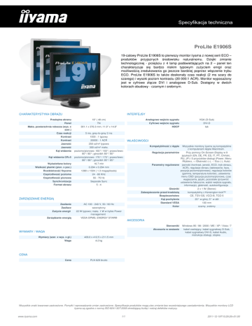 Specyfikacja techniczna ProLite E1906S 19-calowy ProLite E1906S to pierwszy monitor iiyama z nowej serii ECO – produktów przyjaznych środowisku naturalnemu. Dzięki zmianie technologicznej - przejściu z 4 lamp podświetlających na 2 – panel ten charakteryzuje się bardzo niskim typowym zużyciem enrgii oraz możliwością zredukowania go jeszcze bardziej poprzez włączenie trybu ECO. ProLite E1906S to także doskonały czas reakcji (2 ms szary do szarego) i wysoki poziom kontrastu (20 000:1 ACR). Monitor wyposażony jest w cyfrowe złącze DVI i analogowe D-Sub. Dostępny w dwóch kolorach obudowy - czarnym i srebrnym. CHARAKTERYSTYKA OBRAZU INTERFEJSY Przekątna ekranu Panel Maks. powierzchnia robocza (wys. x szer.) Czas reakcji Kontrast 19" ( 48 cm) Analogowe wejście sygnału TN Cyfrowe wejście sygnału 301.1 x 376.3 mm; 11.9" x 14.8" HDCP 20000 : 1 ACR 250 cd/m² typowa Jasność 300 cd/m² maks. WŁAŚCIWOŚCI Kompatybilność z Apple Wszystkie monitory iiyama są kompatybilne z komputerami Apple Macintosh. Kąt widzenia poziomo/pionowo: 160°/ 160°; prawo/lewo: 80°/ 80°; góra/dół: 80°/ 80° Regulacja parametrów Kąt widzenia CR>5 poziomo/pionowo: 176°/ 170°; prawo/lewo: 88°/ 88°; góra/dół: 85°/ 85° 16.7 mln 1280 x 1024 ( 1.3 megapiksela) Częstotliwość pozioma 24 - 80 KHz 55 - 75 Hz Synchronizacja Separate Sync Format obrazu 5:4 Głośniki Zabezpieczenie przed kradzieżą Bezpieczeństwo ZARZĄDZANIE ENERGIĄ Kąt pochylenia Zasilanie AC 100 - 240 V, 50 / 60 Hz Zasilacz wewnętrzny Zużycie energii Zarządzanie energią Przy pomocy On-Screen-Display w 9 językach (EN, DE, FR, ES, IT, PT, Chiński, RU, JP) i 5 przycisków obsługi (Power, Menu /Wybierz, + /Głośność (+), - / Eco (-), Auto) Parametry regulowane jasność (kontrast, janość, ECO, tryb obrazu, ACR), regulacje obrazu (taktowanie, faza, pozycja pozioma/pionowa), regulacja kolorów (gamma, temperatura kolorów), ustawienia menu OSD (pozycja pozioma/pionowa, czas wygaszania, język), pozostałe (przywróć ustawienia fabryczne, wybór wejścia sygnału, informacje), głośność, autokonfiguracja 0.294 x 0.294 mm Rozdzielczość fizyczna Częstotliwość pionowa tak 1000 : 1 typowy Jasność Wyświetlane kolory DVI-D 5 ms, grey-to-grey 2 ms Kontrast Wielkość plamki (pion. x poz.) VGA (D-Sub) Standard VESA Kolor 2 x 1 W (Stereo) kompatybilny z Kensington-lock™ CE, TÜV-GS, VCCI-B, TCO 5 20° w górę; 5° w dół 100 mm czarny, srebrny 22 W typowo; maks. 1 W w trybie Power management VESA DPMS, ENERGY STAR® AKCESORIA Sterowniki Windows 95 / 98 / 2000 / ME / XP / Vista / 7 Akcesoria w zestawie WYMIARY / WAGA Wymiary (szer. x wys. x gł.) 409.0 x 412.5 x 211.5 mm Waga 4.2 kg Cena PLN 629 brutto kabel zasilający, kabel sygnałowy D-Sub, kabel sygnałowy DVI-D, kabel Audio, instrukcja obsługi, stopka CENA Wszystkie znaki towarowe zastrzeżone. Pomyłki i wprowadzanie zmian zastrzeżone. Specyfikacje produktów mogą ulec zmianie bez wcześniejszego zawiadomienia. Wszystkie monitory LCD iiyama są zgodne z normą ISO-9241-307:2008 określającą liczbę i rodzaj defektów matrycy. www.iiyama.com Powered by TCPDF (www.tcpdf.org) 1/1 2011-12-19T10:29:26+01:00