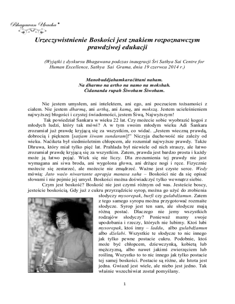 * Urzeczywistnienie Boskości jest znakiem rozpoznawczym prawdziwej edukacji (Wyjątki z dyskursu Bhagawana podczas inaugracji Śri Sathya Sai Centre for Human Excellence, Sathya Sai Grama, dnia 19 czerwca 2014 r.) Manobuddjahamkaraćittani naham. Na dharmo na artho na namo na mokshah. Ćidananda rupah Śiwoham Śiwoham. Nie jestem umysłem, ani intelektem, ani ego, ani poczuciem tożsamości z ciałem. Nie jestem dharmą, ani arthą, ani kamą, ani mokszą. Jestem ucieleśnieniem najwyższej błogości i czystej świadomości, jestem Śiwą, Najwyższym! Tak powiedział Śankara w wieku 22 lat. Czy możecie sobie wyobrazić kogoś z młodych ludzi, który tak mówi? A w tym swoim młodym wieku Adi Śankara zrozumiał już prawdę kryjącą się za wszystkim, co widać. „Jestem wieczną prawdą, dobrocią i pięknem [satjam śiwam sundaram]!” Niczyja duchowość nie zależy od wieku. Naćiketa był siedmioletnim chłopcem, ale rozumiał najwyższe prawdy. Także Dhruwa, który miał tylko pięć lat. Prahlada był niewiele od nich straszy, ale łatwo zrozumiał prawdę kryjącą się za wszystkim. Zatem, prawda jest bardzo prosta i każdy może ją łatwo pojąć. Wiek się nie liczy. Dla zrozumienia tej prawdy nie jest wymagana ani siwa broda, ani wygolona głowa, ani drżące nogi i ręce. Fizycznie możecie się zestarzeć, ale możecie nie zmądrzeć. Ważne jest czyste serce. Wedy mówią: Jato waćo niwartante aprapja manasa saha – Boskości nie da się opisać słowami i nie pojmie jej umysł. Boskości można doświadczyć tylko wewnątrz siebie. Czym jest boskość? Boskość nie jest czymś różnym od was. Jesteście boscy, jesteście boskością. Gdy już z cukru przyrządzicie syrop, można go użyć do zrobienia słodyczy mysorepak, burfi czy gulabdźamun. Zatem z tego samego syropu można przygotować rozmaite słodycze. Syrop jest ten sam, ale słodycze mają różną postać. Dlaczego nie jemy wszystkich rodzajów słodyczy? Ponieważ mamy swoje upodobania i rzeczy, których nie lubimy. Ktoś lubi mysorepak, ktoś inny – laddu, albo gulabdźamun albo dźelabi. Wszystkie te słodycze to nic innego jak tylko pewne postacie cukru. Podobnie, ktoś może być chłopcem, dziewczynką, kobietą lub mężczyzną, albo nawet jakimś zwierzęciem lub rośliną. Wszystko to to nic innego jak tylko postacie tej samej boskości. Postacie są różne, ale Istota jest jedna. Gwiazd jest wiele, ale niebo jest jedno. Tak właśnie wszechświat został pomyślany. 1 Na początku była tylko Paramatma, a potem podzieliła się na wielość. Każda istota jest odbiciem tej samej Paramatmy, która przejawiła się w postaci rozmaitych roślin, zwierząt, ptaków, ludzkich istot, aniołów, bogów i półbogów. Tak więc, wszystkie rodzaje istot są stwarzane z tej samej pojedynczej Boskiej Istoty. Spójrzcie na szklankę wody. Skąd pochodzi ta woda? „Wiemy, że Bóg przychodzi w ludzkiej Pochodzi z kranu. Skąd kran ma postaci jako boska inkarnacja. Jednak wodę? Otrzymuje ją ze zbiornika. nie uświadamiamy sobie, że człowiek Skąd zbiornik ma wodę? Pochodzi może wznieść się i stać się Bogiem. ze studni. W jaki sposób studnia jest zaopatrywana w wodę? Jej woda Mówicie: ‘Swami przyszedł i odszedł.’ pochodzi z deszczu. Skąd bierze się Ale dla mnie nie ma przychodzenia ani deszcz? Pochodzi z oceanu. Widziodchodzenia. Zawsze jestem obecny.” my więc, że jest cykl nazywany obiegiem wody. Możecie postrzegać wodę w szklance. Każdy widzi, że deszcz przynosi wodę do studni, że zbiornik otrzymuje ją ze studni, że kran dostaje ją ze zbiornika a szklanka z kranu. Każdy może też stwierdzić, że ocean otrzymuje wodę deszczową spływającą rzekami. Tę część prawdy nazywa się nauką. Ale nikt nie widzi jak oceaniczna woda przenosi się do chmur i staje się deszczem. Tę część prawdy nazywa się duchowością. Zatem, nauka zależy od zmysłów postrzegania i od rozumowania, podczas gdy duchowość zależy od intuicji bądź serca. Wiemy, że Bóg przychodzi w ludzkiej postaci jako boska inkarnacja. Jednak nie uświadamiamy sobie, że człowiek może wznieść się i stać się Bogiem. Mówicie: „Swami przyszedł i odszedł.” Ale dla mnie nie ma przychodzenia ani odchodzenia. Zawsze jestem obecny. Widzicie tylko ciało Swamiego i mówicie, że przyszedł i odszedł. Weźmy na przykład film wyświetlany na ekranie. Ekran cały czas pozostaje niezmienny, ale sceny filmu ciągle się zmieniają. Sceny te nie wpływają na ekran. W filmie opartym na Mahabharacie ktoś może kogoś zabić, ale na ekranie nie będzie plamy z krwi. W filmie ktoś może krzyczeć z bólu, ale ból ten nie wpływa na ekran. Dlaczego tak się dzieje? Ekran jest czysty i bez skazy i zawsze jest obecny. Tak samo, boskość jest fundamentalna i wieczna. Wy przychodzicie i odchodzicie, ale ja zawsze jestem obecny. Możecie powiedzieć: „Witam Cię, Swami!” Ale faktycznie to ja was witam, a nie wy mnie, gdyż jestem już wszędzie. Moglibyście spytać: „Swami przyjeżdża samochodem i zdaje się tutaj siedzieć i mówić. Czym jest to nowe zjawisko?” Wszystko na tym świecie ma cztery rodzaje ciał. Są to sthula-śarira, czyli fizyczne ciało, sukszma-śarira, czyli ciało subtelne, ati-sukszma-śarira, czyli ciało nadsubtelne, oraz para-sukszma-śarira, czyli wszechobecne ciało nadsubtelne. Sthulaśarira to ciało fizyczne, które każdy może zobaczyć. W tej chwili nie jestem w fizycznym ciele, lecz w sukszma-śarirze, w ciele subtelnym, które jest ponad światem fizycznym. W mojej ati-sukszma-sarirze wstępuję do snów i medytacji ludzi i kieruję 2 nimi. W para-sukszma-sarirze jestem obecny w każdym atomie we wszechświecie. Obecnie jesteście w ciele fizycznym. Siedząc w pokoju, nie możecie zobaczyć tego, co znajduje się na zewnątrz, gdyż po drodze jest ściana. Sukszma-śariry nie ograniczają deśa, kala czy pariszthiti (przestrzeń, czas czy oko