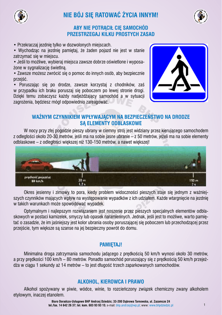 NIE BÓJ SIĘ RATOWAĆ ŻYCIA INNYM! ABY NIE POTRĄCIŁ CIĘ SAMOCHÓD PRZESTRZEGAJ KILKU PROSTYCH ZASAD • Przekraczaj jezdnię tylko w dozwolonych miejscach. • Wychodząc na jezdnię pamiętaj, że żaden pojazd nie jest w stanie zatrzymać się w miejscu. • Jeśli to możliwe, wybieraj miejsca zawsze dobrze oświetlone i wyposażone w sygnalizację świetlną. • Zawsze możesz zwrócić się o pomoc do innych osób, aby bezpiecznie przejść. • Poruszając się po drodze, zawsze korzystaj z chodników, zaś w przypadku ich braku poruszaj się poboczem po lewej stronie drogi. Dzięki temu zobaczysz każdy nadjeżdżający samochód a w sytuacji zagrożenia, będziesz mógł odpowiednio zareagować. WAŻNYM CZYNNIKIEM WPŁYWAJĄCYM NA BEZPIECZEŃSTWO NA DRODZE SĄ ELEMENTY ODBLASKOWE W nocy przy złej pogodzie pieszy ubrany w ciemny strój jest widziany przez kierującego samochodem z odległości około 20-30 metrów, jeśli ma na sobie jasne ubranie – z 50 metrów, jeżeli ma na sobie elementy odblaskowe – z odległości większej niż 130-150 metrów, a nawet większej! Okres jesienny i zimowy to pora, kiedy problem widoczności pieszych staje się jednym z ważniejszych czynników mających wpływ na występowanie wypadków z ich udziałem. Każde wtargnięcie na jezdnię w takich warunkach może spowodować wypadek. Optymalnym i najlepszym rozwiązaniem jest noszenie przez pieszych specjalnych elementów odblaskowych w postaci kamizelek, smyczy lub opasek naramiennych. Jednak, jeśli jest to możliwe, warto pamiętać o zasadzie, że im jaśniejszy jest kolor ubrania osoby poruszającej się poboczem lub przechodzącej przez przejście, tym większe są szanse na jej bezpieczny powrót do domu. PAMIĘTAJ! Minimalna droga zatrzymania samochodu jadącego z prędkością 50 km/h wynosi około 30 metrów, a przy prędkości 100 km/h – 80 metrów. Ponadto samochód poruszający się z prędkością 50 km/h przejeżdża w ciągu 1 sekundy aż 14 metrów – to jest długość trzech zaparkowanych samochodów. ALKOHOL, KIEROWCA I PRAWO Alkohol spożywany w piwie, wódce, winie, to rozcieńczony związek chemiczny zwany alkoholem etylowym, inaczej etanolem. Biuro Doradczo-Usługowe BHP Andrzej Dziedzic; 33-200 Dąbrowa Tarnowska, ul. Zazamcze 24 tel./fax. 14 642 26 37; tel. kom. 603 93 93 15; e-mail: [email protected]; www: www.bhpdziedzic.pl 1 NIE BÓJ SIĘ RATOWAĆ ŻYCIA INNYM! Każda ilość spożytego alkoholu wpływa na funkcjonowanie organizmu człowieka. Jest to szczególnie groźne dla kierującego pojazdem. Picie alkoholu przez kierowcę uniemożliwia bezpieczną jazdę samochodem: • pogarsza kondycję ruchów, • powoduje trudności w wykonywaniu jednej bądź kilku czynności jednocześnie, • zmniejsza szybkość reakcji, • wydłuża czas reakcji (np. hamowania) w przypadku dostrzeżenia niebezpieczeństwa, • powoduje pogorszenie wzroku, • pojawia się problem z dostrzeżeniem szczegółów, świateł, znaków pieszych i innych przeszkód, • ogranicza pole widzenia; zawęża je od kąta 180º do bardzo wąskiego, przez co można nie zauważyć pojazdu nadjeżdżającego z bocznej drogi, • powoduje błędną ocenę odległości i szybkości, • samochód, pas jezdni lub drzewo mogą wydawać się dużo dalej, niż są w rzeczywistości. KIEROWCO, JEDZIESZ – NIE PIJ!!! Zaburzenia powodowane przez alkohol w organizmie kierowcy w zależności od poziomu alkoholu we krwi: • 0,1‰ rozproszona uwaga • 0,2‰ dłuższe spostrzeganie • 0,3‰ drobne zaburzenia równowagi i koordynacji; gorsze spostrzeganie przedmiotów w oddali, obniżona zdolność dostrzegania ruchomych źródeł światła • 0,4‰ opóźnienie reakcji, zmniejszona sprawność motoryczna, wydłużenie adaptacji oka do ciemności • 0,5‰ zmniejszenie zdolności rozpoznania sytuacji, pobudliwość, upośledzenie koordynacji wzrokowo-ruchowej, pogorszenie ostrości widzenia i oceny odległości • 0,6‰ błędna ocena własnych możliwości, znaczne obniżenie samokontroli i koncentracji, nadmierna pobudliwość • 0,8‰ zdecydowane osłabienie koordynacji mięśniowej i zdolności prowadzenia pojazdu • 1-2‰ zaburzenia koordynacji mięśniowej i równowagi, osłabienie sprawności intelektualnej i pamięci, brawura, opóźnienie czasu reakcji • 2-3‰ zaburzenia mowy, wzmożona senność, obniżenie zdolności kontroli własnego zachowania i poruszania się • 3-4‰ spadek ciśnienia krwi, obniżenie temperatury, osłabienie lub zanik funkcji fizjologicznych, duże prawdopodobieństwo utraty przytomności • powyżej 4‰ śpiączka, zatrzymanie oddychania i akcji serca Bardzo przybliżona metoda samookreślenia momentu, w którym można zasiąść za kierownicą opiera się na liczeniu porcji standardowych, czyli ilości napojów alkoholowych, które zawierają 10 gramów czystego alkoholu, np.: Powyższe wartości dotyczą wagowego stężenia procentowego. Ponieważ zawartość alkoholu w napojach podaje się zazwyczaj w procentach objętościowych, powyższe ilości napojów zawierają typowo 8 g alkoholu etylowego. Szybkość rozkładu alkoholu u mężczyzn wynosi 10-12 g/h, u kobiet 8-10 g/h. Przyjmując wartość średnią, czyli 10 g, można założyć, że w ciągu jednej godziny wątroba spala jedną porcję standardową. 2 Biuro Doradczo-Usługowe BHP Andrzej Dziedzic; 33-200 Dąbrowa Tarnowska, ul. Zazamcze 24 tel./fax. 14 642 26 37; tel. kom. 603 93 93 15; e-mail: [email protected]; www: www.bhpdziedzic.pl NIE BÓJ SIĘ RATOWAĆ ŻYCIA INNYM! SZYBKIE BADANIE URAZOWE Czasem zdarza się, że podczas spaceru w parku czy w mieście widzimy osobę leżącą na ziemi. Zanim przyjedzie pogotowie możemy pomóc sprawdzając stan poszkodowanego. Na miejscu wypadku, po ocenie miejsca zdarzenia i ocenie wstępnej, obejmującej ogólne wrażenie, ocenę stanu świadomości, drożności dróg oddechowych, oddechu i krążenia wykonuje się szybkie badanie urazowe. 