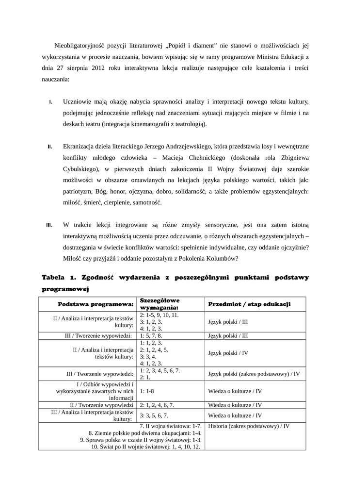 Nieobligatoryjność pozycji literaturowej „Popiół i diament” nie stanowi o możliwościach jej wykorzystania w procesie nauczania, bowiem wpisując się w ramy programowe Ministra Edukacji z dnia 27 sierpnia 2012 roku interaktywna lekcja realizuje następujące cele kształcenia i treści nauczania: I. Uczniowie mają okazję nabycia sprawności analizy i interpretacji nowego tekstu kultury, podejmując jednocześnie refleksję nad znaczeniami sytuacji mających miejsce w filmie i na deskach teatru (integracja kinematografii z teatrologią). II. Ekranizacja dzieła literackiego Jerzego Andrzejewskiego, która przedstawia losy i wewnętrzne konflikty młodego człowieka – Macieja Chełmickiego (doskonała rola Zbigniewa Cybulskiego), w pierwszych dniach zakończenia II Wojny Światowej daje szerokie możliwości w obszarze omawianych na lekcjach języka polskiego wartości, takich jak: patriotyzm, Bóg, honor, ojczyzna, dobro, solidarność, a także problemów egzystencjalnych: miłość, śmierć, cierpienie, samotność. III. W trakcie lekcji integrowane są różne zmysły sensoryczne, jest ona zatem istotną interaktywną możliwością uczenia przez odczuwanie, o różnych obszarach egzystencjalnych – dostrzegania w świecie konfliktów wartości: spełnienie indywidualne, czy oddanie ojczyźnie? Miłość czy przyjaźń i oddanie pozostałym z Pokolenia Kolumbów? Tabela 1. Zgodność wydarzenia z poszczególnymi punktami podstawy programowej Podstawa programowa: II / Analiza i interpretacja tekstów kultury: III / Tworzenie wypowiedzi: II / Analiza i interpretacja tekstów kultury: III / Tworzenie wypowiedzi: I / Odbiór wypowiedzi i wykorzystanie zawartych w nich informacji II / Tworzenie wypowiedzi III / Analiza i interpretacja tekstów kultury: Szczegółowe wymagania: 2: 1-5, 9, 10, 11. 3: 1, 2, 3. 4: 1, 2, 3. 1: 5, 7, 8. 1: 1, 2, 3. 2: 1, 2, 4, 5. 3: 3, 4. 4: 1, 2, 3. 1: 2, 3, 4, 5, 6, 7. 2: 1. Przedmiot / etap edukacji Język polski / III Język polski / III Język polski / IV Język polski (zakres podstawowy) / IV 1: 1-8 Wiedza o kulturze / IV 2: 1, 2, 4, 6, 7. Wiedza o kulturze / IV 3: 3, 5, 6, 7. Wiedza o kulturze / IV 7. II wojna światowa: 1-7. 8. Ziemie polskie pod dwiema okupacjami: 1-4. 9. Sprawa polska w czasie II wojny światowej: 1-3. 10. Świat po II wojnie światowej: 1, 4, 10, 12. Historia (zakres podstawowy) / IV 11. Polska w systemie komunistycznym: 1, 2, 3. Źródło: opracowanie własne.