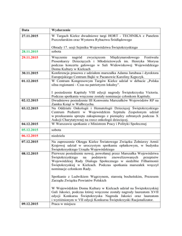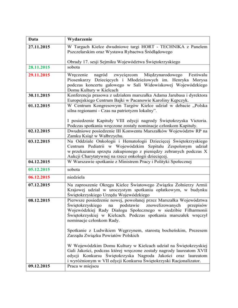 Data Wydarzenie 27.11.2015 W Targach Kielce dwudniowe targi HORT - TECHNIKA z Panelem Pszczelarskim oraz Wystawa Rybactwa Śródlądowego 28.11.2015 29.11.2015 30.11.2015 01.12.2015 Obrady 17. sesji Sejmiku Województwa Świętokrzyskiego sobota Wręczenie nagród zwycięzcom Międzynarodowego Festiwalu Piosenkarzy Dziecięcych i Młodzieżowych im. Henryka Morysa podczas koncertu galowego w Sali Widowiskowej Wojewódzkiego Domu Kultury w Kielcach Konferencja prasowa z udziałem marszałka Adama Jarubasa i dyrektora Europejskiego Centrum Bajki w Pacanowie Karoliny Kępczyk. W Centrum Kongresowym Targów Kielce udział w debacie „Polska silna regionami - Czas na patriotyzm lokalny”. 04.12.2015 I posiedzenie Kapituły VIII edycji nagrody Świętokrzyska Victoria. Podczas spotkania wręczone zostały nominacje członkom Kapituły. Dwudniowe posiedzenie III Konwentu Marszałków Województw RP na Zamku Książ w Wałbrzychu. Na Oddziale Onkologii i Hematologii Dziecięcej Świętokrzyskiego Centrum Pediatrii w Wojewódzkim Szpitalu Zespolonym udział w przekazaniu sprzętu zakupionego z pieniędzy zebranych podczas X Aukcji Charytatywnej na rzecz onkologii dziecięcej. W Warszawie spotkanie z Ministrem Pracy i Polityki Społecznej 05.12.2015 sobota 06.12.2015 niedziela 07.12.2015 Na zaproszenie Okręgu Kielce Światowego Związku Żołnierzy Armii Krajowej udział w uroczystym spotkaniu opłatkowym, w budynku Świętokrzyskiego Urzędu Wojewódzkiego Pierwsze posiedzenie nowej, powołanej przez Marszałka Województwa Świętokrzyskiego na podstawie znowelizowanych przepisów Wojewódzkiej Rady Dialogu Społecznego w siedzibie Filharmonii Świętokrzyskiej w Kielcach. Podczas spotkania marszałek wręczył nominacje członkom Rady. 02.12.2015 03.12.2015 08.12.2015 Spotkanie z Ludwikiem Węgrzynem, starostą bocheńskim, Prezesem Zarządu Związku Powiatów Polskich 09.12.2015 W Wojewódzkim Domu Kultury w Kielcach udział na Świętokrzyskiej Gali Jakości, podczas której wręczone zostały nagrody laureatom XVII edycji Konkursu Świętokrzyska Nagroda Jakości oraz laureatom i wyróżnionym w VII edycji Konkursu Świętokrzyski Racjonalizator. Praca w miejscu 10.12.2015 11.12.2015 12.12.2015 Zarząd Województwa przyjął zaproponowany przez Wojewódzki Urząd Pracy podział przyznanej dla regionu kwoty Funduszu Pracy. W Targach Kielce gość koncertu jubileuszowego z okazji 40-lecia pracy artystycznej Bronisława Opałko. W Europejskim Centrum Edukacji Geologicznej w Chęcinach udział w spotkaniu Wójtów, Burmistrzów i Prezydentów Miast Województwa Świętokrzyskiego. W siedzibie Wojewódzkiej Biblioteki Publicznej w Kielcach udział w spotkaniu podsumowującym IV Ogólnopolski Konkurs na Reportaż im. Zbyszka Nosala pn. „Wszystkie nasze dzienne sprawy…”. 13.12.2015 Spektakl jubileuszowy Kielecki Teatr Tańca - udział w uroczystości. W Galerii Echo w Kielcach udział w akcji „Malowana niedziela”. 14.12.2015 Kiermasz świąteczny w Urzędzie Marszałkowskim Obrady 18. sesji Sejmiku Województwa Świętokrzyskiego 15.12.2015 16.12.2015 Uroczyste zakończenie prac remontowych na dwóch odcinkach dróg wojewódzkich nr 746 i 749 biegnących przez gminę Końskie. Na zaproszenie Staropolskiej Izby Przemysłowo – Handlowej w Kielcach gość spotkania wigilijnego Spotkanie z burmistrzem, starostą i wójtami powiatu włoszczowskiego. 17.12.2015 18.12.2015 19.12.2015 20.12.2015 21.12.2015 22.12.2015 Spotkanie w Domu Samotnej matki w Wiernej Rzece W Wojewódzkim Domu Kultury w Kielcach spotkanie z przedstawicielami środowisk twórczych z województwa świętokrzyskiego W Warszawie udział we wspólnej konferencji 5 marszałków Polski Wschodniej podsumowującej realizację Wschodniego Szlaku Rowerowego Green Velo. Podczas spotkania podpisany zostanie list intencyjny w sprawie utworzenia klastra Green Velo. Posiedzenie sekcji „Samorząd, polityka spójności” Narodowej Rady Rozwoju. Kandydaci do tytułu Talent Świętokrzyski zaprezentowali się w Centrum Kongresowym Targów Kielce. W jury konkursu zasiadł marszałek Adam Jarubas. W Kijach udział w wigilijnej biesiadzie artystycznej „Kijska Pastorałka”. Urlop W Wojewódzkim Domu Kultury w Kielcach z udziałem marszałka Adama Jarubasa odbyła się konferencja podsumowująca realizację Wschodniego Szlaku Rowerowego Green Velo w województwie świętokrzyskim (211 km) oraz projektu „Trasy rowerowe w Polsce Wschodniej – promocja”. 23.12.2015 Praca w miejscu 24.12.2015 Dzień wolny od pracy dla Urzędu Marszałkowskiego Województwa Świętokrzyskiego w Kielcach. W Radiu Kielce rozmowa na temat przyszłorocznego budżetu województwa świętokrzyskiego. Obrady 19. sesji Sejmiku Województwa Świętokrzyskiego 28.12.2015 29.12.2015 30.12.2015 31.12.2015 Uroczyste otwarcie zmodernizowanego odcinka drogi wojewódzkiej nr 755 w Ożarowie. Praca w miejscu