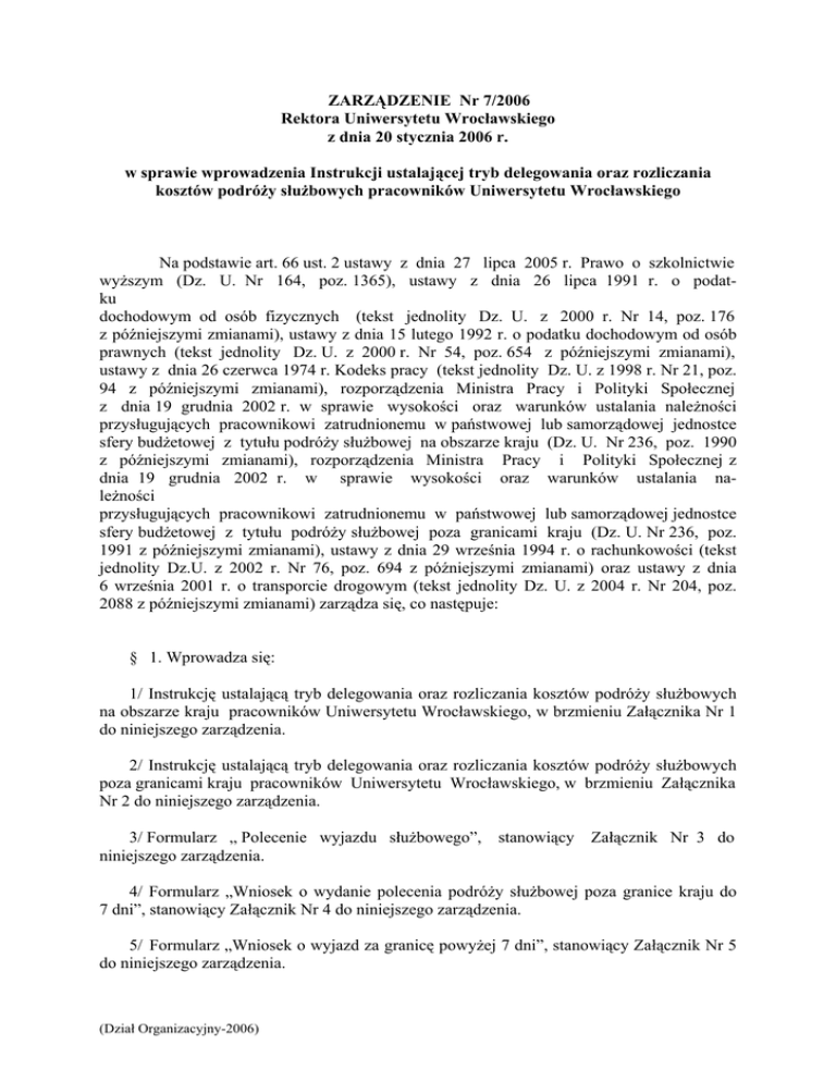 Zarządzenie Rektora Uniwersytetu Wrocławskiego nr 7 z 2006 roku