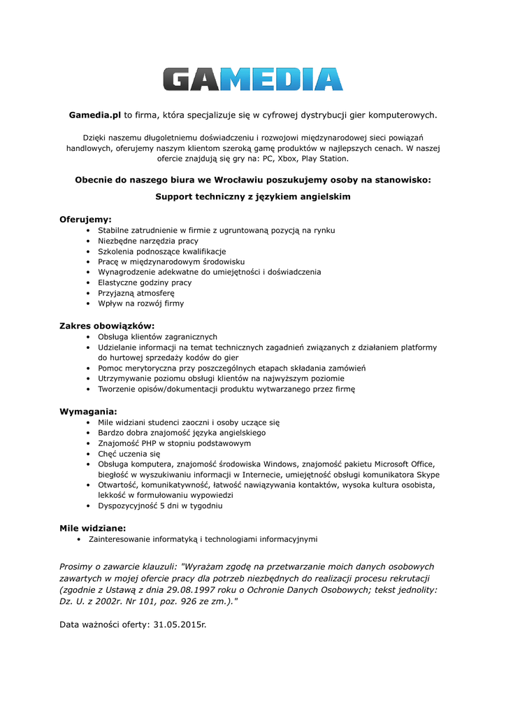 Gamedia.pl to firma, która specjalizuje się w cyfrowej dystrybucji gier komputerowych. Dzięki naszemu długoletniemu doświadczeniu i rozwojowi międzynarodowej sieci powiązań handlowych, oferujemy naszym klientom szeroką gamę produktów w najlepszych cenach. W naszej ofercie znajdują się gry na: PC, Xbox, Play Station. Obecnie do naszego biura we Wrocławiu poszukujemy osoby na stanowisko: Support techniczny z językiem angielskim Oferujemy: • • • • • • • • Stabilne zatrudnienie w firmie z ugruntowaną pozycją na rynku Niezbędne narzędzia pracy Szkolenia podnoszące kwalifikacje Pracę w międzynarodowym środowisku Wynagrodzenie adekwatne do umiejętności i doświadczenia Elastyczne godziny pracy Przyjazną atmosferę Wpływ na rozwój firmy Zakres obowiązków: • • • • • Obsługa klientów zagranicznych Udzielanie informacji na temat technicznych zagadnień związanych z działaniem platformy do hurtowej sprzedaży kodów do gier Pomoc merytoryczna przy poszczególnych etapach składania zamówień Utrzymywanie poziomu obsługi klientów na najwyższym poziomie Tworzenie opisów/dokumentacji produktu wytwarzanego przez firmę Wymagania: • • • • • • • Mile widziani studenci zaoczni i osoby uczące się Bardzo dobra znajomość języka angielskiego Znajomość PHP w stopniu podstawowym Chęć uczenia się Obsługa komputera, znajomość środowiska Windows, znajomość pakietu Microsoft Office, biegłość w wyszukiwaniu informacji w Internecie, umiejętność obsługi komunikatora Skype Otwartość, komunikatywność, łatwość nawiązywania kontaktów, wysoka kultura osobista, lekkość w formułowaniu wypowiedzi Dyspozycyjność 5 dni w tygodniu Mile widziane: • Zainteresowanie informatyką i technologiami informacyjnymi Prosimy o zawarcie klauzuli: "Wyrażam zgodę na przetwarzanie moich danych osobowych zawartych w mojej ofercie pracy dla potrzeb niezbędnych do realizacji procesu rekrutacji (zgodnie z Ustawą z dnia 29.08.1997 roku o Ochronie Danych Osobowych; tekst jednolity: Dz. U. z 2002r. Nr 101, poz. 926 ze zm.)." Data ważności oferty: 31.05.2015r.
