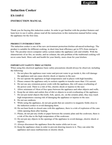 _English_ Induction Cooker ES-1445-I INSTRUCTION MANUAL Thank you for buying this induction cooker. In order to get familiar with the product features and learn how to use it safely, please read all the instructions in this instruction manual before using the appliance for the first time. PRODUCT INTRODUCTION The induction cooker is one of the new environment protection kitchen advanced technology. The product is suitable for different cooking, in short time heat efficiency get to 93% from startup to boil. The peculiar micro-computer safety system makes the appliance safe and reliable. With the characteristic of no fire, no smoke, and no exhaust, the safe problem of the traditional cooking will never come back. More safe and health for your family, more clean for your kitchen. IMPORTANT SAFETY PRECAUTIONS When using this electrical appliance basic safety precautions should always be observed, including the following: 1. Do not place the appliance near water and prevent water to go inside it, this will damage the appliance and can cause electric shock or injuries to the user. 2. Do not operate the appliance at high temperatures and in places with high humidity. 3. Please connect the appliance only to sockets capable to transfer more than 15A current. 4. Do not use any extension power cords with the appliance, this will cause overheating of the power cord. There is a risk of fire, electric shock or injuries to the user. 5. Allow minimum of 10cm of free space between the appliance and other objects and walls. 6. Keep the air inlets and outlets free of dirt or objects to avoid overheating of the appliance. 7. Do not put metal objects like knife, fork, spoon, etc. on the ceramic plate, they may reach high temperatures causing risk of damaging the appliance or injuries to the user. 8. Do not use outdoors. 9. While using the appliance, do not put goods that are sensitive to magnetic fields close to the induction cooker to avoid damaging them. 10. Do not heat foods in closed cans with this appliance, there is a risk of explosion of the cans while opening them after heating. 11. Please, do not put any cloths or paper between the ceramic plate and the cookware, there is a risk of fire due to the high temperature of the cookware. 12. Do not put any objects in the openings of the appliance to avoid damage, electric shock or injuries. 13. Always disconnect the appliance from the mains while not in use. 14. Keep the appliance clean in order to prevent drawing insects to it. They can enter the appliance and cause malfunctions or electric shock. _English_ 15. If the appliance or its power cord is damaged or has been dropped, please have it repaired by the manufacturer or the authorized service center in order to avoid any hazard. 16. If the power cord or plug is damaged, it must be replaced by the manufacturer or authorized service center in order to avoid any hazard. 17. This appliance is intended only for food preparation. 18. Never leave the appliance unattended when it is in use. 19. The appliance is intended for household use only. 20. This appliance is not intended for use by persons (including children) with reduced physical, sensory or mental capabilities, or lack of experience and knowledge, unless they have been given supervision or instruction concerning use of the appliance by a person responsible for their safety. 21. Children should be supervised to ensure that they do not play with the appliance. INDUCTION COOKER WORKING PRINCIPLE Makes the cookware heat up directly with heat efficiency up to 93%. Copper coil Hot plate panel without fire, without smoke, without exhaust gases. The induction cooker works on the principle of a coil of copper wire placed underneath the cooking pot. An alternating electric current flows through the coil, which produces an oscillating magnetic field. This field induces an electric current in the pot. Current flowing in the metal pot produces resistive heating which heats the food. SELECTING COOKWARE FOR INDUCTION COOKING In order the induction cooker to work the cooking vessel must be made of a ferromagnetic metal. Some of the popular cooking vessels made of ferromagnetic metal are: stainless steel, iron or cast iron pots, casseroles and fry-pans. Cookware made of non-metal materials like glass, porcelain, etc. or metals without ferromagnetic properties like aluminum are not suitable for induction cooking. _English_ NAME OF COMPONENTS Cooling air outlet Ceramic plate Control panel Cooling air inlet Plastic frame Power cord INSTRUCTION FOR USE 1. Place the induction cooker on a dry, flat and heat resistant surface where it cannot be pulled by accident. 2. Place the cookware with the food in it in the center of the cooker panel. 3. Plugin the appliance to a proper 220-230V, ~50Hz socket. The power indicator will light up indicating that the appliance is plugged in. The induction cooker is ready for use. 4. Press the ON/OFF button to switch the cooker on. The corresponding indicator for the selected function will light up. 5. Press the “Function” button to select the desired cooking mode. You can select one of the following modes: Soup/Porridge, Steam, Reheat milk, Stir-fry, Boil, Hot-pot. For Hot-pot mode only, you can adjust the desired level of firepower from 120W to 2000W by pressing the “+” and “-“ buttons. For the Stir-fry mode only, you can adjust the cooking time from 60 to 270 minutes by pressing the “+” and “-“ buttons. After the time has come to zero, the cooker will be automatically switched off. 6. After finishing cooking, switch the appliance off by pressing the ON/OFF button and unplug it from the mains socket. TIMER FUNCTION The TIMER allows you to set a time period after which the induction cooker will be switched on automatically. In order to set the timer and the desired function to be used, plug in the appliance, the power indicator will light up. Now press the “+” button to change minutes and “-“ to change hours. Th