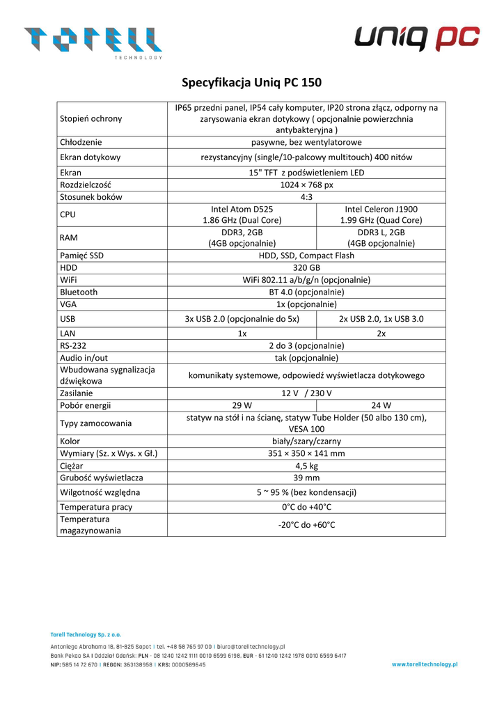 Specyfikacja Uniq PC 150 Stopień ochrony Chłodzenie IP65 przedni panel, IP54 cały komputer, IP20 strona złącz, odporny na zarysowania ekran dotykowy ( opcjonalnie powierzchnia antybakteryjna ) pasywne, bez wentylatorowe Ekran dotykowy rezystancyjny (single/10-palcowy multitouch) 400 nitów Ekran Rozdzielczość Stosunek boków 15" TFT z podświetleniem LED 1024 × 768 px 4:3 Intel Atom D525 Intel Celeron J1900 1.86 GHz (Dual Core) 1.99 GHz (Quad Core) DDR3, 2GB DDR3 L, 2GB (4GB opcjonalnie) (4GB opcjonalnie) HDD, SSD, Compact Flash 320 GB WiFi 802.11 a/b/g/n (opcjonalnie) BT 4.0 (opcjonalnie) 1x (opcjonalnie) CPU RAM Pamięć SSD HDD WiFi Bluetooth VGA USB LAN RS-232 Audio in/out Wbudowana sygnalizacja dźwiękowa Zasilanie Pobór energii Typy zamocowania Kolor Wymiary (Sz. x Wys. x Gł.) Ciężar Grubość wyświetlacza Wilgotność względna Temperatura pracy Temperatura magazynowania 3x USB 2.0 (opcjonalnie do 5x) 2x USB 2.0, 1x USB 3.0 1x 2x 2 do 3 (opcjonalnie) tak (opcjonalnie) komunikaty systemowe, odpowiedź wyświetlacza dotykowego 12 V / 230 V 29 W 24 W statyw na stół i na ścianę, statyw Tube Holder (50 albo 130 cm), VESA 100 biały/szary/czarny 351 × 350 × 141 mm 4,5 kg 39 mm 5 ~ 95 % (bez kondensacji) 0°C do +40°C -20°C do +60°C