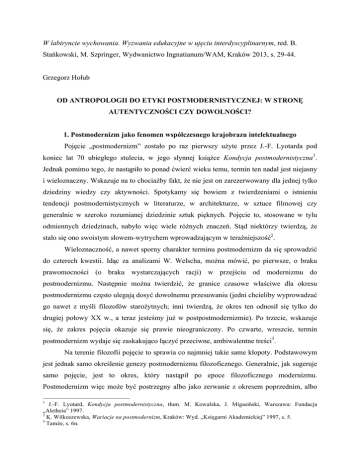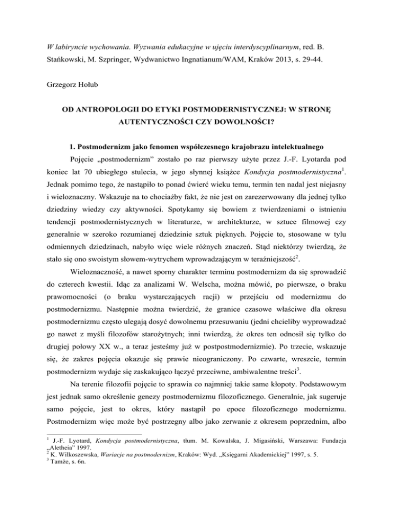 W labiryncie wychowania. Wyzwania edukacyjne w ujęciu interdyscyplinarnym, red. B. Stańkowski, M. Szpringer, Wydwanictwo Ingnatianum/WAM, Kraków 2013, s. 29-44. Grzegorz Hołub OD ANTROPOLOGII DO ETYKI POSTMODERNISTYCZNEJ: W STRONĘ AUTENTYCZNOŚCI CZY DOWOLNOŚCI? 1. Postmodernizm jako fenomen współczesnego krajobrazu intelektualnego Pojęcie „postmodernizm” zostało po raz pierwszy użyte przez J.-F. Lyotarda pod koniec lat 70 ubiegłego stulecia, w jego słynnej książce Kondycja postmodernistyczna1. Jednak pomimo tego, że nastąpiło to ponad ćwierć wieku temu, termin ten nadal jest niejasny i wieloznaczny. Wskazuje na to chociażby fakt, że nie jest on zarezerwowany dla jednej tylko dziedziny wiedzy czy aktywności. Spotykamy się bowiem z twierdzeniami o istnieniu tendencji postmodernistycznych w literaturze, w architekturze, w sztuce filmowej czy generalnie w szeroko rozumianej dziedzinie sztuk pięknych. Pojęcie to, stosowane w tylu odmiennych dziedzinach, nabyło więc wiele różnych znaczeń. Stąd niektórzy twierdzą, że stało się ono swoistym słowem-wytrychem wprowadzającym w teraźniejszość2. Wieloznaczność, a nawet sporny charakter terminu postmodernizm da się sprowadzić do czterech kwestii. Idąc za analizami W. Welscha, można mówić, po pierwsze, o braku prawomocności (o braku wystarczających racji) w przejściu od modernizmu do postmodernizmu. Następnie można twierdzić, że granice czasowe właściwe dla okresu postmodernizmu często ulegają dosyć dowolnemu przesuwaniu (jedni chcieliby wyprowadzać go nawet z myśli filozofów starożytnych; inni twierdzą, że okres ten odnosił się tylko do drugiej połowy XX w., a teraz jesteśmy już w postpostmodernizmie). Po trzecie, wskazuje się, że zakres pojęcia okazuje się prawie nieograniczony. Po czwarte, wreszcie, termin postmodernizm wydaje się zaskakująco łączyć przeciwne, ambiwalentne treści3. Na terenie filozofii pojęcie to sprawia co najmniej takie same kłopoty. Podstawowym jest jednak samo określenie genezy postmodernizmu filozoficznego. Generalnie, jak sugeruje samo pojęcie, jest to okres, który nastąpił po epoce filozoficznego modernizmu. Postmodernizm więc może być postrzegny albo jako zerwanie z okresem poprzednim, albo 1 J.-F. Lyotard, Kondycja postmodernistyczna, tłum. M. Kowalska, J. Migasiński, Warszawa: Fundacja „Aletheia” 1997. 2 K. Wilkoszewska, Wariacje na postmodernizm, Kraków: Wyd. „Księgarni Akademickiej” 1997, s. 5. 3 Tamże, s. 6n. 2 jako jakieś rozwinięcie czy nawet jakaś „mutacja” modernizmu. Obie interpretacje znajdują uzasadnienie w wypowiedziach myślicieli identyfikujących się z tym nurtem myślowym, albo w wypowiedziach jego krytyków. Na aspekt zerwania z modernizmem wskazują chociażby przedstawiciele neomarksistowskiej Szkoły Frankfurckiej. J. Habermas, jako przedstawiciel tego środowiska, wskazuje na postmodernizm jako na przejaw neokonserwatyzmu społeczno-ideologicznego, który dokonuje zerwania z ważnymi ideami modernizmu, takim jak racjonalna wiedza i postęp społeczny4. Z kolei Lyotard jest tym myślicielem, który dowodzi tezy przeciwnej. W jego opinii, postmodernizm jest formą kontynuacji i rozwinięcia tego, co zostało wypracowane w modernizmie. Jak stwierdza on: „postmodernistyczne będzie więc to, co w modernistycznym przedstawieniu odsyła do nieprzedstawialnego; to, co wyrzeka się pocieszenia podsuwanego przez poprawne formy, odrzuca zgodę na smak, umożliwiający wspólne doświadczenie nostalgii za nieosiągalnym; to, co poszukuje nowych przedstawień nie po to, by się nimi delektować, lecz po to, by lepiej odczuwać istnienie nieprzedstawialnego”5. Pomimo tych niejasności terminologicznych i metodologicznych można wyodrębnić parę tez, wspólnych większości koncepcji, które określa się mianem postmodernistycznych. Odrzuca się więc zasadność tworzenia systemów filozoficznych, jednoznaczność języka, samą filozofię natomiast sprowadza się do metafilozofii. W zakresie epistemologii zdecydowanie odrzuca się klasyczne pojęcie prawdy obiektywno-uniwersalnej, zachowując najwyżej pragmatyczne kryteria prawdy. W dziedzinie życia społecznego tolerancja urasta do roli swoistego dogmatu; jej rozumienie natomiast zbliża się do postawy relatywizmu poznawczego i etycznego. W antropologii niejednokrotnie znika pojęcie osoby-podmiotu. W dziedzinie natomiast szeroko rozumianej aksjologii neguje się istnienie takich rzeczywistości jak Bóg, sacrum, duchowa osobowość człowieka, czy pozaziemski sens ludzkiego życia6. Do sztandarowych postaci postmodernizmu filozoficznego zalicza się takich filozofów jak: J. F. Lyotard, J. Derrida, G. Deluze, P. Virilio, R. Rorty, M. Foucault, W. Welsch, G. Vattimo i inni. Wśród postmodernistów, którzy podejmują zagadnienia antropologiczne i etyczne ważną postacią jest polski socjolog Zygmunt Bauman7. Stąd w przedstawieniu 4 S. Kowalczyk, Idee filozoficzne postmodernizmu, Radom: Polwen 2004, s. 11. J.-F. Lyotard, Odpowiedź na pytanie: co to jest postmodernizm? tłum. z fran. M. P. Markowski, w: Postmodernizm. Antologia przekładów, red. R. Nycz, Kraków: Wyd. Baran i Suszyński 1998, s. 60. 6 S. Kowalczyk, dz. cyt., s. 14. 7 Zygmunt Bauman, ur. 1925, był wykładowcą na Uniwersytecie Warszawskim. W 1968 r. wyemigrował z Polski. Przez długie lata pracował na Uniwersytecie w Leeds. Aktualnie jest emerytowanym profesorem tej uczelni. 5 3 pewnej (z pewnością nie jedynej) wersji antropologii i etyki ponowoczesnej należy skoncentrować się na tej postaci. Głównym zamierzeniem tego autora jest refleksja nad istotą ludzką w kontekście jej relacji z innymi ludźmi. W tym ujawnia się profil Baumana jako socjologa. Jednak w toku tak ukształtowanego zadania, myśliciel ten wyraźnie wkracza na pole właściwe dla refleksji filozoficznej. Nade wszystko wydaje się, że z prezentowanych przez autora analiz antropologiczno-e