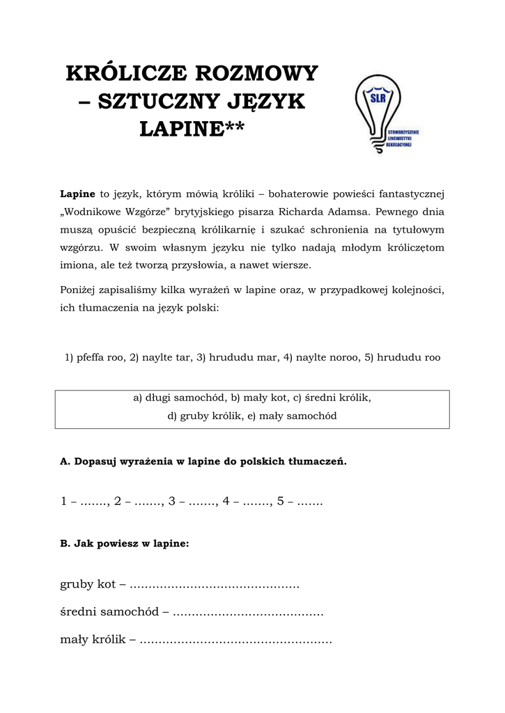 KRÓLICZE ROZMOWY – SZTUCZNY JĘZYK LAPINE** Lapine to język, którym mówią króliki – bohaterowie powieści fantastycznej „Wodnikowe Wzgórze” brytyjskiego pisarza Richarda Adamsa. Pewnego dnia muszą opuścić bezpieczną królikarnię i szukać schronienia na tytułowym wzgórzu. W swoim własnym języku nie tylko nadają młodym króliczętom imiona, ale też tworzą przysłowia, a nawet wiersze. Poniżej zapisaliśmy kilka wyrażeń w lapine oraz, w przypadkowej kolejności, ich tłumaczenia na język polski: 1) pfeffa roo, 2) naylte tar, 3) hrududu mar, 4) naylte noroo, 5) hrududu roo a) długi samochód, b) mały kot, c) średni królik, d) gruby królik, e) mały samochód A. Dopasuj wyrażenia w lapine do polskich tłumaczeń. 1 – ......., 2 – ......., 3 – ......., 4 – ......., 5 – ....... B. Jak powiesz w lapine: gruby kot – ............................................. średni samochód – ........................................ mały królik – ................................................... ROZWIĄZANIE 1-b, 2-d, 3-a, 4-c, 5-e gruby kot – pfeffa tar, średni samochód – hrududu noroo, mały królik – naylte roo Jak dopasować wyrażenia do tłumaczeń? Najlepiej zacząć od wyszukania i podkreślenia albo pokolorowania elementów, które się powtarzają. W wersji polskiej będą to: a) duży samochód, b) mały kot, c) średni królik, d) gruby królik, e) mały samochód A w lapine: 1) pfeffa roo, 2) naylte tar, 3) hrududu nos, 4) naylte noroo, 5) hrududu roo, Widać teraz, że jest tylko jedno wyrażenie, w którym zaznaczyliśmy oba słowa: 5) i e). Czyli hrududu roo to mały samochód, dopasowaliśmy 5-e. Teraz trzeba uważać, żeby nie wpaść w pułapkę! Które z tych dwóch słów oznacza mały, a które – samochód? Popatrzmy na inne słowo, które się powtarza – po polsku dwa razy pojawia się królik, a w lapine – naylte. Mamy następne dopasowane słowo, a na dodatek widzimy, że w lapine rzeczownik stoi na pierwszym miejscu: królik gruby, królik średni. Czyli hrududu roo to samochód + mały. Możemy jeszcze poszukać potwierdzenia. Obok jednego królika pojawia się bardzo podobne do słowa roo słowo noroo. Patrzymy, czy po polsku pojawia się przy króliku w takim razie jakieś słowo o podobnym znaczeniu, co mały. I rzeczywiście, mamy średniego królika. To daje następne dwa dopasowania: 4-c i 2-d. Skoro wiemy, że roo to mały, a hrududu – samochód, możemy dopasować też 1-b i 3-a. Mamy wtedy już wszystko!