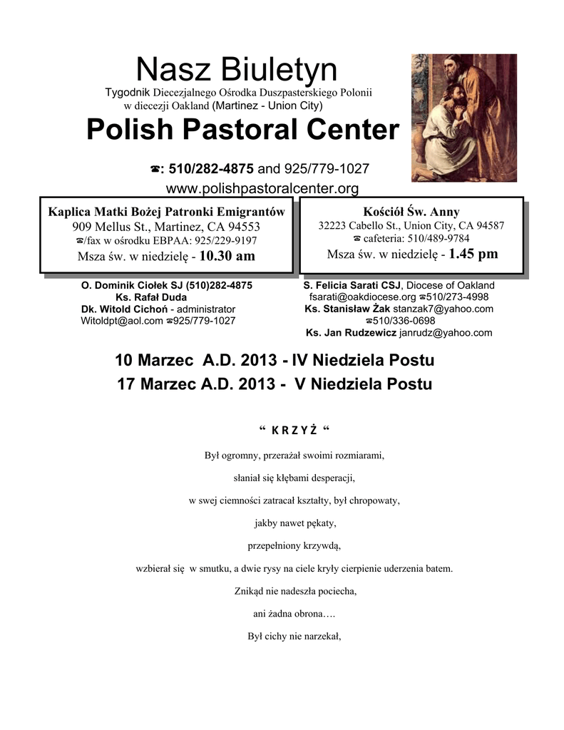 Nasz Biuletyn Tygodnik Diecezjalnego Ośrodka Duszpasterskiego Polonii w diecezji Oakland (Martinez - Union City) Polish Pastoral Center ?: 510/282-4875 and 925/779-1027 www.polishpastoralcenter.org Kaplica Matki Bożej Patronki Emigrantów 909 Mellus St., Martinez, CA 94553 ?/fax w ośrodku EBPAA: 925/229-9197 Msza św. w niedzielę - 10.30 am O. Dominik Ciołek SJ (510)282-4875 Ks. Rafał Duda Dk. Witold Cichoń - administrator [email protected] ?925/779-1027 Kościół Św. Anny 32223 Cabello St., Union City, CA 94587 ? cafeteria: 510/489-9784 Msza św. w niedzielę - 1.45 pm S. Felicia Sarati CSJ, Diocese of Oakland [email protected] ?510/273-4998 Ks. Stanisław Żak [email protected] ?510/336-0698 Ks. Jan Rudzewicz [email protected] 10 Marzec A.D. 2013 - IV Niedziela Postu 17 Marzec A.D. 2013 - V Niedziela Postu “ K R Z Y Ż “ Był ogromny, przerażał swoimi rozmiarami, słaniał się kłębami desperacji, w swej ciemności zatracał kształty, był chropowaty, jakby nawet pękaty, przepełniony krzywdą, wzbierał się w smutku, a dwie rysy na ciele kryły cierpienie uderzenia batem. Znikąd nie nadeszła pociecha, ani żadna obrona…. Był cichy nie narzekał, choć ciężar niedostatku, upokorzeń i płaczu….wykrzywił mu ramiona…. Cierpliwie znosił gorycz zawisłą na rogu, gdzie zgryzota wychodziła ponad jego brzegi. W samotności krwawił cierpkimi łzami żalu i niemocy, był nieufny, podejrzliwy z natury… lecz tej nocy, w bólu przełamania wyjęczał swoje skargi Bogu, zawierzył Mu wyboiste koleiny swego losu, oddał Mu dręczące kłopoty, rozterki, zniewagi…. odciążył swe nabrzmiałe barki i w ten to cudowny sposób poczuł się znowu lekki…..i powrócił do równowagi….. (Alicja Jęczmień, Kalifornia – marzec 2013) Kardynałowie modla się i prosza o modlitwę. Różaniec, adoracja Najświętszego Sakramentu oraz Nieszpory. Tak wyglądała 6 marca godzinna modlitwa Kolegium Kardynalskiego u grobu św. Piotra. Liturgii przewodniczył papieski wikariusz dla Watykanu kard. Angelo Comastri. „Była to oddolna inicjatywa – mówi o genezie tej modlitwy kard. Timothy Dolan z Nowego Jorku. – I muszę powiedzieć, że jedną z rzeczy, która najbardziej mi się podoba na tych kongregacjach generalnych, jest ich modlitewna atmosfera. Kiedy udajemy się do auli synodalnej mijamy małą kapliczkę z Najświętszym Sakramentem. I każdy bez wyjątku zatrzymuje się tam na chwilę modlitwy. Nasze obrady rozpoczynamy zawsze od przepięknej modlitwy Veni Sancte Spiritus, a kończymy Aniołem Pańskim. A wczoraj powiedzieliśmy sobie: czy nie byłoby dobrze spotkać w Bazylice Watykańskiej, w realnej obecności naszego Pana, przed Najświętszym Sakramentem?” – relacjonuje kard. Dolan. Wieczorna modlitwa kardynałów była otwarta dla wszystkich wiernych. Zdaniem prymasa Francji stanowiła ona również zaproszenie do intensywniejszej modlitwy za kardynałów. W tych dniach w sposób szczególny potrzebujemy waszej modlitwy – powiedział Radiu Watykańskiemu kard. Philippe Barbarin. „W pełni zdajemy sobie sprawę, że dziś wielu ludzi modli się za nas – powiedział metropolita Lyonu. – I prosimy, aby w tej modlitwie nie ustawali. Bardzo jesteśmy za to wdzięczni. Czeka nas bowiem trudna decyzja. Żyjemy w stresie. Jest to trudne i wymagające zadanie. Spoczywa na nas pewien ciężar i cieszymy się, że nie musimy go nieść sami. Wiemy, że wszyscy katolicy nam towarzyszą. Wszyscy, z Węgier, Japonii, Chile... Wiemy, że otacza nas modlitwa wielu ludzi. Dziękujemy za nią i prosimy o jej kontynuowanie...” – powiedział kard. Barbarin. W niedzielę 10 marca kardynałowie będą odprawiać Msze św. w intencji zbliżającego się konklawe i jego pomyślnego przebiegu w swych rzymskich kościołach tytularnych. 11 marca o godz. 17.30 w Kaplicy Paulińskiej nastapi ślubowanie o zachowaniu tajemnicy, ktore złoży personal pomocniczy kardynałówelektorów. We wtorek 12 marca przed południem, nastapi przemieszczenia się elektorów do Domu św. Marty. Ks. Lombardi oświadczył również, że w czasie piątkowej kongregacji poruszano takie zagadnienia jak dialog międzyreligijny, kultura a w sobotę, bioetyka, sprawiedliwość w świecie, radosne głoszenie Ewangelii i miłosierdzia. Mówiono też o kolegialności i o miejscu kobiet w Kościele. W tej ostatniej sprawie rzecznik watykański, nawiązując do przypadającego 8 marca Dnia Kobiet złożył życzenia wszystkim dziennikarkom obecnym w Rzymie. Włoski jezuita zaznaczył również, że do tej pory na portal „Adopt a cardinal” wpisało się ponad 220 tys. osób, którzy zobowiązali się w ten sposób do stałej modlitwy za wybranego przez siebie purpurata do czasu konklawe, w czasie jego trwania i przez kilka dni po jego zakończeniu. Poinformował, że przy obecnej liczbie 115 elektorów 2/3 głosów, wymaganych do wybrania papieża, wynosi 77. Przed rozpoczęciem konklawe wszyscy kardynałowie przejdą procesjonalnie ze swych pokoi w Domu św. Marty do Kaplicy Sykstyńskiej, gdzie m.in. będą mieli możność wyspowiadania się. Z Sponsorzy “Naszego Biuletynu” Z Ogłoszenia różne: Praca - Kupno - Sprzedaż - Usługi - Rozrywka- Informacje- Podziękowania . 25 Lutego 2013 odeszła od nas do życia w wieczności nasza parafianka ś.p. Stanisława Mleczko. Przeżyła 92 lata. Rodzinie zmarłej, pogrążonej w smutku i żałobie składamy wyrazy współczucia, zapewniając o pamięci modlitewnej . W okresie Wielkiego Postu o godz. 10:10 przed Niedzielną Mszą Św. mamy Nabożenstwo Gorzkich Żali. Zapraszamy wszystkich wiernych do uczestnictwa. . Na terenie Diecezji Oakland w czasie Wielkiego Postu obowiązuje zakaz spożywania pokarmów mięsnych w piątki. Przypominamy o podjęciu osobistego wysiłku nawrócenia, który może być wsparty osobistą formą postu i wstrzęmięźliwości. . Dnia 14 Marca ( czwartek) w Katedrze Chrystusa Swiatla w Oakland o godz. 7:00 pm