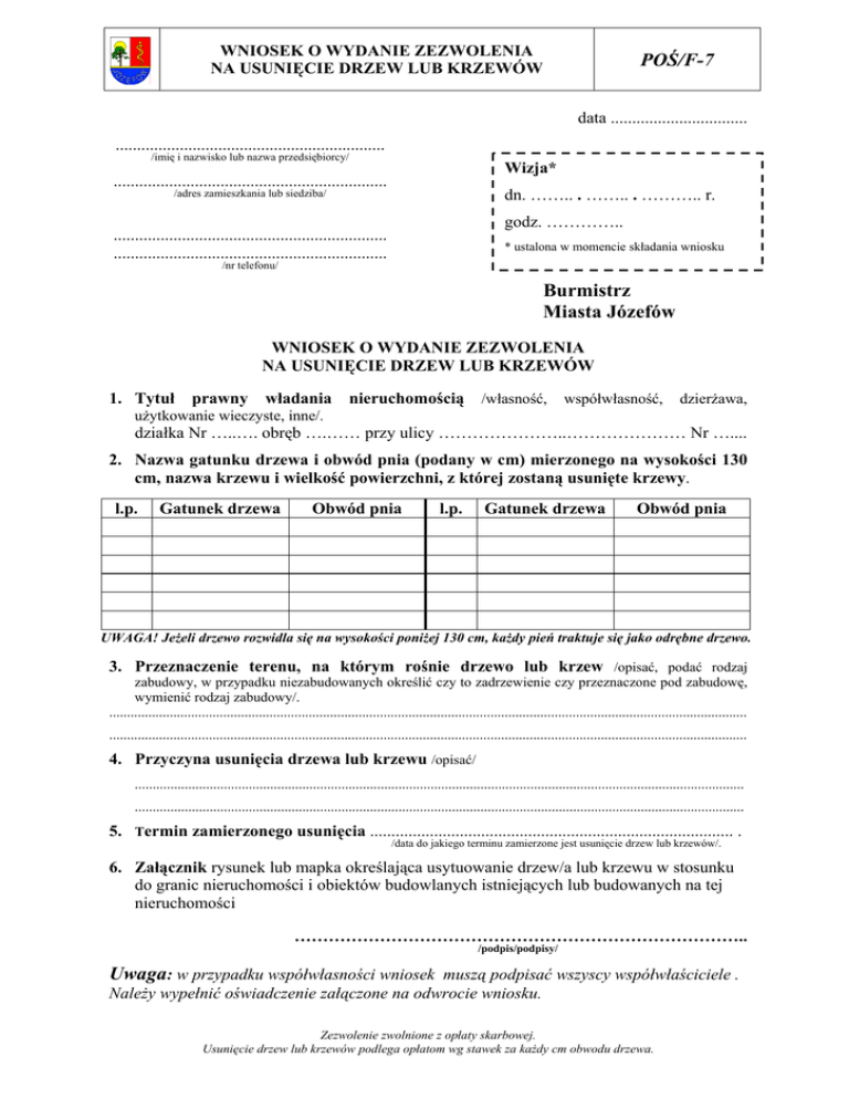 WNIOSEK O WYDANIE ZEZWOLENIA NA USUNIĘCIE DRZEW LUB KRZEWÓW POŚ/F-7 data ................................ ............................................................... /imię i nazwisko lub nazwa przedsiębiorcy/ Wizja* ................................................................ dn. …….. . …….. . ……….. r. /adres zamieszkania lub siedziba/ godz. ………….. ................................................................ ................................................................ * ustalona w momencie składania wniosku /nr telefonu/ Burmistrz Miasta Józefów WNIOSEK O WYDANIE ZEZWOLENIA NA USUNIĘCIE DRZEW LUB KRZEWÓW 1. Tytuł prawny władania nieruchomością /własność, współwłasność, dzierżawa, użytkowanie wieczyste, inne/. działka Nr …..…. obręb ….…… przy ulicy …………………..………………… Nr ….... 2. Nazwa gatunku drzewa i obwód pnia (podany w cm) mierzonego na wysokości 130 cm, nazwa krzewu i wielkość powierzchni, z której zostaną usunięte krzewy. l.p. Gatunek drzewa Obwód pnia l.p. Gatunek drzewa Obwód pnia UWAGA! Jeżeli drzewo rozwidla się na wysokości poniżej 130 cm, każdy pień traktuje się jako odrębne drzewo. 3. Przeznaczenie terenu, na którym rośnie drzewo lub krzew /opisać, podać rodzaj zabudowy, w przypadku niezabudowanych określić czy to zadrzewienie czy przeznaczone pod zabudowę, wymienić rodzaj zabudowy/. ................................................................................................................................................................................... ................................................................................................................................................................................... 4. Przyczyna usunięcia drzewa lub krzewu /opisać/ ........................................................................................................................................................................... ........................................................................................................................................................................... 5. Termin zamierzonego usunięcia ..................................................................................... . /data do jakiego terminu zamierzone jest usunięcie drzew lub krzewów/. 6. Załącznik rysunek lub mapka określająca usytuowanie drzew/a lub krzewu w stosunku do granic nieruchomości i obiektów budowlanych istniejących lub budowanych na tej nieruchomości …………………………………………………………………….. /podpis/podpisy/ Uwaga: w przypadku współwłasności wniosek muszą podpisać wszyscy współwłaściciele . Należy wypełnić oświadczenie załączone na odwrocie wniosku. Zezwolenie zwolnione z opłaty skarbowej. Usunięcie drzew lub krzewów podlega opłatom wg stawek za każdy cm obwodu drzewa. WNIOSEK O WYDANIE ZEZWOLENIA NA USUNIĘCIE DRZEW LUB KRZEWÓW POŚ/F-7 -2_____________________________________________________________________________________ Przedsiębiorca – art. 2 i art. 4 ust. 1 ustawy z dnia 2 lipca 2004 r. o swobodzie działalności gospodarczej (Dz. U. Nr 173, poz. 1807).. Oświadczenie Oświadczam , że jestem / nie jestem przedsiębiorcą*. Prowadzę działalność gospodarczą jako **: - osoba fizyczna /wspólnicy spółki cywilnej/ .............................................................................................. /organ i numer wpisu do ewidencji działalności gospodarczej/ - osoba prawna ............................................................................................................................................. - niemająca osobowości prawnej spółka prawa handlowego ...................................................................... /dokument potwierdzający wpis do Krajowego Rejestru Sądowego/ .................................................................................................................................................................... /dokument potwierdzający wpis do Krajowego Rejestru Sądowego/ Świadomy /a/ odpowiedzialności karnej za podanie w niniejszym oświadczeniu nieprawdy – zgodnie z art. 233 k. k., potwierdzam własnoręcznym podpisem prawdziwość danych zamieszczonych powyżej. Art. 233 § 1 Kodeksu Karnego - kto, składając zeznanie mające służyć za dowód w postępowaniu sądowym lub w innym postępowaniu prowadzonym na podstawie ustawy, zeznaje nieprawdę lub zataja prawdę, podlega karze pozbawienia wolności do lat 3. ................................................................ /miejscowość, data/ .......................................... /podpis/ _____________________________________________________________________________________ * niepotrzebne skreślić ** wypełnić, jeżeli dotyczy Zezwolenie zwolnione z opłaty skarbowej. Usunięcie drzew lub krzewów podlega opłatom wg stawek za każdy cm obwodu drzewa.