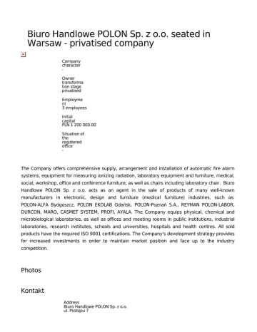 Biuro Handlowe POLON Sp. z o.o. seated in Warsaw - privatised company Company character Owner transforma tion stage privatised Employme nt 3 employees Initial capital PLN 1 200 000.00 Situation of the registered office - The Company offers comprehensive supply, arrangement and installation of automatic fire alarm systems, equipment for measuring ionizing radiation, laboratory equipment and furniture, medical, social, workshop, office and conference furniture, as well as chairs including laboratory chair. Biuro Handlowe POLON Sp. z o.o. acts as an agent in the sale of products of many well-known manufacturers in electronic, design and furniture (medical furniture) industries, such as: POLON-ALFA Bydgoszcz, POLON EKOLAB Gdańsk, POLON-Poznań S.A., REYMAN POLON-LABOR, DURCON, MARO, CASMET SYSTEM, PROFI, AYALA. The Company equips physical, chemical and microbiological laboratories, as well as offices and meeting rooms in public institutions, industrial laboratories, research institutes, schools and universities, hospitals and health centres. All sold products have the required ISO 9001 certifications. The Company's development strategy provides for increased investments in order to maintain market position and face up to the industry competition. Photos Kontakt Address Biuro Handlowe POLON Sp. z o.o. ul. Postępu 7 02-676 Warszw tel.: (+48 22) 847 88 70 www.bhpolon.pl Ministry of the Treasury ul. Krucza 36 / Wspólna 6 00-522 Warsaw Department of Privatisation tel.: (+48 22) 695 87 22, 695 87 05 fax: (+48 22) 695 88 18 Investor Relations Centre tel.: (+48 22) 695 90 01 tel.: (+48 22) 695 90 02 fax: (+48 22) 629 98 38 [email protected] www.msp.gov.pl City Province mazowieckie www Email Telephone - The information below does not constitute any invitation or offer to sell, invest in or trade, nor does it constitute any invitation to place any offer to purchase, invest in or trade the securities. The information presented herein is up to date as on the date of publication. For more information, please contact, tel: (+48 22) 695 90 01-02, e-mail: [email protected].