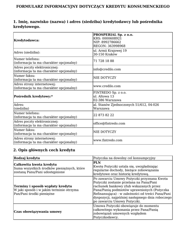 FORMULARZ INFORMACYJNY DOTYCZĄCY KREDYTU KONSUMENCKIEGO 1. Imię, nazwisko (nazwa) i adres (siedziba) kredytodawcy lub pośrednika kredytowego. Kredytodawca: Adres (siedziba): Numer telefonu: (informacja ta ma charakter opcjonalny) Adres poczty elektronicznej: (informacja ta ma charakter opcjonalny) Numer faksu: (informacja ta ma charakter opcjonalny) Adres strony internetowej: (informacja ta ma charakter opcjonalny) Pośrednik kredytowy:* Adres: (siedziba) Numer telefonu: (informacja ta ma charakter opcjonalny) Adres poczty elektronicznej: (informacja ta ma charakter opcjonalny) Numer faksu: (informacja ta ma charakter opcjonalny) Adres strony internetowej: (informacja ta ma charakter opcjonalny) PROSPERIAL Sp. z o.o. KRS: 0000608921 NIP: 8992786662 REGON: 363998968 ul. Armii Krajowej 19 30-150 Kraków 71 728 18 88 [email protected] NIE DOTYCZY www.credilo.com FINTREDO Sp. z o.o. ul. Altowa 13 02-386 Warszawa al. Stanów Zjednoczonych 51/612, 04-026 Warszawa 22 873 82 22 [email protected] NIE DOTYCZY www.fintredo.com 2. Opis głównych cech kredytu Rodzaj kredytu Całkowita kwota kredytu Suma wszystkich środków pieniężnych, które zostaną Panu/Pani udostępnione Terminy i sposób wypłaty kredytu W jaki sposób i w jakim terminie otrzyma Pan/Pani środki pieniężne Czas obowiązywania umowy Pożyczka na dowolny cel konsumpcyjny PLN Kwotę Pożyczki ustala się, uwzględniając regularne dochody, bieżące zobowiązania kredytowe oraz historię kredytową. Po zawarciu Umowy Pożyczki przyznana Kwota Pożyczki zostanie przelana na Pana/Pani rachunek bankowy i/lub wskazanych przez Pana/Panią podmiotów uprawnionych (Pożyczka Refinansująca) - w zależności od treści Pana/Pani dyspozycji, najpóźniej następnego dnia roboczego po zawarciu Umowy Pożyczki. Umowa Pożyczki obowiązuje do momentu całkowitego wykonania przez Pana/Panią zobowiązań umownych względem Pożyczkodawcy. Zasady i terminy spłaty kredytu W przypadku udzielenia Pożyczki, będzie Pan/Pani zobowiązany/a do zwrotu Pożyczki wraz z wszelkimi opłatami i Prowizjami w łącznej kwocie 0 zł w terminie spłaty Pożyczki, tj. do dnia . Każda kwota zapłacona przez Pana/Panią Pośrednikowi będzie zaliczana kolejno na poczet: 1) Odsetek za nieterminową płatność pożyczki; 2) Odsetek (kapitałowych); 3) Prowizji; 4) Kwoty Pożyczki. Termin zwrotu Pożyczki Całkowita kwota do zapłaty przez konsumenta Jest to suma wszystkich środków pieniężnych, które kredytodawca udostępnia Panu/Pani oraz wszelkie koszty, które zobowiązany/a będzie Pan/Pani ponieść w związku z umową o kredyt Kredyt wiązany lub w formie odroczonej płatności* – opis towaru lub usługi: – cena: Wymagane zabezpieczenia kredytu* Zabezpieczenie jakie będzie Pan/Pani musiał/a przedstawić w związku z umową o kredyt Informacja czy umowa o kredyt przewiduje gwarancję spłaty całkowitej kwoty kredytu wypłaconej na jej podstawie* Jeżeli zgodnie z postanowieniami umowy o kredyt, płatności dokonywane przez Pana/Panią nie są zaliczane do spłaty całkowitej kwoty kredytu, ale będą wykorzystywane do zgromadzenia kapitału przez okresy i na zasadach określonych w umowie o kredyt lub w umowie dodatkowej, to umowa o kredyt nie przewiduje gwarancji spłaty całkowitej kwoty kredytu wypłaconej na jej podstawie 3. Koszty kredytu Całkowita kwota Pożyczki (Kwota do Spłaty: zł) Prowizja: zł Odsetki: zł NIE DOTYCZY NIE DOTYCZY NIE DOTYCZY Stopa oprocentowania kredytu: 0% Roczna stopa oprocentowania Pożyczki (RSO) jest stała w okresie obowiązywania Umowy Pożyczki. Wysokość RSO Pożyczki ulega obniżeniu do aktualnej wysokości stopy odsetek maksymalnych w przypadku obniżenia wysokości stopy odsetek maksymalnych, określonych w art. 359 § 21 Kodeksu cywilnego poniżej aktualnej wysokości RSO Pożyczki. W przypadku późniejszego Stopa oprocentowania kredytu oraz warunki podwyższenia wysokości stopy odsetek jej zmiany maksymalnych wysokość RSO Pożyczki niezwłocznie powraca do swej pierwotnej wysokości, jednakże nie więcej niż do aktualnej wysokości stopy odsetek maksymalnych. Informacja o zmianie RSO i jej nowa wysokość zostanie przekazana Panu/Pani na adres e-mail i na Koncie, na trwałym nośniku pozwalającym na jego zapisanie lub wydrukowanie, lub za pośrednictwem poczty. RRSO = % Rzeczywista roczna stopa oprocentowania Jest to całkowity koszt kredytu ponoszony przez konsumenta, wyrażony jako wartość procentowa całkowitej kwoty kredytu w stosunku rocznym przedstawiona aby pomóc Panu/Pani w porównaniu oferowanych kredytów Obowiązek zawarcia umowy dodatkowej Do uzyskania kredytu konieczne jest zawarcie przez Pana/Panią umowy dodatkowej, w szczególności umowy ubezpieczenia lub innej umowy Założenia przyjęte do obliczenia Rzeczywistej Rocznej Stopy Opro-centowania (RRSO) • Kwota Pożyczki: zł • Stopa oprocentowania Pożyczki: % • Prowizja: zł • Okres Pożyczki: dni • Spłata jednorazowa (1 rata) • Kwota Pożyczki jest wpłacana natychmiast i w całości. NIE DOTYCZY Opłata rejestracyjna = 0,00 zł (weryfikacja Koszty, które zobowiązany/a będzie Pan/Pani klienta) Prowizja: zł ponieść w związku z umową o kredyt* Odsetki = zł Koszty prowadzenia jednego lub kilku rachunków w celu dokonywania wpłat i wypłat środ-ków NIE DOTYCZY pieniężnych* Koszty korzystania z kart kredytowych* NIE DOTYCZY Opłata rejestracyjna (w wysokości 1,00 PLN – w przypadku wybrania przez Pana/Panią dostępnego na stronie pośrednika kredytowego Systemu „Przelewy24”) pobierana jest przez Inne koszty, które konsument zobowiązany jest pośrednika kredytowego jednorazowo, przy ponieść w związku z umową* rejestracji na stronie internetowej pośrednika kredytowego. Rejestracja jest wymagana, aby otrzymać pierwszą pożyczkę i nie musi być powtarzana przy kolejnych pożyczkach. Niniejsza opłata podlega zwrotowi. Warunki, na jakich koszty związane z umową o kredyt mogą uleg