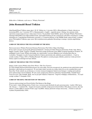gimsedziszow.pl Tolkien Jakub Lorenc (U) Kilka słów o Tolkienie, czyli rzecz o "Władcy Pierścieni". John Romuald Reuel Tolkien John Ronald Reuel Tolkien znany jako J. R. R. Tolkien (ur. 4 stycznia 1892 w Bloemfontein w Oranii, obecnie na terytorium RPA, zm. 5 września 1973 w Bournemouth w Anglii) – angielski pisarz i filolog. Jest autorem wielu opowieści rozgrywających się w mitycznym świecie. Na przykład- baśni Hobbit, eposu (Trylogii) Władca Pierścieni i mitologii Silmarillion oraz kilku krótkich form, opowiadań baśniowych nie związanych, lub luźno związanych z wielką mitologią tzw. Legendarium Śródziemia (zawartej w 12-tomowej History of the Middle-Earth, opracowanej i wydanej przez Christophera Tolkiena, jego syna). Był on prekursorem gantunku literackiego zwanego z języka angielskiego fantasy. LORD OF THE RINGS THE FELLOWSHIP OF THE RING Pierwszym tom to Władca Pierścieni Drużyna Pierścienia (The Fellow Ship of the Ring). W tej części zaczyna się przygoda głównych bohaterów. Zostaje powołana Drużyna pierścienia: Frodo, Sam, Merry, Pippin, Legolas, Gimli, Aragorn i Gandlaf. Pierścień zostaje przekazany przez Bilba swojemu bratankowi Frodowi. W niedługim czasie Czarny Władca dowiaduje się o pierścieniu i zaczyna odbudowywać twierdzę Bara-Dur na wschodzie. Następnie wysyła Czarnych jeźdźców (Upiory pierścienia) aby odebrały go powiernikowi... Część ta została wydana 19 lipca 1954 w Wielkiej Brytanii. Początkowo została przyjęta chłodno, ponieważ wtedy powieści fantasy oparte na mitologii nie były lubiane. LORD OF THE RINGS THE TWO TOWERS Drugą z kolei częścią Władcy były Dwie Wieże (The Two Towers). W części drugiej drużyna pierścienia posuwa się coraz dalej. Zaczyna rozsypywać się, ponieważ moc pierścienia mami Boromira i sprowadza go na manowce. W tym tomie rónież zaczyna się wojna, która trwa aż do ostatniej bitwy pod Bara-Dur. Frodo odziela się od drużyny ze swoim wiernym kompanem Samwissem Gamgee i wędruje prowadzony przez pokracznego stwora Golluma. W tym czasie zostaje przez Drzewce pokonany Saruman Biały. Gandalf Szary wraca do życia jako Gandalf Biały. Jest on już pół-Valarem (Valarowie - bogowie władający śródziemiem)... Ta część zostaje wydana 11 listopada 1954r. LORD OF THE RING THE RETURN OF THE KING Trzecią częścią trylogii jest Powrót Króla (The Return of the King). W tej części wojna dobiega końca. Frodo wraz z towarzyszami dochodzi do góry przeznaczenia. Ludzie i Elfy łączą siły wlacząc z wojskami Zła. Aragorn do tej pory strażnik zostaje prawowitym królem. Elfy płyną za morze, aby tam umrzeć. Z nimi odpływa również Frodo i jego wuj Bilbo. Jedyny pierścień zostaje zniszczony... Z kolei ta część jest wydana 20 pażdziernika 1995r. strona 1 / 1